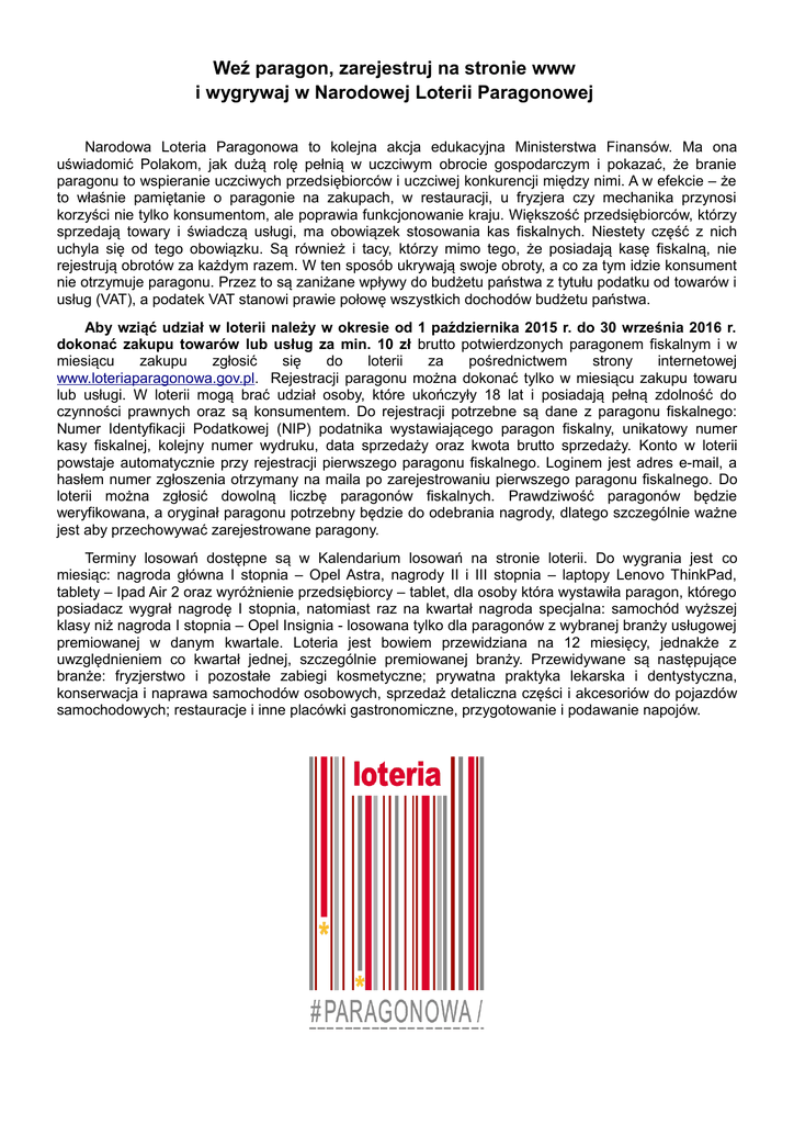Weź paragon, zarejestruj na stronie www i wygrywaj w Narodowej Loterii Paragonowej Narodowa Loteria Paragonowa to kolejna akcja edukacyjna Ministerstwa Finansów. Ma ona uświadomić Polakom, jak dużą rolę pełnią w uczciwym obrocie gospodarczym i pokazać, że branie paragonu to wspieranie uczciwych przedsiębiorców i uczciwej konkurencji między nimi. A w efekcie – że to właśnie pamiętanie o paragonie na zakupach, w restauracji, u fryzjera czy mechanika przynosi korzyści nie tylko konsumentom, ale poprawia funkcjonowanie kraju. Większość przedsiębiorców, którzy sprzedają towary i świadczą usługi, ma obowiązek stosowania kas fiskalnych. Niestety część z nich uchyla się od tego obowiązku. Są również i tacy, którzy mimo tego, że posiadają kasę fiskalną, nie rejestrują obrotów za każdym razem. W ten sposób ukrywają swoje obroty, a co za tym idzie konsument nie otrzymuje paragonu. Przez to są zaniżane wpływy do budżetu państwa z tytułu podatku od towarów i usług (VAT), a podatek VAT stanowi prawie połowę wszystkich dochodów budżetu państwa. Aby wziąć udział w loterii należy w okresie od 1 października 2015 r. do 30 września 2016 r. dokonać zakupu towarów lub usług za min. 10 zł brutto potwierdzonych paragonem fiskalnym i w miesiącu zakupu zgłosić się do loterii za pośrednictwem strony internetowej www.loteriaparagonowa.gov.pl. Rejestracji paragonu można dokonać tylko w miesiącu zakupu towaru lub usługi. W loterii mogą brać udział osoby, które ukończyły 18 lat i posiadają pełną zdolność do czynności prawnych oraz są konsumentem. Do rejestracji potrzebne są dane z paragonu fiskalnego: Numer Identyfikacji Podatkowej (NIP) podatnika wystawiającego paragon fiskalny, unikatowy numer kasy fiskalnej, kolejny numer wydruku, data sprzedaży oraz kwota brutto sprzedaży. Konto w loterii powstaje automatycznie przy rejestracji pierwszego paragonu fiskalnego. Loginem jest adres e-mail, a hasłem numer zgłoszenia otrzymany na maila po zarejestrowaniu pierwszego paragonu fiskalnego. Do loterii można zgłosić dowolną liczbę paragonów fiskalnych. Prawdziwość paragonów będzie weryfikowana, a oryginał paragonu potrzebny będzie do odebrania nagrody, dlatego szczególnie ważne jest aby przechowywać zarejestrowane paragony. Terminy losowań dostępne są w Kalendarium losowań na stronie loterii. Do wygrania jest co miesiąc: nagroda główna I stopnia – Opel Astra, nagrody II i III stopnia – laptopy Lenovo ThinkPad, tablety – Ipad Air 2 oraz wyróżnienie przedsiębiorcy – tablet, dla osoby która wystawiła paragon, którego posiadacz wygrał nagrodę I stopnia, natomiast raz na kwartał nagroda specjalna: samochód wyższej klasy niż nagroda I stopnia – Opel Insignia - losowana tylko dla paragonów z wybranej branży usługowej premiowanej w danym kwartale. Loteria jest bowiem przewidziana na 12 miesięcy, jednakże z uwzględnieniem co kwartał jednej, szczególnie premiowanej branży. Przewidywane są następujące branże: fryzjerstwo i pozostałe zabiegi kosmetyczne; prywatna praktyka lekarska i dentystyczna, konserwacja i naprawa samochodów osobowych, sprzedaż detaliczna części i akcesoriów do pojazdów samochodowych; restauracje i inne placówki gastronomiczne, przygotowanie i podawanie napojów.