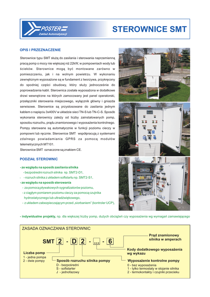 STEROWNICE SMT OPIS I PRZEZNACZENIE Sterownice typu SMT służą do zasilania i sterowania naprzemienną pracą pomp o mocy nie większej niż 22kW, w pompowniach wody lub ścieków. Sterownice mogą być montowane zarówno w pomieszczeniu, jak i na wolnym powietrzu. W wykonaniu zewnętrznym wyposażone są w fundament z tworzywa, przykręcony do spodniej części obudowy, który służy jednocześnie do poprowadzenia kabli. Sterownica została wyposażona w dodatkowe drzwi wewnętrzne na których zamocowany jest panel operatorski, przełączniki sterowania miejscowego, wyłącznik główny i gniazda serwisowe. Sterownice są przystosowane do zasilania jednym kablem o napięciu 3x400V w układzie sieci TN-S lub TN-C-S. Sposób wykonania sterownicy zależy od liczby zainstalowanych pomp, sposobu rozruchu, prądu znamionowego i wyposażenia kontrolnego. Pompy sterowane są automatycznie w funkcji poziomu cieczy w pompowni lub ręcznie. Sterownice SMT współpracują z systemami zdalnego powiadamiania GPRS za pomocą modułów telemetrycznych MT101. Sterownice SMT oznaczone są znakiem CE. PODZIAŁ STEROWNIC - ze względu na sposób zasilania silnika - bezpośredni rozruch silnika np. SMT2-D1, l - rozruch silnika z układem softstartu np. SMT2-S1, - ze względu na sposób sterowania - za pomocą pływakowych sygnalizatorów poziomu, - z ciągłym pomiarem poziomu cieczy za pomocą czujnika hydrostatycznego lub ultradźwiękowego, - z układem zabezpieczającym przed „siorbaniem” (kontroler UCP), - indywidualne projekty, np. dla większej liczby pomp, dużych obciążeń czy wyposażenia wg wymagań zamawiającego ZASADA OZNACZANIA STEROWNIC SMT 2 - D 2 - ... - 6 Kody dodatkowego wyposażenia wg wykazu Liczba pomp 1 - jedna pompa 2 - dwie pompy Prąd znamionowy silnika w amperach Sposób rozruchu silnika pompy Wyposażenie kontrolne pompy D - bezpośredni S - softstarter J - jednofazowy 0 - bez wyposażenia 1 - tylko termostaty w stojanie silnika 2 - termokontakty i czujniki przecieku WYPOSAŻENIE PODSTAWOWE WYPOSAŻENIE DODATKOWE - obudowa z poliestru, dodatkowe drzwi wewnętrzne, IP66, - wyłącznik główny, - wyłącznik różnicowo-prądowy, - przekaźnik kontroli symetrii napięć zasilających, - wyłączniki samoczynne silników, - układy rozruchowe (gwiazda-trójkąt lub softstartery), - zasilacz buforowy 24V DC - sterownik przemysłowy MT101, z zintegrowanym modemem GPRS, połączony z panelem operatorskim, - licznik godzin pracy każdej pompy (realizuje sterownik), - licznik ilości załączeń każdej pompy (realizuje sterownik), - zabezpieczenie przed jednoczesnym włączeniem wszystkich pomp, - przełącznik rodzaju pracy A-STOP-R, - przyciski START dla każdej z pomp, - naprzemienna kolejność włączania pomp, - zabezpieczenie pomp przed suchobiegiem, - kontrola wysokiego poziomu wody lub ścieków, - ogrzewanie wnętrza sterownicy, - gniazdo robocze 230V/6A. - sygnalizator optyczny zbiorczej awarii 050 - zabezpieczenie przeciwprzepięciowe typu II, 051 - zabezpieczenie przeciwprzepięciowe typu I + II, 052 - zabezpieczenie przeciwprzepięciowe typu III, 054 - gniazdo robocze 400V/16A, 055 - gniazdo robocze 24V/2A, 056 - układ UCP (układ czyszczenia pompowni), 057- elektromechaniczne liczniki godzin pracy, 058 - pomiar prądu obciążenia w jednej fazie, 059 - pomiar napięcia (analogowy woltomierz), 068 - sygnalizator optyczno akustyczny, 075 - gniazdo zasilania rezerwowego 16A/32A oraz przełącznik sieć / agregat (do awaryjnego zasilania 1 pompy), 076 - system GSM/SMS do powiadamiania o sytuacjach awaryjnych, 077 - sonda hydrostatyczna do ciągłego pomiaru poziomu ścieków, 079 - pływakowe sygnalizatory poziomu, 080 - armatura zawieszeniowa z obciążnikiem do mocowania sygnalizatorów poziomu i sondy, 082 - fundament betonowy, 083 - fundament z tworzywa o wys. 0,5m; 0,75m; 1m, 084 - oświetlenie wnętrza sterownicy, 085 - czujnik zmierzchowy z wyłącznikiem oświetlenia terenu, 086 - czujnik otwarcia włazu pompowni, 088 - zabudowa przetwornika przepływomierza w szafie, - inne wyposażenie wg wymagań zamawiającego. WYMIARY ZEWNĘTRZNE STEROWNIC SMT1-D_ SMT2-D_ 600 400 230 1000 400 230 SMT2-D_ SMT2-S_ 800 600 300 1300 600 300 SMT2-S_ (22kW) 800 1200 300 1300 1200 300 Autoryzowany dystrybutor: