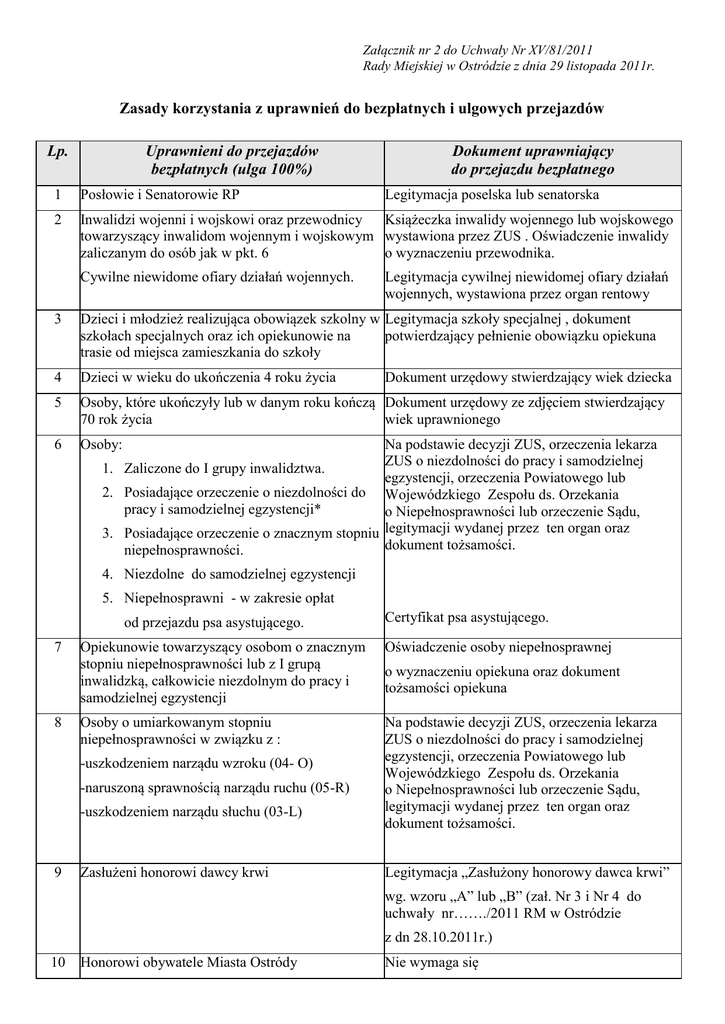 Załącznik nr 2 do Uchwały Nr XV/81/2011 Rady Miejskiej w Ostródzie z dnia 29 listopada 2011r. Zasady korzystania z uprawnień do bezpłatnych i ulgowych przejazdów Uprawnieni do przejazdów bezpłatnych (ulga 100%) Lp. Dokument uprawniający do przejazdu bezpłatnego 1 Posłowie i Senatorowie RP 2 Inwalidzi wojenni i wojskowi oraz przewodnicy Książeczka inwalidy wojennego lub wojskowego towarzyszący inwalidom wojennym i wojskowym wystawiona przez ZUS . Oświadczenie inwalidy zaliczanym do osób jak w pkt. 6 o wyznaczeniu przewodnika. Cywilne niewidome ofiary działań wojennych. Legitymacja poselska lub senatorska Legitymacja cywilnej niewidomej ofiary działań wojennych, wystawiona przez organ rentowy 3 Dzieci i młodzież realizująca obowiązek szkolny w Legitymacja szkoły specjalnej , dokument szkołach specjalnych oraz ich opiekunowie na potwierdzający pełnienie obowiązku opiekuna trasie od miejsca zamieszkania do szkoły 4 Dzieci w wieku do ukończenia 4 roku życia 5 Osoby, które ukończyły lub w danym roku kończą Dokument urzędowy ze zdjęciem stwierdzający 70 rok życia wiek uprawnionego 6 Osoby: Dokument urzędowy stwierdzający wiek dziecka Na podstawie decyzji ZUS, orzeczenia lekarza ZUS o niezdolności do pracy i samodzielnej 1. Zaliczone do I grupy inwalidztwa. egzystencji, orzeczenia Powiatowego lub 2. Posiadające orzeczenie o niezdolności do Wojewódzkiego Zespołu ds. Orzekania pracy i samodzielnej egzystencji* o Niepełnosprawności lub orzeczenie Sądu, 3. Posiadające orzeczenie o znacznym stopniu legitymacji wydanej przez ten organ oraz dokument tożsamości. niepełnosprawności. 4. Niezdolne do samodzielnej egzystencji 5. Niepełnosprawni - w zakresie opłat od przejazdu psa asystującego. 7 8 Opiekunowie towarzyszący osobom o znacznym stopniu niepełnosprawności lub z I grupą inwalidzką, całkowicie niezdolnym do pracy i samodzielnej egzystencji Oświadczenie osoby niepełnosprawnej Osoby o umiarkowanym stopniu niepełnosprawności w związku z : Na podstawie decyzji ZUS, orzeczenia lekarza ZUS o niezdolności do pracy i samodzielnej egzystencji, orzeczenia Powiatowego lub Wojewódzkiego Zespołu ds. Orzekania o Niepełnosprawności lub orzeczenie Sądu, legitymacji wydanej przez ten organ oraz dokument tożsamości. -uszkodzeniem narządu wzroku (04- O) -naruszoną sprawnością narządu ruchu (05-R) -uszkodzeniem narządu słuchu (03-L) 9 Certyfikat psa asystującego. Zasłużeni honorowi dawcy krwi o wyznaczeniu opiekuna oraz dokument tożsamości opiekuna Legitymacja „Zasłużony honorowy dawca krwi” wg. wzoru „A” lub „B” (zał. Nr 3 i Nr 4 do uchwały nr……./2011 RM w Ostródzie z dn 28.10.2011r.) 10 Honorowi obywatele Miasta Ostródy Nie wymaga się Uprawnieni do przejazdów bezpłatnych (ulga 100%) Lp. 11 Umundurowani funkcjonariusze policji, straży miejskiej i żandarmerii wojskowej w czasie pełnienia przez nich obowiązków służbowych Dokument uprawniający do przejazdu bezpłatnego Legitymacja służbowa Pasażer korzystający z przejazdu bezpłatnego oraz pasażer korzystający z biletu ulgowego jest zobowiązany posiadać przy sobie i okazać na żądanie kontroli biletowej dokument uprawniający do takiego przejazdu. Pasażer ma prawo żądać od kontrolera okazania uprawnień do prowadzenia kontroli (legitymacja ze zdjęciem i numerem służbowym). Kontroler ma prawo do nałożenie opłaty kredytowej na pasażera popełniającego wykroczenie taryfowe. Wręcza wówczas pasażerowi odpowiedni wypełniony druk opłaty specjalnej potwierdzony swoim numerem służbowym i podpisem. * Osobą niezdolną do samodzielnej egzystencji jest osoba całkowicie niezdolna do pracy oraz niezdolna do samodzielnej egzystencji (w rozumieniu przepisów o emeryturach i rentach z Funduszu Ubezpieczeń Społecznych) albo posiadająca znaczny stopień niepełnosprawności (w rozumieniu przepisów o rehabilitacji zawodowej, społecznej oraz zatrudnianiu osób niepełnosprawnych) bądź inwalidzi I grupy, jeżeli orzeczenie o zaliczeniu do I grupy inwalidzkiej nie utraciło mocy. Lp. 1 Uprawnieni do przejazdów ulgowych Dzieci w wieku powyżej 4 lat do ukończenia 7 roku życia Dokument uprawniający do przejazdu ulgowego Dokument urzędowy stwierdzający wiek dziecka 2 Uczniowie dziennych szkół podstawowych, gimnazjalnych i ponadgimnazjalnych Legitymacja szkolna 3 Dzieci i młodzież dotknięte inwalidztwem lub niepełnosprawne do ukończenia 24 roku życia Legitymacja szkolna lub legitymacja osoby niepełnosprawnej 4 Studenci Legitymacja studencka 5 Emeryci i renciści w wieku powyżej (60 kobiety, 65 lat mężczyźni) Decyzja emerytalna lub rentowa wydana przez jednostkę ds. rent lub emerytur oraz dowód osobisty 6 Kombatanci i inne osoby uprawnione na podstawie przepisów o kombatantach Zaświadczenie lub legitymacja wydana przez Urząd do Spraw Kombatantów i Osób Represjonowanych Pasażer korzystający z przejazdu bezpłatnego oraz pasażer korzystający z biletu ulgowego jest zobowiązany posiadać przy sobie i okazać na żądanie kontroli biletowej dokument uprawniający do takiego przejazdu. Pasażer ma prawo żądać od kontrolera okazania uprawnień do prowadzenia kontroli (legitymacja ze zdjęciem i numerem służbowym). Kontroler ma prawo nałożenie opłaty kredytowej na pasażera popełniającego wykroczenie taryfowe. Wręcza wówczas pasażerowi odpowiedni wypełniony druk opłaty specjalnej potwierdzony swoim numerem służbowym i podpisem.