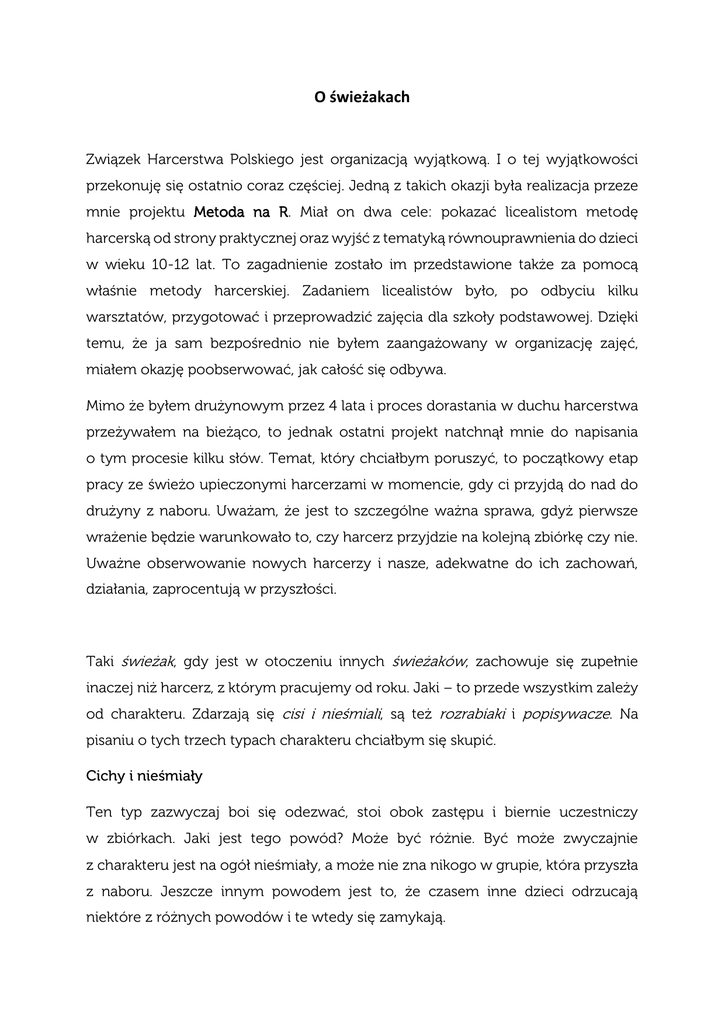 O świeżakach Związek Harcerstwa Polskiego jest organizacją wyjątkową. I o tej wyjątkowości przekonuję się ostatnio coraz częściej. Jedną z takich okazji była realizacja przeze mnie projektu Metoda na R. Miał on dwa cele: pokazać licealistom metodę harcerską od strony praktycznej oraz wyjść z tematyką równouprawnienia do dzieci w wieku 10-12 lat. To zagadnienie zostało im przedstawione także za pomocą właśnie metody harcerskiej. Zadaniem licealistów było, po odbyciu kilku warsztatów, przygotować i przeprowadzić zajęcia dla szkoły podstawowej. Dzięki temu, że ja sam bezpośrednio nie byłem zaangażowany w organizację zajęć, miałem okazję poobserwować, jak całość się odbywa. Mimo że byłem drużynowym przez 4 lata i proces dorastania w duchu harcerstwa przeżywałem na bieżąco, to jednak ostatni projekt natchnął mnie do napisania o tym procesie kilku słów. Temat, który chciałbym poruszyć, to początkowy etap pracy ze świeżo upieczonymi harcerzami w momencie, gdy ci przyjdą do nad do drużyny z naboru. Uważam, że jest to szczególne ważna sprawa, gdyż pierwsze wrażenie będzie warunkowało to, czy harcerz przyjdzie na kolejną zbiórkę czy nie. Uważne obserwowanie nowych harcerzy i nasze, adekwatne do ich zachowań, działania, zaprocentują w przyszłości. Taki świeżak, gdy jest w otoczeniu innych świeżaków, zachowuje się zupełnie inaczej niż harcerz, z którym pracujemy od roku. Jaki – to przede wszystkim zależy od charakteru. Zdarzają się cisi i nieśmiali, są też rozrabiaki i popisywacze. Na pisaniu o tych trzech typach charakteru chciałbym się skupić. Cichy i nieśmiały Ten typ zazwyczaj boi się odezwać, stoi obok zastępu i biernie uczestniczy w zbiórkach. Jaki jest tego powód? Może być różnie. Być może zwyczajnie z charakteru jest na ogół nieśmiały, a może nie zna nikogo w grupie, która przyszła z naboru. Jeszcze innym powodem jest to, że czasem inne dzieci odrzucają niektóre z różnych powodów i te wtedy się zamykają. Co możesz zrobić? Przede wszystkim porozmawiaj ze swoim nowym wychowankiem. Być może jest jakaś konkretna przyczyna, przez którą zachowuje się tak, a nie inaczej, który można rozwiązać jednym ruchem. Przykład: harcerz nie chce być w zastępie, w którym się znalazł. Woli być np. w zastępie Lwów zamiast Orłów, bo nikogo z Orłów nie zna i nie dogaduje się z nimi. Jeśli jednak problem jest bardziej rozbudowany – powinniśmy to wywnioskować z rozmowy i na podstawie zdobytych informacji później z nim pracować. Niestety rozwiązanie zależy od indywidualnego problemu, więc nie istnieje jednoznaczna odpowiedź na pytanie jak to robić?. Należy pamiętać jednak, by traktować tak jak pozostałych (wtedy i inne dzieci zobaczą, że należy go traktować zwyczajnie). Poza tym warto dać mu przestrzeń do wykazania się w jakichś zadaniach, wypowiedziach itp. Małymi działaniami nasz nieśmiały zacznie się czuć się dobrze w grupie i stopniowo otwierać. Osobiście znam kilku takich harcerzy, którzy kiedyś przez zbiórkę milczeli i stali z boku, a teraz są zastępowymi, przybocznymi i drużynowymi. Rozrabiaka Ten typ jest uciążliwy szczególnie pod kątem prowadzenia zbiórki. Zazwyczaj w drużynie jest kilkuosobowa grupka, która zrzesza właśnie rozrabiaków Przeszkadzają, biegają, krzyczą. No i co z takimi urwisami zrobić? Przede wszystkim: zainteresuj! Jeśli ktoś nie chce cię słuchać i przeszkadza, to zastanów się, czy treści i forma w jakiej są przekazywane są atrakcyjne. Po drugie: ustal zasady. Warto na początku ustalić w jakiejś ciekawej formie zasady obowiązujące na zbiórce (przynajmniej do czasu, kiedy poznają Prawo Harcerskie) i je konsekwentnie egzekwować. Jak? Wg mnie najlepszym sposobem jest tradycyjne współzawodniczenie. Po roku pełnienia funkcji drużynowego wprowadziłem tzw. program punktowy, czyli system motywacyjny, w którym w ciągu roku harcerze zdobywali za różne aktywności punkty – za postawę, za udział w zbiórkach, umundurowanie, zbiórki zastępów, zadania zespołowe, stopnie i sprawności i wiele innych. Pod koniec roku 6 najlepszych harcerzy dostawało odznaczenia i nagrody. Ponadto oczywiście musiało istnieć nagradzanie w ciągu roku – pochwały w rozkazie, wyróżnienia w inny ustalony sposób. W ramach nagradzania całego zastępu wprowadziłem Znaczek Korczakowski – wiązał się z bohaterem drużyny, którym, jak nietrudno się domyślić, był Janusz Korczak. Zastępy co zbiórkę, w trakcie wyjazdów i za zbiórki zastępów oraz zadania zespołowe otrzymywały naklejki. Podczas obozu najlepszy zastęp otrzymywał Znaczek Korczakowski będący wyróżnieniem dla danego zastępu. Zastęp miał prawo noszenia go przez rok. Trzeci krok w pracy z rozrabiakami to rozmowa. Warto czasem usiąść z taką grupą i porozmawiać. Ważnym jest, byś traktował ich po partnersku. Nie gań, nie praw morałów, ale spytaj dlaczego?. Porozmawiaj spokojnie, używaj komunikatów ja (odnoś się do swoich emocji, obserwacji i oczekiwań), np. powiedz, że jest ci przykro. Po pewnym czasie pracy z takimi osobami zauważysz stopniową poprawę. Popisywacz To osoba, która jest poniekąd podobna do rozrabiaki. Jednak to, co jest w niej specyficznego to to, że ma duży posłuch w grupie. Lubi się przed nią popisywać. Ma cechy lidera. Jak więc z nim pracować? Przede wszystkim dobrze jest zauważyć, je jeśli mamy go po swojej stronie, to on wpłynie m.in. na zachowanie rozrabiaków. W takim przypadku warto go do tego przekonać dając mu kawałek odpowiedzialności za coś. Może poproś go o to, żeby ci pomógł w jednym z elementów zbiórki? Takim osobom też warto pozwolić być zastępowymi. Po pewnym czasie pracy taki harcerz będzie nam tylko pomagał. Być może w przyszłości zostanie przybocznym, drużynowym instruktorem? Warto pracować z takimi osobami!