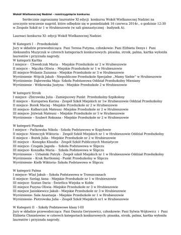 Wokół Wielkanocnej Nadziei - rozstrzygnięcie konkursu Serdecznie zapraszamy laureatów XI edycji konkursu Wokół Wielkanocnej Nadziei na uroczyste wręczenie nagród, które odbędzie się w poniedziałek 16 czerwca 2014r., o godzinie 12:30 w Zespole Szkół nr 1 w Hrubieszowie (w sali gimnastycznej - budynek A). Laureaci konkursu XI- edycji Wokół Wielkanocnej Nadziei W Kategorii I - Przedszkolaki Jury w składzie przewodnicząca Pani Teresa Futyma, członkowie: Pani Elżbieta Denys i Pani Aleksandra Muzyczuk w czterech kategoriach konkursowych: pisanka, stroik, palma, kartka wyłoniła laureatów i przyznała nagrody. W kategorii Kartka I miejsce - Chwedczuk Maria - Miejskie Przedszkole nr 2 w Hrubieszowie II miejsce - Mączka Oliwia – Miejskie Przedszkole nr 1 w Hrubieszowie III miejsce-Wolanin Zuzanna - Miejskie Przedszkole nr 3 w Hrubieszowie Wyróżnienie -Wójcik Jakub - Niepubliczne Przedszkole Specjalne ,,Mamy Siebie'' w Hrubieszowie Wyróżnienie- Dąbrowska Maja- Szkoła Podstawowa Oddział Przedszkolny Mieniany Wyróżnienie - Witkowska Justyna - Miejskie Przedszkole 2 w Hrubieszowie W kategorii Stroik I miejsce –Zbirowska Julia - Zamiejscowy Punkt Przedszkolny-Szpikołosy II miejsce – Kuropatwa Karina - Zespół Szkół Miejskich nr 1w Hrubieszowie Oddział Przedszkolny II miejsce- Borek Maciej - Miejskie Przedszkole nr 2 w Hrubieszowie III miejsce- Kalbarczyk Mateusz -Miejskie Przedszkole nr 2 w Hrubieszowie III miejsce- Jóźwiak Mateusz – Miejskie Przedszkole nr 5 w Hrubieszowie Wyróżnienie – Szubert Roksana - Miejskie Przedszkole nr 2 w Hrubieszowie W kategorii Pisanka I miejsce – Paćkowska Nikola - Szkoła Podstawowa w Kopyłowie II miejsce- Niemczyk Wiktoria - Zespół Szkół Miejskich nr 1 w Hrubieszowie Oddział Przedszkolny II miejsce – Bożek Julia - Miejskie Przedszkole nr 2 w Hrubieszowie III miejsce – Konopko Klaudia - Zespół Szkół Publicznych Moniatycze III miejsce- Czugała Jagoda - Szkoła Podstawowa w Ślipczu III miejsce- Koszałka Maria - Szkoła Podstawowa w Ślipczu Wyróżnienie – Urbański Patryk - Zespół szkół Miejskich nr 1 w Hrubieszowie Oddział Przedszkolny Wyróżnienie – Kruk Bartłomiej - Punkt Przedszkolny w Ślipczu Wyróżnienie- Kiełb Wiktoria- Szkoła Podstawowa w Ślipczu W kategorii Palma I miejsce- Wlaź Jakub – Szkoła Podstawowa w Trzeszczanach II miejsce- Szeląg Anna - Miejskie Przedszkole nr 1 w Hrubieszowie III miejsce- Szatan Daria - Świetlica Wiejska w Koble III miejsce Pazyna Oliwia -Miejskie Przedszkole nr 3 w Hrubieszowie III miejsce Jasinkiewicz Jakub - Miejskie Przedszkole nr 3 w Hrubieszowie Wyróżnienie- Sala Anastazja - Miejskie Przedszkole nr 1 w Hrubieszowie Wyróżnienie- Piotrowska Julia – Zespół Szkół Miejskich nr1 w Hrubieszowie W Kategorii II - Szkoły Podstawowe klasy I-III Jury w składzie przewodnicząca Pani Danuta Gerynowicz, członkowie: Pani Sylwia Wójtowicz i Pani Elżbieta Chmielowiec w czterech kategoriach konkursowych: pisanka, stroik, palma, kartka wyłoniła laureatów i przyznała nagrody. W kategorii Kartka I miejsce - Senkowska Gabriela – Zespół Szkół Miejskich nr 1 w Hrubieszowie II miejsce –Wór Paulina – Zespół Szkół Miejskich nr 1 Hrubieszowie III miejsce - Stepaniuk Klaudia – Szkoła Podstawowej w Trzeszczanach Wyróżnienie- Gorczyńska Karolina – Szkoła Podstawowa w Trzeszczanach Wyróżnienie - Kuczewski Wiktor – Zespół Szkół Miejskich nr 3 w Hrubieszowie W kategorii Stroik I miejsce - Graf Marek - Szkoła Podstawowa w Stefankowicach II miejsce - Bil Natalia – Szkoła Podstawowa w Kopyłowie III miejsce - Maciej Miłosz – Publiczna Szkoła Podstawowa w Dąbrowie III miejsce - Rutkowski Michał – Zespół Szkół Miejskich nr 1 Hrubieszowie Wyróżnienie - Dec Dawid - Szkoła Podstawowa w Mołodiatyczach Wyróżnienie- Antoniak Natalia – Szkoła Podstawowa w Stefankowicach W kategorii Pisanka I miejsce- Kupiec Mateusz – Szkoła Podstawowa w Ślipczu II miejsce- Najczuk Aleksandra - Szkoła Podstawowa w Trzeszczanach III miejsce- Znajomska Julia- Szkoła Podstawowej w Trzeszczanach wyróżnienie – Kosmala Wiktor – Zespół Szkół w Horodle wyróżnienie- Markiewicz Gabriel – Zespół Szkół Miejskich nr 1 w Hrubieszowie wyróżnienie- Panasiewicz Martyna - Zespół Szkół Miejskich nr 1 w Hrubieszowie W kategorii Palma I miejsce- Antoniak Natalia – Szkoła Podstawowa w Stefankowicach II miejsce – Biber Michał - Świetlica Wiejska Ubrodowice III miejsce - Nowaczewska Oliwia - Gminna Biblioteka Publiczna w Horodle III miejsce - Rudawska Magda - Szkoła Podstawowa w Mienianach wyróżnienie - Hejna Karolina- Świetlica Wiejska w Koble W Kategorii III - Szkoły Podstawowe klasy IV-VI Jury w składzie przewodnicząca Pani Elżbieta Lebiedowicz, członkowie: Pani Irmina Drawdzik i Pan Janusz Jędrzejewski w czterech kategoriach konkursowych: pisanka, stroik, palma, kartka wyłoniła laureatów i przyznała nagrody. W kategorii Kartka I miejsce- Jóźwiak Aleksandra – Zespół szkół Miejskich Nr 3 w Hrubieszowie II miejsce – Koza Aleksandra - Szkoła Podstawowa w Husynnym III miejsce - Lipian Izabela – Szkoła Podstawowa w Nieledwi wyróżnienie – Turek Tomasz - Zespół Szkół w Strzyżowie wyróżnienie – Świątek Magdalena – Szkoła Podstawowa w Husynnym wyróżnienie – Pawelec Iza –Powiatowy Zespół Placówek Szkolno Wychowawczych w Hrubieszowie W kategorii Stroik I miejsce - Julia Wojtaszko – Szkoła Podstawowa w Stefankowicach II miejsce - Kujawski Michał – Publiczna Szkoła Podstawowa w Koble III miejsce - Bartuzi Kinga i Kamil – Zespół Szkół Miejskich nr 2 w Hrubieszowie wyróżnienie - Gierszon Damian – Szkoła Podstawowa w Mołodiatyczach wyróżnienie - Pietryna Oliwia – Zespół Szkół Miejskich nr 2 w Hrubieszowie W kategorii Pisanka I miejsce - Warszawa Julia – Szkoła Podstawowa w Mienianach II miejsce - Boczkowska Weronika - Szkoła Podstawowa w Nie