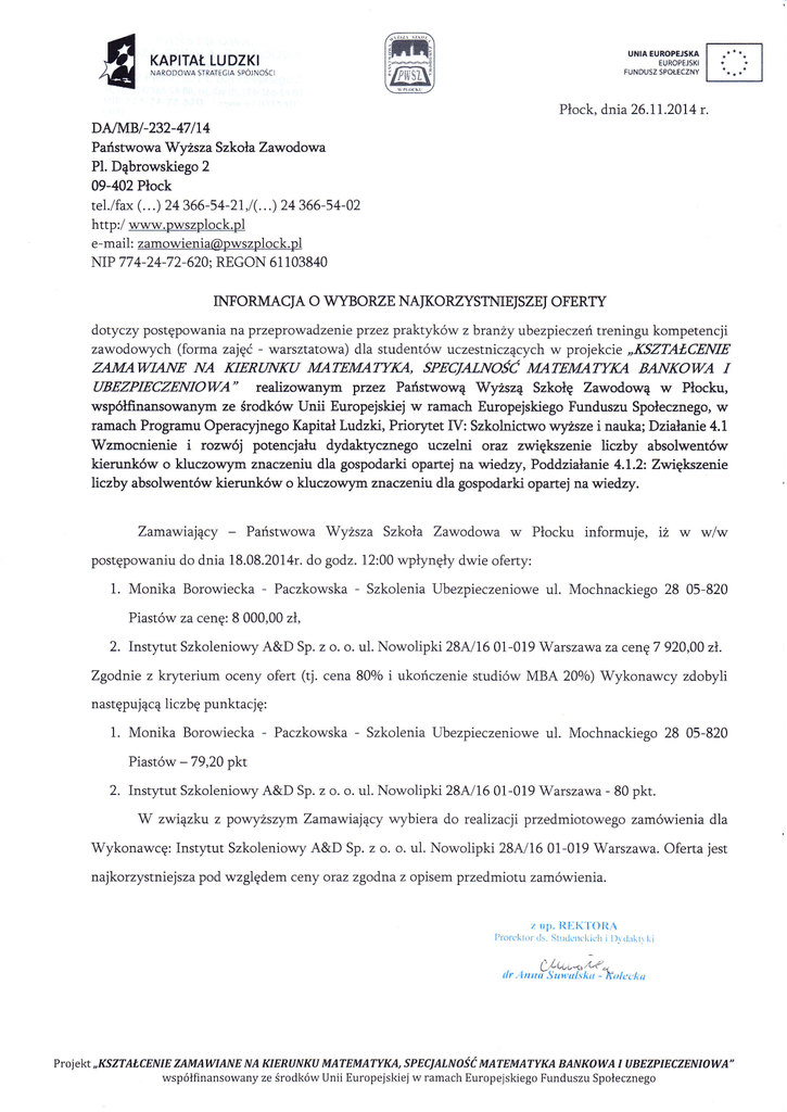 r._ ' .'. l ł ' FuNDUsŻ sPoLEĆŹN' | '-..' l UltłlA EUnoPEJsKA KAP|TAŁ LuDZKl NARo0oWA !TnATt6lA tuRope.lsxll spÓj NjośC Płock, dnia 26.11.2014 r. DA/MB/-232-47/14 Państwowa Wyższa Szkoła Zawodowa Pl. Dąbrowskiego 2 09-402 Płock tel./fax (. . .) 24 366-54-21 ,l(. . .) 24 366-54-02 http:/ www.pwszplock.pl e-mail: [email protected] NIP 774-24-72-620; REGON 61103840 TNFORMACIA O WYBORZE NAIKORZYSTNTEISZEI OFERTY dotyczy postępowania na przeprowadzenie przez praktyków z branży ubezpieczeń treningu kompetencji zawodowych (forma zajęc - warsztatowa) dla studentów uczestniczących w projekcie ,,I{9ZTAł,CENIE ZAMAWIANE NA KIERUNKU MATEMATnKA, 9PECIALNŻŚC MATEMATYKA BANK)WA I UBEZPIECZENIOWA' realizowanym przez Panstwową Wyższą Szkołę Zawodową w Płocku, współfinansowan}.m ze środków Unii Europejskiej w ramach Europejskiego Funduszu Społecznego, w ramach Programu operaryjnego Kapitał Ludzki, Pńorytet IV: Szkolnictwo wyższe i nauka; Działanie 4.1 Wzmocnienie i rozwój potencjafu dydaktycznego uczelni oraz zwiększenie liczby absolwentów kierunków o kluczowym znaczeniu dla gospodarki opartej na wiedzy, Poddziałanie 4.I.2z Zwiększenie liczby absolwentów kierunków o kluczowym znaczeniu dla gospodarki opartej na wiedzy. Zamawiający _ Państwowa Wyzsza Szkoła Zawodowa postępowaniu do dnia 18.08.2014r. do godz. 12:00 w Płocku informuje, iż w wlw wpĘnęĘ dwie oferty: 1. Monika Borowiecka - Paczkowska - Szkolenia Ubezpieczeniowe ul. Mochnackiego 28 05-820 Piastów za Cenę: 8 000,00 zł, 2. Instytut Szkoleniowy A&D Sp. z o. o. ul. Zgodnie z kryterium oceny ofert (tj. cena Nowolipki 28Ai 16 01-019'Warszawa 80o/o Za cenę 7 920,00 zł. i ukończenie studiów MBA 200/o)'Wykonawcy zdobyli następującą liczbę punktację: 1. Monika Borowiecka - Paczkowska - Szkolenia Ubezpieczeniowe ul. Mochnackiego 28 05-820 Piastów _79,20 pkt 2. Instytut Szkoleniowy A&D Sp. z o. o. ul. Nowolipki 284116 01-019 Warszawa - 80 pkt. W związku z powyższym Zamawiający wybiera do realizacji przedmiotowego zamówienia Wykonawcę: Instytut Szkoleniowy A&D Sp. z o. o. ul. Nowolipki 28ł16 01-019 Warszawa. dla Oferta jest najkorzystniejsza pod względem Ceny oraz zgodna z opisem przedmiotu zamówienia. z np. l{lrli l-(}l{A I'torcklor ris. Stutie:lckich i il\ (ill,t\ Ć LLuun,U- tlr 'Itlłtt|Sltn'tttskl - Nllltt l(i ktt Projekt,,KSZTAŁCENIE ZAMAWIANE NA KIERUNRI] MATEMATYru, ,PECIALNLŚĆ MATEMATYru BANK|WA I UBEZPIEqZENI,WA" współfinansowany ze środków Unii Europejskiej w ramach Europejskiego Funduszu Społecznego