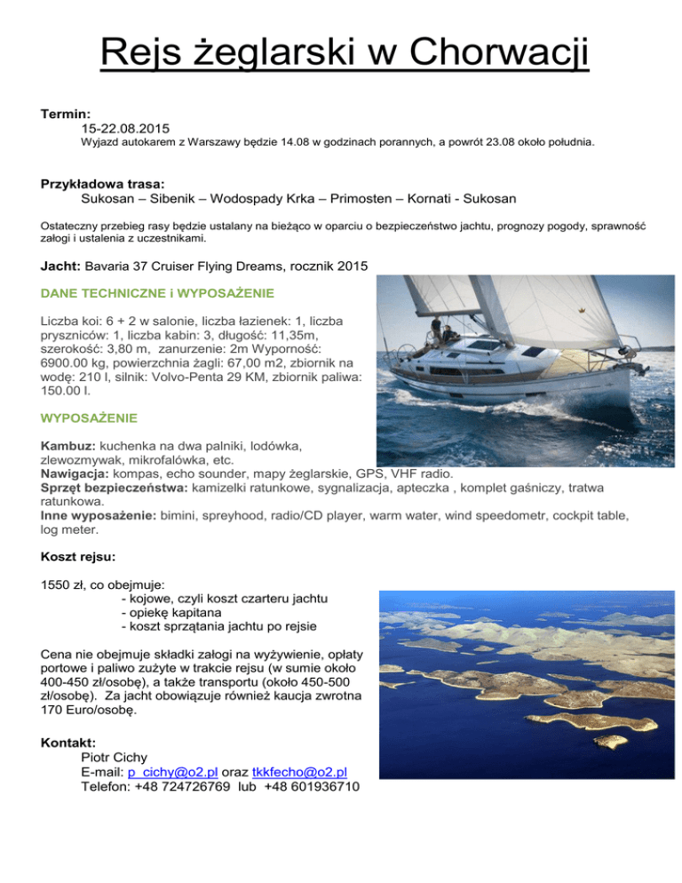 Rejs żeglarski w Chorwacji Termin: 15-22.08.2015 Wyjazd autokarem z Warszawy będzie 14.08 w godzinach porannych, a powrót 23.08 około południa. Przykładowa trasa: Sukosan – Sibenik – Wodospady Krka – Primosten – Kornati - Sukosan Ostateczny przebieg rasy będzie ustalany na bieżąco w oparciu o bezpieczeństwo jachtu, prognozy pogody, sprawność załogi i ustalenia z uczestnikami. Jacht: Bavaria 37 Cruiser Flying Dreams, rocznik 2015 DANE TECHNICZNE i WYPOSAŻENIE Liczba koi: 6 + 2 w salonie, liczba łazienek: 1, liczba pryszniców: 1, liczba kabin: 3, długość: 11,35m, szerokość: 3,80 m, zanurzenie: 2m Wyporność: 6900.00 kg, powierzchnia żagli: 67,00 m2, zbiornik na wodę: 210 l, silnik: Volvo-Penta 29 KM, zbiornik paliwa: 150.00 l. WYPOSAŻENIE Kambuz: kuchenka na dwa palniki, lodówka, zlewozmywak, mikrofalówka, etc. Nawigacja: kompas, echo sounder, mapy żeglarskie, GPS, VHF radio. Sprzęt bezpieczeństwa: kamizelki ratunkowe, sygnalizacja, apteczka , komplet gaśniczy, tratwa ratunkowa. Inne wyposażenie: bimini, spreyhood, radio/CD player, warm water, wind speedometr, cockpit table, log meter. Koszt rejsu: 1550 zł, co obejmuje: - kojowe, czyli koszt czarteru jachtu - opiekę kapitana - koszt sprzątania jachtu po rejsie Cena nie obejmuje składki załogi na wyżywienie, opłaty portowe i paliwo zużyte w trakcie rejsu (w sumie około 400-450 zł/osobę), a także transportu (około 450-500 zł/osobę). Za jacht obowiązuje również kaucja zwrotna 170 Euro/osobę. Kontakt: Piotr Cichy E-mail: [email protected] oraz [email protected] Telefon: +48 724726769 lub +48 601936710