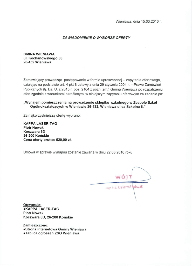 Wieniawa, dnia 15.03.2016 r. ZAWIADOMIENIE O WYBORZE OFERTY GMINA WIENIAWA ul. Kochanowskiego 88 26-432 Wieniawa Zamawiający prowadząc postępowanie w formie uproszczonej - zapytania ofertowego, działając na podstawie art. 4 pkt 8 ustawy z dnia 29 stycznia 2004 r. - Prawo Zamówień Publicznych (tj. Dz. U. z 2015 r. poz. 2164 z późn. zm.) Gmina Wieniawa po rozpatrzeniu ofert zgodnie z warunkami określonymi w niniejszym zapytaniu ofertowym za zadanie pn: „Wynajem pomieszczenia na prowadzenie sklepiku szkolnego w Zespole Szkół Ogólnokształcących w Wieniawie 26-432, Wieniawa ulica Szkolna 6." Za najkorzystniejszą ofertę wybrano: KAPPA L A S E R - T A G Piotr Nowak Koczwara 6D 26-200 Końskie Cena oferty brutto: 520,00 zł. Umowa w sprawie wynajmu zostanie zawarta w dniu 22.03.2016 roku Otrzymuje: • KAPPA L A S E R - T A G Piotr Nowak Koczwara 6D, 26-200 Końskie Zamieszczono: • Strona internetowa Gminy Wieniawa •Tablica ogłoszeń Z S O Wieniawa