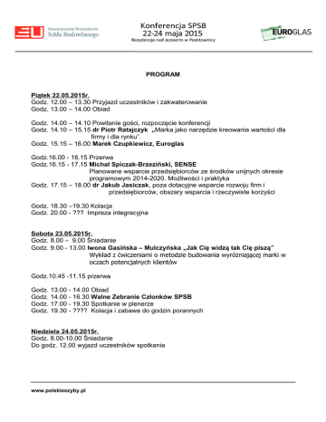 PROGRAM Piątek 22.05.2015r. Godz. 12.00 – 13.30 Przyjazd uczestników i zakwaterowanie Godz. 13.00 – 14.00 Obiad Godz. 14.00 – 14.10 Powitanie gości, rozpoczęcie konferencji Godz. 14.10 – 15.15 dr Piotr Ratajczyk „Marka jako narzędzie kreowania wartości dla firmy i dla rynku”. Godz. 15.15 – 16.00 Marek Czupkiewicz, Euroglas Godz.16.00 - 16.15 Przerwa Godz.16.15 - 17.15 Michał Spiczak-Brzeziński, SENSE Planowane wsparcie przedsiębiorców ze środków unijnych okresie programowym 2014-2020. Możliwości i praktyka Godz. 17.15 – 18.00 dr Jakub Jasiczak, poza dotacyjne wsparcie rozwoju firm i przedsiębiorców, obszary wsparcia i rzeczywiste korzyści Godz. 18.30 –19.30 Kolacja Godz. 20.00 - ??? Impreza integracyjna Sobota 23.05.2015r. Godz. 8.00 – 9.00 Śniadanie Godz. 9.00 - 13.00 Iwona Gasińska – Mulczyńska „Jak Cię widzą tak Cię piszą” Wykład z ćwiczeniami o metodzie budowania wyróżniającej marki w oczach potencjalnych klientów Godz.10.45 -11.15 przerwa Godz. 13.00 - 14.00 Obiad Godz. 14.00 - 16.30 Walne Zebranie Członków SPSB Godz. 17.00 - 19.30 Spotkanie w plenerze Godz. 19.30 - ???? Kolacja i zabawa do godzin porannych Niedziela 24.05.2015r. Godz. 8.00-10.00 Śniadanie Do godz. 12.00 wyjazd uczestników spotkania www.polskieszyby.pl