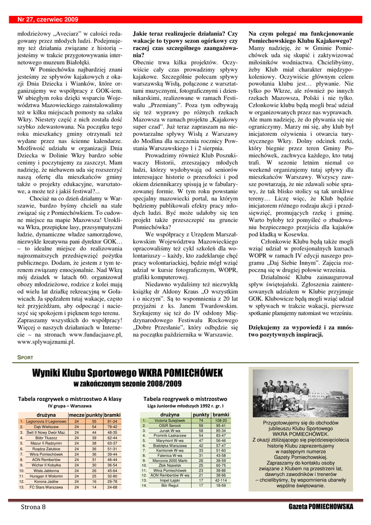 Nr 27, czerwiec 2009 młodzieżowy „Aveciarz” w całości redagowany przez młodych ludzi. Podejmujemy też działania związane z historią – jesteśmy w trakcie przygotowywania internetowego muzeum Białołęki. W Pomiechówku najbardziej znani jesteśmy ze spływów kajakowych z okazji Dnia Dziecka i Wianków, które organizujemy we współpracy z GOK-iem. W ubiegłym roku dzięki wsparciu Województwa Mazowieckiego zainstalowalimy też w kilku miejscach pomosty na szlaku Wkry. Niestety część z nich została dość szybko zdewastowana. Na początku tego roku mieszkańcy gminy otrzymali też wydane przez nas ścienne kalendarze. Możliwość udziału w organizacji Dnia Dziecka w Dolinie Wkry bardzo sobie cenimy i poczytujemy za zaszczyt. Mam nadzieję, że niebawem uda się rozszerzyć naszą ofertę dla mieszkańców gminy także o projekty edukacyjne, warsztatowe, a może też i jakiś festiwal?... Chociaż na co dzień działamy w Warszawie, bardzo byśmy chcieli na stałe związać się z Pomiechówkiem. To cudowne miejsce na mapie Mazowsza! Urokliwa Wkra, przepiękne lasy, przesympatyczni ludzie, dynamiczne władze samorządowe, niezwykle kreatywna pani dyrektor GOK… – to idealne miejsce do realizowania najrozmaitszych przedsięwzięć pożytku publicznego. Dodam, że jestem z tym terenem związany emocjonalnie. Nad Wkrą mój dziadek w latach 60. organizował obozy młodzieżowe, rodzice z kolei mają od wielu lat działkę rekreacyjną w Goławicach. Ja spędzałem tutaj wakacje, często też przyjeżdżam, aby odpocząć i nacieszyć się spokojem i pięknem tego terenu. Zapraszamy wszystkich do współpracy! Więcej o naszych działaniach w Internecie – na stronach www.fundacjaave.pl, www.splywajznami.pl. Jakie teraz realizujecie działania? Czy wakacje to typowy sezon ogórkowy czy raczej czas szczególnego zaangażowania? Obecnie trwa kilka projektów. Oczywiście cały czas prowadzimy spływy kajakowe. Szczególnie polecam spływy warszawską Wisłą, połączone z warsztattami muzycznymi, fotograficznymi i dziennikarskimi, realizowane w ramach Festiwalu „Przemiany”. Poza tym odbywają się też wyprawy po różnych rzekach Mazowsza w ramach projektu „Kajakowy super czad”. Już teraz zapraszam na niepowtarzalne spływy Wisłą z Warszawy do Modlina dla uczczenia rocznicy Powstania Warszawskiego 1 i 2 sierpnia. Prowadzimy również Klub Poszukiwaczy Historii, zrzeszający młodych ludzi, którzy wydobywają od seniorów interesujące historie o przeszłości i pod okiem dziennikarzy spisują je w fabularyzowanej formie. W tym roku powstanie specjalny mazowiecki portal, na którym będziemy publikowali efekty pracy młodych ludzi. Być może udałoby się ten projekt także przeszczepić na gruncie Pomiechówka? We współpracy z Urzędem Marszałkowskim Województwa Mazowieckiego opracowaliśmy też cykl szkoleń dla wolontariuszy – każdy, kto zadeklaruje chęć pracy wolontariackiej, będzie mógł wziąć udział w kursie fotograficznym, WOPR, grafiki komputerowej. Niedawno wydaliśmy też niezwykłą książkę dr Aldony Kraus „O wszystkim i o niczym”. Są to wspomnienia z 20 lat przyjaźni z ks. Janem Twardowskim. Szykujemy się też do IV odsłony Międzynarodowego Festiwalu Rockowego „Dobre Przesłanie”, który odbędzie się na początku października w Warszawie. Na czym polegać ma funkcjonowanie Pomiechowskiego Klubu Kajakowego? Mamy nadzieję, że w Gminie Pomiechówek uda się skupić i zaktywizować miłośników wodniactwa. Chcielibyśmy, żeby Klub miał charakter międzypokoleniowy. Oczywiście głównym celem powołania klubu jest… pływanie. Nie tylko po Wkrze, ale również po innych rzekach Mazowsza, Polski i nie tylko. Członkowie klubu będą mogli brać udział w organizowanych przez nas wyprawach. Ale mam nadzieję, że do pływania się nie ograniczymy. Marzy mi się, aby klub był inicjatorem ożywienia i otwarcia turystycznego Wkry. Dolny odcinek rzeki, który biegnie przez teren Gminy Pomiechówek, zachwyca każdego, kto tutaj trafi. W sezonie letnim niemal co weekend organizujemy tutaj spływy dla mieszkańców Warszawy. Wszyscy zawsze powtarzają, że nie zdawali sobie sprawy, że tak blisko stolicy są tak urokliwe tereny… Liczę więc, że Klub będzie inicjatorem różnego rodzaju akcji i przedsięwzięć, promujących rzekę i gminę. Warto byłoby też pomyśleć o zbudowaniu bezpiecznego przejścia dla kajaków pod kładką w Kosewku. Członkowie Klubu będą także mogli wziąć udział w profesjonalnych kursach WOPR w ramach IV edycji naszego programu „Daj Siebie Innym”. Zajęcia rozpoczną się w drugiej połowie września. Działalność Klubu zainaugurował spływ świętojański. Zgłoszenia zainteresowanych udziałem w Klubie przyjmuje GOK. Klubowicze będą mogli wziąć udział w spływach w trakcie wakacji, pierwsze spotkanie planujemy natomiast we wrześniu. Dziękujemy za wypowiedź i za mnóstwo pozytywnych inspiracji. SPORT Wyniki Klubu Sportowego WKRA POMIECHÓWEK w zakończonym sezonie 2008/2009 Tabela rozgrywek o mistrzostwo A klasy Tabela rozgrywek o mistrzostwo IV grupa – Warszawa Liga Juniorów młodszych 1992 r. gr. I drużyna 1. Legionovia II Legionowo 2. Dąb Wieliszew 3. Świt II Nowy Dwór Maz. 4. Bóbr Tłuszcz 5. Mazur II Radzymin 6. Rządza Załubice 7. Wkra Pomiechówek 8. AON Rembertów 9. Wicher II Kobyłka 10. Wisła Jabłonna 11. Huragan II Wołomin 12. Korona Jadów 13. FC Stars Warszawa Strona 8 mecze punkty bramki 24 24 24 24 24 24 24 24 24 24 24 24 24 55 54 44 39 38 36 36 31 30 26 25 16 14 91-24 79-42 48-35 62-44 63-37 51-31 39-44 46-44 36-54 45-64 32-80 29-78 24-68 drużyna 1. Victoria Sulejówek 2. OSiR Serock 3. Junak W-wa 4. Promnik Łaskarzew 5. Marymont W-wa 6. Białołęka Warszawa 7. Kamionek W-wa 8. Falenica W-wa 9. Marcovia 2000 Marki 10. Żbik Nasielsk 11. Wkra Pomiechówek 12. AON Rembertów W-wa 13. Impet Łajski 14. Bór Regut punkty bramki 74 59