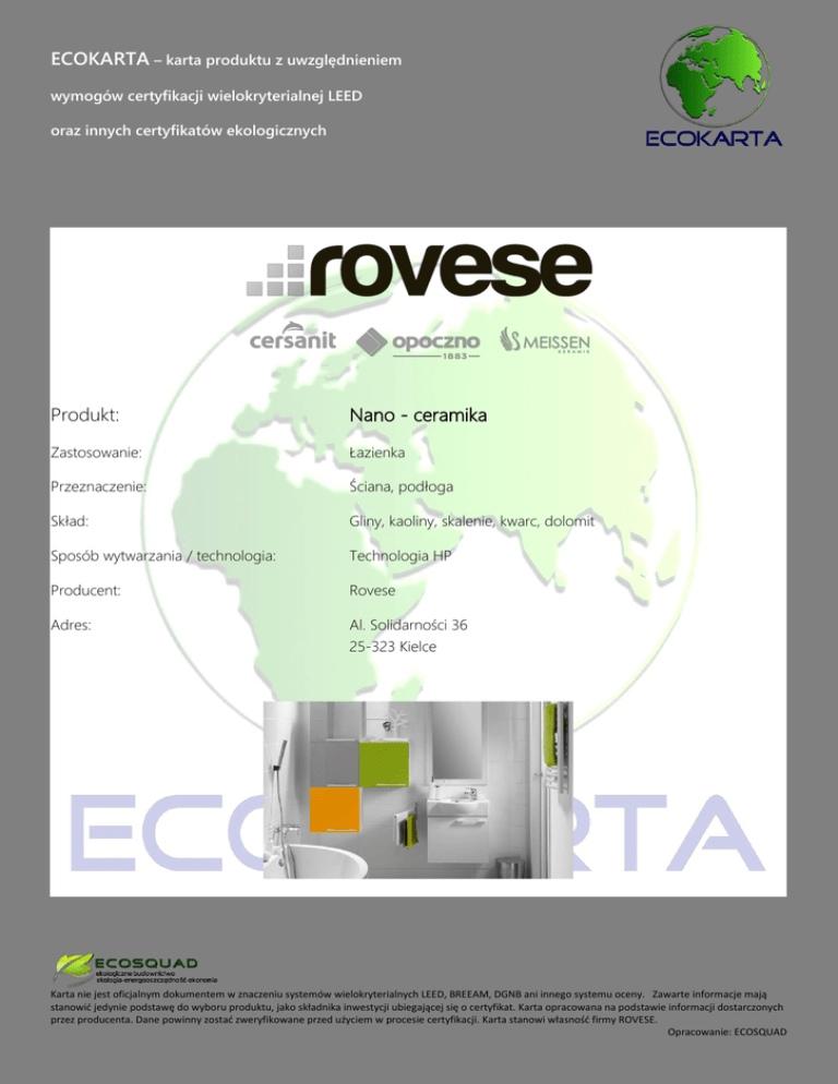 ECOKARTA – karta produktu z uwzględnieniem wymogów certyfikacji wielokryterialnej LEED oraz innych certyfikatów ekologicznych Produkt: Nano - ceramika Zastosowanie: Łazienka Przeznaczenie: Ściana, podłoga Skład: Gliny, kaoliny, skalenie, kwarc, dolomit Sposób wytwarzania / technologia: Technologia HP Producent: Rovese Adres: Al. Solidarności 36 25-323 Kielce Karta nie jest oficjalnym dokumentem w znaczeniu systemów wielokryterialnych LEED, BREEAM, DGNB ani innego systemu oceny. Zawarte informacje mają stanowić jedynie podstawę do wyboru produktu, jako składnika inwestycji ubiegającej się o certyfikat. Karta opracowana na podstawie informacji dostarczonych przez producenta. Dane powinny zostać zweryfikowane przed użyciem w procesie certyfikacji. Karta stanowi własność firmy ROVESE. Opracowanie: ECOSQUAD ECOKARTA – karta produktu z uwzględnieniem wymogów certyfikacji wielokryterialnej LEED oraz innych certyfikatów ekologicznych Zawartość materiałów Materiał pochodzący z recyklingu został określony zgodnie z pochodzących z recyklingu definicją normy ISO 14021. Zawartość materiałów pochodzących z recyklingu podana jest w %. Zgodnie z wymogami LEED NC oraz LEED CS możliwe jest uzyskanie 1 lub 2 punktów w kredycie MR4 jeżeli zawartość produktów pochodzących z recyklingu post-konsumenckiego oraz pre-konsumenckiego wynosi odpowiednio 10% lub 20% całkowitego kosztu materiałów użytych w projekcie. Zawartość w produkcie do 10% Zawartość materiałów Procentowa zawartość materiału nadającego się do recyklingu możliwych do recyklingu w gotowym produkcie. Produkt może być poddany recyklingowi w całości lub po uprzednim przygotowaniu. Zawartość w produkcie: 100% Karta nie jest oficjalnym dokumentem w znaczeniu systemów wielokryterialnych LEED, BREEAM, DGNB ani innego systemu oceny. Zawarte informacje mają stanowić jedynie podstawę do wyboru produktu, jako składnika inwestycji ubiegającej się o certyfikat. Karta opracowana na podstawie informacji dostarczonych przez producenta. Dane powinny zostać zweryfikowane przed użyciem w procesie certyfikacji. Karta stanowi własność firmy ROVESE. Opracowanie: ECOSQUAD ECOKARTA – karta produktu z uwzględnieniem wymogów certyfikacji wielokryterialnej LEED oraz innych certyfikatów ekologicznych Miejsce wytwarzania: Krasnystaw, woj. Lubelskie, Polska Pochodzenie materiałów składowych: Gliny – Europa Kaoliny – Europa Skalenie – Europa Dolomit – Europa Kwarc – Europa Zgodnie z wymaganiami certyfikacji wielokryterialnej LEED punkty za użycie produktów regionalnych można uzyskać w przypadku, gdy co najmniej 10% całkowitego kosztu materiałów użytych w projekcie stanowią materiały regionalne, czyli pozyskane, wytwarzane lub odzyskane w promieniu 500 mil ( ok. 804 km) od miejsca budowy. Możliwe jest uzyskanie odpowiednio: 1 pkt – 10% oraz 2 pkt – 20%. Karta nie jest oficjalnym dokumentem w znaczeniu systemów wielokryterialnych LEED, BREEAM, DGNB ani innego systemu oceny. Zawarte informacje mają stanowić jedynie podstawę do wyboru produktu, jako składnika inwestycji ubiegającej się o certyfikat. Karta opracowana na podstawie informacji dostarczonych przez producenta. Dane powinny zostać zweryfikowane przed użyciem w procesie certyfikacji. Karta stanowi własność firmy ROVESE. Opracowanie: ECOSQUAD ECOKARTA – karta produktu z uwzględnieniem wymogów certyfikacji wielokryterialnej LEED oraz innych certyfikatów ekologicznych Wpływ na jakość powietrza Pomimo, iż sam produkt pozostaje bez wpływu na jakość we wnętrzach: powietrza we wnętrzach, kleje użyte do montażu mogą zawierać substancje wpływające na jakość powietrza. Dotyczy to zwłaszcza klejów i uszczelniaczy. Zgodnie z wymaganiami certyfikacji LEED NC oraz LEED CS użyte kleje oraz uszczelniacze powinny spełniać zapisy normy South Coast Air Quality Managemant District (SCAQMD), natomiast kleje natryskowe odpowiednio zapisy normy Green Seal Standard for Commercial Adhesives. System oceny wielokryterialnej LEED zawiera również zapisy co do wykończenia powierzchni podłogowych. W tym przypadku konieczne jest uzyskanie zgodności z aktualnie obowiązującą wersja FloorScore – dotyczy to wszystkich nie dywanowych powierzchni podłóg. Produkt ma wpływ na uzyskanie punktów w certyfikacji LEED NC oraz LEED CS w zakresie kredytów IEQ 4.3 oraz pośrednio IEQ 4.1. Zawartość substancji niebezpiecznych: LZO (VOC) - nie zawiera Formaldehyd - nie zawiera Fenole - nie zawiera Karta nie jest oficjalnym dokumentem w znaczeniu systemów wielokryterialnych LEED, BREEAM, DGNB ani innego systemu oceny. Zawarte informacje mają stanowić jedynie podstawę do wyboru produktu, jako składnika inwestycji ubiegającej się o certyfikat. Karta opracowana na podstawie informacji dostarczonych przez producenta. Dane powinny zostać zweryfikowane przed użyciem w procesie certyfikacji. Karta stanowi własność firmy ROVESE. Opracowanie: ECOSQUAD ECOKARTA – karta produktu z uwzględnieniem wymogów certyfikacji wielokryterialnej LEED oraz innych certyfikatów ekologicznych Redukcja zużycia wody: Redukcja zużycia wody stanowi jeden z punktów krytycznych w certyfikacji wielokryterialnej LEED. Aby spełnić ten warunek, konieczne jest obniżenie zużycia wody o 20% w stosunku do standardowych budynków danej klasy. Samo zużycie wody do transportu ścieków w budynku powinno zostać obniżone również o 50% - głównie dzięki zastosowaniu specjalnych urządzeń sanitarnych. Zastosowane rozwiązania pozwalają na uzyskanie maksymalnie 2 punktów w kredycie WE 2. Zużycie wody podawane jest w galonach na jedno spłukanie lub też w galonach na minutę. Posiadane certyfikaty ekologiczne: System Zarządzania Środowiskowego ISO 14001 Gwarancją prawidłowego Zarządzania Środowiskowego jest przestrzeganie następujących zasad: - Planowa i rozsądna ochrona środowiska oraz przestrzeganie zasad