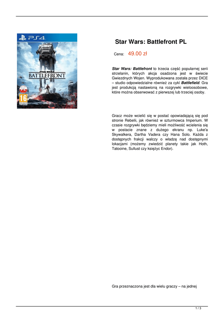Star Wars: Battlefront PL Cena: 49.00 zł Star Wars: Battlefront to trzecia część popularnej serii strzelanin, których akcja osadzona jest w świecie Gwiezdnych Wojen. Wyprodukowana została przez DICE – studio odpowiedzialne również za cykl Battlefield. Gra jest produkcją nastawioną na rozgrywki wieloosobowe, które można obserwować z pierwszej lub trzeciej osoby. Gracz może wcielić się w postać opowiadającą się pod stronie Rebelii, jak również w szturmowca Imperium. W czasie rozgrywki będziemy mieli możliwość wcielenia się w postacie znane z dużego ekranu np. Luke'a Skywalkera, Dartha Vadera czy Hana Solo. Każda z dostępnych frakcji walczy o władzę nad dostępnymi lokacjami (możemy zwiedzić planety takie jak Hoth, Tatooine, Sullust czy księżyc Endor). Gra przeznaczona jest dla wielu graczy – na jednej 1/3 mapie może brać udział do 40 graczy. Pod względem mechaniki rozgrywki przypomina klasyczne strzelanki drużynowe. Ważnym elementem jest współpraca pomiędzy członkami swojego zespołu. Każda wybrana klasa ma unikalne umiejętności, które mogą przydać się na froncie. Twórcy zadbali o możliwość obsługiwania wielu pojazdów, które mogą przechylić szalę zwycięstwa na korzyść gracza. Do dyspozycji oddany został pokaźny arsenał broni. Rozgrywki wieloosobowe są zróżnicowane, a to za pomocą wielu dostępnych trybów gry. Możemy rozgrywać walki powietrzne przy użyciu X-wingów oraz myśliwców TIE (Tryb Eskadra), odegrać typowy deatchmatch (Tryb Potyczka), walczyć o spadające kapsuły ratunkowe (Tryb Strefa zrzutu) oraz wiele innych. Zobacz wideo: 2/3 3/3 Powered by TCPDF (www.tcpdf.org)