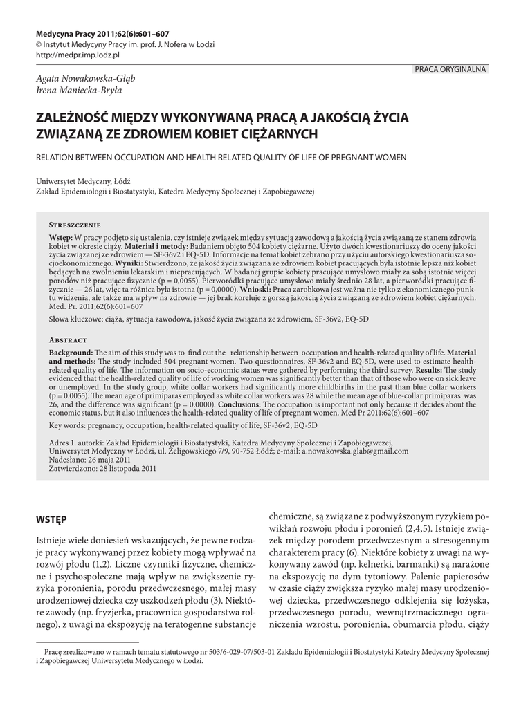 Medycyna Pracy 2011;62(6):601–607 © Instytut Medycyny Pracy im. prof. J. Nofera w Łodzi http://medpr.imp.lodz.pl PRACA ORYGINALNA Agata Nowakowska-Głąb Irena Maniecka-Bryła ZALEŻNOŚĆ MIĘDZY WYKONYWANĄ PRACĄ A JAKOŚCIĄ ŻYCIA ZWIĄZANĄ ZE ZDROWIEM KOBIET CIĘŻARNYCH RELATION BETWEEN OCCUPATION AND HEALTH RELATED QUALITY OF LIFE OF PREGNANT WOMEN Uniwersytet Medyczny, Łódź Zakład Epidemiologii i Biostatystyki, Katedra Medycyny Społecznej i Zapobiegawczej Streszczenie Wstęp: W pracy podjęto się ustalenia, czy istnieje związek między sytuacją zawodową a jakością życia związaną ze stanem zdrowia kobiet w okresie ciąży. Materiał i metody: Badaniem objęto 504 kobiety ciężarne. Użyto dwóch kwestionariuszy do oceny jakości życia związanej ze zdrowiem — SF-36v2 i EQ-5D. Informacje na temat kobiet zebrano przy użyciu autorskiego kwestionariusza socjoekonomicznego. Wyniki: Stwierdzono, że jakość życia związana ze zdrowiem kobiet pracujących była istotnie lepsza niż kobiet będących na zwolnieniu lekarskim i niepracujących. W badanej grupie kobiety pracujące umysłowo miały za sobą istotnie więcej porodów niż pracujące fizycznie (p = 0,0055). Pierworódki pracujące umysłowo miały średnio 28 lat, a pierworódki pracujące fizycznie — 26 lat, więc ta różnica była istotna (p = 0,0000). Wnioski: Praca zarobkowa jest ważna nie tylko z ekonomicznego punktu widzenia, ale także ma wpływ na zdrowie — jej brak koreluje z gorszą jakością życia związaną ze zdrowiem kobiet ciężarnych. Med. Pr. 2011;62(6):601–607 Słowa kluczowe: ciąża, sytuacja zawodowa, jakość życia związana ze zdrowiem, SF-36v2, EQ-5D Abstract Background: The aim of this study was to find out the relationship between occupation and health-related quality of life. Material and methods: The study included 504 pregnant women. Two questionnaires, SF-36v2 and EQ-5D, were used to estimate healthrelated quality of life. The information on socio-economic status were gathered by performing the third survey. Results: The study evidenced that the health-related quality of life of working women was significantly better than that of those who were on sick leave or unemployed. In the study group, white collar workers had significantly more childbirths in the past than blue collar workers (p = 0.0055). The mean age of primiparas employed as white collar workers was 28 while the mean age of blue-collar primiparas was 26, and the difference was significant (p = 0.0000). Conclusions: The occupation is important not only because it decides about the economic status, but it also influences the health-related quality of life of pregnant women. Med Pr 2011;62(6):601–607 Key words: pregnancy, occupation, health-related quality of life, SF-36v2, EQ-5D Adres 1. autorki: Zakład Epidemiologii i Biostatystyki, Katedra Medycyny Społecznej i Zapobiegawczej, Uniwersytet Medyczny w Łodzi, ul. Żeligowskiego 7/9, 90-752 Łódź; e-mail: [email protected] Nadesłano: 26 maja 2011 Zatwierdzono: 28 listopada 2011 WSTĘP Istnieje wiele doniesień wskazujących, że pewne rodzaje pracy wykonywanej przez kobiety mogą wpływać na rozwój płodu (1,2). Liczne czynniki fizyczne, chemiczne i psychospołeczne mają wpływ na zwiększenie ryzyka poronienia, porodu przedwczesnego, małej masy urodzeniowej dziecka czy uszkodzeń płodu (3). Niektóre zawody (np. fryzjerka, pracownica gospodarstwa rolnego), z uwagi na ekspozycję na teratogenne substancje chemiczne, są związane z podwyższonym ryzykiem powikłań rozwoju płodu i poronień (2,4,5). Istnieje związek między porodem przedwczesnym a stresogennym charakterem pracy (6). Niektóre kobiety z uwagi na wykonywany zawód (np. kelnerki, barmanki) są narażone na ekspozycję na dym tytoniowy. Palenie papierosów w czasie ciąży zwiększa ryzyko małej masy urodzeniowej dziecka, przedwczesnego odklejenia się łożyska, przedwczesnego porodu, wewnątrzmacicznego ograniczenia wzrostu, poronienia, obumarcia płodu, ciąży Pracę zrealizowano w ramach tematu statutowego nr 503/6-029-07/503-01 Zakładu Epidemiologii i Biostatystyki Katedry Medycyny Społecznej i Zapobiegawczej Uniwersytetu Medycznego w Łodzi. 602 A. Nowakowska-Głąb, I. Maniecka-Bryła pozamacicznej (7–10). Wykazano także wpływ wykonywanej pracy na zdolności reprodukcyjne mężczyzn. Z uwagi na 72-dniowy cykl spermatogenezy ekspozycja mężczyzn na czynniki ryzyka na kilka miesięcy przed zapłodnieniem ma wpływ na płód (11). Ekspozycja kobiet na substancje teratogenne ma największe znaczenie dla rozwoju płodu w okresie organogenezy, tj. między 3. a 8. tygodniem ciąży (3), jednak niebezpieczna jest także ekspozycja na kilka miesięcy przed zapłodnieniem. Długoterminowa ekspozycja na różne czynniki w miejscu pracy może powodować nieodwracalne zmiany fragmentów DNA komórek, a część substancji, np. pestycydy, akumuluje się w tkance tłuszczowej. Wpływ długoterminowej ekspozycji nie był dotąd dokładnie zbadany (1). Warto zaznaczyć, że większość pracujących kobiet jest w okresie rozrodczym (12), a 70% wszystkich uszkodzeń płodu ma nieznane uwarunkowania (3). Niezwykle ważne są więc badania nad czynnikami związanymi z rodzajem wykonywanej pracy przez kobiety i ich wpływem na rozwój płodu. Celem pracy było ustalenie, czy istnieje związek między wykształceniem, statusem zawodowym i charakterem pracy wykonywanej przez kobiety ciężarne a jakością życia mierzoną stanem zdrowia kobiet w ciąży i liczbą przebytych porodów. MATERIAŁ I METODY Badanie zostało przeprowadzone w grupie 257 pacjentek hospitalizowanych między 21 lipca 2009 a 19 maja 2010 r. w Klinice Medycyny Matczyno-Płodowej i Ginekologii Instytutu Centrum Zdrowia Matki Polki w Łodzi (będącej ośrodkiem stopnia 3+ referencyjności) oraz wśród 247 pacjentek będących pod opieką Poradni Ginekologiczno-Położniczej Szpitala im. dr. L. Rydygiera w Łod