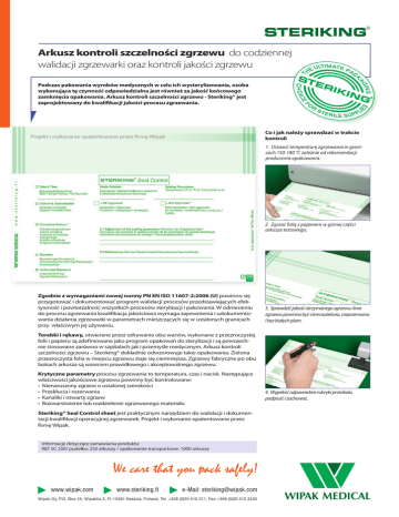Arkusz kontroli szczelności zgrzewu do codziennej walidacji zgrzewarki oraz kontroli jakości zgrzewu Podczas pakowania wyrobów medycznych w celu ich wysterylizowania, osoba wykonująca tę czynność odpowiedzialna jest również za jakość końcowego zamknięcia opakowania. Arkusz kontroli szczelności zgrzewu - Steriking® jest zaprojektowany do kwalifikacji jakości procesu zgrzewania. Co i jak należy sprawdzać w trakcie kontroli Projekt i wykonanie opatentowane przez firmę Wipak 1. Ustawić temperaturę zgrzewania w granicach 150-180 °C zależnie od rekomendacji producenta opakowania. 2. Zgrzać folię z papierem w górnej części arkusza testowego. Zgodnie z wymaganiami nowej normy PN EN ISO 11607-2:2006 (U) powinno się przygotować i dokumentować program walidacji procesów przedstawiających efektywność i powtarzalność wszystkich procesów sterylizacji i pakowania. W odniesieniu do procesu zgrzewania kwalifikacja jakościowa wymaga zapewnienia i udokumentowania działania zgrzewarki w parametrach mieszczących się w ustalonych granicach przy właściwym jej używaniu. 3. Sprawdzić jakość otrzymanego zgrzewu: linia zgrzewu powinna być ciemnozielona, nieprzerwana i bez białych plam. Torebki i rękawy, otwierane przez odrywanie obu warstw, wykonane z przezroczystej folii i papieru są zdefiniowane jako program opakowań do sterylizacji i są powszechnie stosowane zarówno w szpitalach jak i przemyśle medycznym. Arkusz kontroli szczelności zgrzewu – Steriking® dokładnie odwzorowuje takie opakowania. Zielona przezroczysta folia w miejscu zgrzewu staje się ciemniejsza. Zgrzewy fabryczne po obu bokach arkusza są wzorcem prawidłowego i akceptowalnego zgrzewu. Krytyczne parametry procesu zgrzewania to temperatura, czas i nacisk. Następujące właściwości jakościowe zgrzewu powinny być kontrolowane: • Nienaruszony zgrzew o ustalonej szerokości • Przekłucia i rozerwania • Kanaliki i otwarty zgrzew • Rozwarstwienie lub rozdzielenie zgrzewanego materiału Steriking® Seal Control sheet jest praktycznym narzędziem do walidacji i dokumentacji kwalifikacji operacyjnej zgrzewarek. Projekt i wykonanie opatentowane przez firmę Wipak. Informacje dotyczące zamawiania produktu: REF SC 250/ pudełko: 250 arkuszy / opakowanie transportowe: 1000 arkuszy www.wipak.com www.steriking.fi e-Mail: [email protected] Wipak Oy, P.O. Box 45, Wipaktie 2, FI-15561 Nastola, Finland, Tel. +358 (0)20 510 311, Fax +358 (0)20 510 3333 4. Wypełnić odpowiednie rubryki protokołu, podpisać i zachować. Poradnik użytkownika – Arkusz kontroli szczelności zgrzewu – Steriking® Arkusz kontroli szczelności zgrzewu do kwalifikacji operacyjnej (OQ) procesu zgrzewania zgodnie z wymaganiami PN-EN-ISO 11607–2:2006(U), (§ 5.3.2 b). Następujące właściwości jakościowe uszczelnienia powinny być kontrolowane: • nienaruszalność zgrzewu o ustalonej szerokości • przekłucia i rozerwania • kanaliki i otwarty zgrzew • rozwarstwienie lub rozdzielenie zgrzewanego materiału Jak odczytywać wyniki kontroli zgrzewania Zgrzew nienaruszony na całej wyspecyfikowanej szerokości Wykryte błędy: Wystąpienie białych obszarów w zgrzewie wskazuje, że zgrzew nie jest ciągły: parametry zgrzewania i prawidłowość działania zgrzewarki powinny być sprawdzone i poprawione. Po dokonanych korektach należy powtarzać cały proces kontroli szczelności zgrzewu aż do uzyskania akceptowalnych rezultatów. Wykryty błąd Kanaliki lub otwarty zgrzew Wykryty błąd Przekłucia lub rozerwania Wykryty błąd Za wysoka temperatura lub za mocny nacisk Arkusz kontroli szczelności zgrzewu – Steriking®: Test zgrzewu jest praktycznie systemem służącym do rutynowej codziennej walidacji zgrzewarki oraz kontroli jakości zgrzewu. Kiedy pakujemy wyroby medyczne wewnątrz systemu sterylnej bariery (czyli wyrób medyczny zapakowany w zamkniętym opakowaniu) to właśnie pakujący jest odpowiedzialny za zapewnienie prawidłowego zgrzewania zamykającego opakowanie. Oznacza to, że to pakujący powinien walidować proces zgrzewania. Dotyczy to zarówno działań przemysłowych jak i szpitalnych. Rodzaje używanych zgrzewarek: Do zgrzewania torebek sterylizacyjnych używamy dwóch rodzajów zgrzewarek: impulsowych i rolkowych. Arkusz kontroli szczelności zgrzewu – Steriking® może być stosowany w obu przypadkach. W zgrzewarkach impulsowych operator może zmieniać tylko czas impulsu zgrzewania. Temperatura zgrzewu jest ustalona fabrycznie, a nacisk jest wywierany ręcznie. Zgrzewarki impulsowe są stosowane w małych jednostkach i nie powinny być używane tam gdzie wymagana jest duża liczba zgrzewów. Powtarzalność i jednorodność jakości i siły zgrzewania jest w tych urządzeniach bardzo dyskusyjna. Zgrzewarki rolkowe skonstruowano aby zapewnić możliwość ciągłego zgrzewania przez cały dzień pracy. Zgrzewarki mają ustalone i nacisk i prędkość zgrzewania. Temperaturę należy dostosować do rodzaju zgrzewanego materiału opakowania. Modele nowoczesnych zgrzewarek posiadają wbudowane systemy walidacji, które dostarczają dowody, że naciski i temperatury zgrzewania mieszczą się w ustalonych granicach. Te właściwości nie zapewniają jednak dowodów, że linie zgrzewu są wystarczająco mocne, aby wytrzymywać warunki sterylizacji. Integralność bariery sterylności: Autoklawowanie jest metodą sterylizacji bardzo wymagającą dla materiałów opakowaniowych ze względu na wysokie temperatury i wymagane ogromne zmiany ciśnienia. Szeroko używane przezroczyste opakowania papierowo-foliowe do sterylizacji parowej (zarówno w 134°C jak i w 121°C) są wykonane z folii poliestrowo-polipropylenowej i papieru. Jakości i grubości folii różnią się między sobą w zależności od producenta, niemniej jednak rekomendowane temperatury zgrzewania mieszczą się w dość wąskim przedziale (150-180°C). Grubości i jakości papieru mają również wpływ na wytrzyma