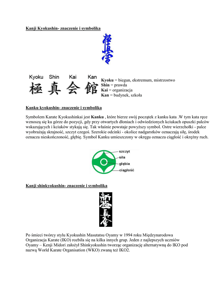 Kanji Kyokushin- znaczenie i symbolika Kyoku = biegun, ekstremum, mistrzostwo Shin = prawda Kai = organizacja Kan = budynek, szkoła Kanku kyokushin- znaczenie i symbolika Symbolem Karate Kyokushinkai jest Kanku , które bierze swój początek z kanku kata .W tym kata ręce wznoszą się ku górze do pozycji, gdy przy otwartych dłoniach i odwiedzionych kciukach opuszki palców wskazujących i kciuków stykają się. Tak właśnie powstaje powyższy symbol. Ostre wierzchołki - palce wyobrażają skrajność, szczyt czegoś. Szerokie odcinki - okolice nadgarstków oznaczają siłę, środek oznacza nieskończoność, głębię. Symbol Kanku umieszczony w okręgu oznacza ciągłość i okrężny ruch. Kanji shinkyokushin- znaczenie i symbolika Po śmieci twórcy stylu Kyokushin Masutatsu Oyamy w 1994 roku Międzynarodowa Organizacja Karate (IKO) rozbiła się na kilka innych grup. Jeden z najlepszych uczniów Oyamy – Kenji Midori założył Shinkyokushin tworząc organizację alternatywną do IKO pod nazwą World Karate Organisation (WKO) zwaną też IKO2. Założeniem Shinkyokushin jest kontynuowanie nauk Masutatsu Oyama i propagowanie filozofii kyokushin. Shihan Midori upatruje esencję karate w słowach Oyamy: „Trzymaj głowę nisko (bądź pokorny), oczy wysoko (bądź ambitny), miej usta zamknięte (bądź opanowany i spokojny wewnętrznie); bądź posłuszny wobec starszych i dawaj coś z siebie innym”. Kontynuując filozofię Kyokushin, Midori dodał pojęcie „Shin” co oznacza „umysł”. Głównym celem Shinkyokushin staje się zatem doskonalenie umysłu, co w swym ostatecznym wyrazie ma przyczyniać się do szerzenia pokoju na świecie. Znak kokoro Shinkyokushin- znaczenie i symbolika Ideę Shinkyokushin obrazuje symbol Kokoro, który wyraża jedność umysłu, umiejętności i zdolności oraz ciała. Nierozerwalność tych 3 elementów jest podstawą i warunkiem rozwijania się w duchu Budo. Kokoro symbolizuje jedność i równomierny rozwój ciała, umysłu oraz umiejętności i zdolności, co stanowi istotę samorozwoju w duchu Budo. Nie wystarczy opanować samej techniki walki i wyćwiczyć swoje ciało. Równie ważny jest rozwój umysłu i samoświadomości. Najpierw wzmacniamy i rozwijamy swoje ciało, następnie opanowujemy i doskonalimy techniki i przez ten cały czas wkraczamy na coraz wyższy poziom samoświadomości. Każdy z tych elementów osobno niewiele znaczy, dopiero poprzez integralność wszystkich trzech aspektów możemy najlepiej wykorzystać swoje możliwości.