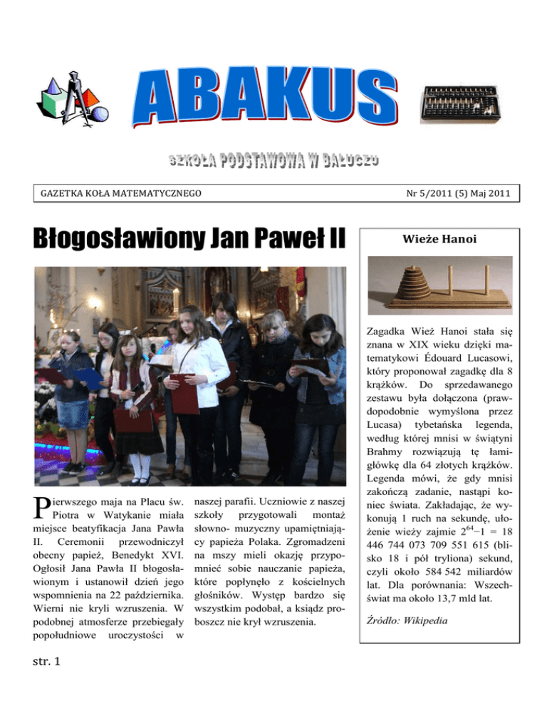 GAZETKA KOŁA MATEMATYCZNEGO Błogosławiony Jan Paweł II P ierwszego maja na Placu św. Piotra w Watykanie miała miejsce beatyfikacja Jana Pawła II. Ceremonii przewodniczył obecny papież, Benedykt XVI. Ogłosił Jana Pawła II błogosławionym i ustanowił dzień jego wspomnienia na 22 października. Wierni nie kryli wzruszenia. W podobnej atmosferze przebiegały popołudniowe uroczystości w str. 1 naszej parafii. Uczniowie z naszej szkoły przygotowali montaż słowno- muzyczny upamiętniający papieża Polaka. Zgromadzeni na mszy mieli okazję przypomnieć sobie nauczanie papieża, które popłynęło z kościelnych głośników. Występ bardzo się wszystkim podobał, a ksiądz proboszcz nie krył wzruszenia. Nr 5/2011 (5) Maj 2011 Wieże Hanoi Zagadka Wież Hanoi stała się znana w XIX wieku dzięki matematykowi Édouard Lucasowi, który proponował zagadkę dla 8 krążków. Do sprzedawanego zestawu była dołączona (prawdopodobnie wymyślona przez Lucasa) tybetańska legenda, według której mnisi w świątyni Brahmy rozwiązują tę łamigłówkę dla 64 złotych krążków. Legenda mówi, że gdy mnisi zakończą zadanie, nastąpi koniec świata. Zakładając, że wykonują 1 ruch na sekundę, ułożenie wieży zajmie 264−1 = 18 446 744 073 709 551 615 (blisko 18 i pół tryliona) sekund, czyli około 584 542 miliardów lat. Dla porównania: Wszechświat ma około 13,7 mld lat. Źródło: Wikipedia GAZETKA KOŁA MATEMATYCZNEGO Nr 5/2011 (5) Maj 2011 Wielcy matematycy SPORT W NASZEJ SZKOLE Luty Mistrzostwa Powiatu w Mini Piłce Koszykowej Dziewczęta IV miejsce Reprezentacja: Radziszewska Agnieszka, Wartalska Marta, Pluskwa Karolina,Sowała Noemi, Klimczak Karolina, Nowicka Marika, Supczyńska Marta, Zakrzewska Patrycja, Skurzewska Dominika, Hryniewiecka Justyna, Wróbel Agata. Chłopcy V miejsce Reprezentacja: Molenda Bartosz, Nastarowicz Mateusz, Grzanka Seweryn, Jagiełło Andrzej, Grzanka Rafał, Ciszewski Kacper, Grzanka Maciej, Maciejewski Krystian, Pietrzykowski Krzysztof, Manios Dawid, Olejnik Dawid, Taborowski Michał. Maj Mistrzostwa Powiatu w Mini Piłce Nożnej Dziewczęta II miejsce Reprezentacja: Wawszczak Katarzyna, Radziszewska Agnieszka, Wartalska Marta, Pluskwa Karolina, Sowała Noemi, Klimczak Karolina, Nowicka Marika, Supczyńska Marta, Zakrzewska Patrycja, Skurzewska Dominika, Hryniewiecka Justyna, Wróbel Agata. Chłopcy IX miejsce Reprezentacja: Molenda Bartosz, Nastarowicz Mateusz, Grzanka Seweryn, Jagiełło Andrzej, Grzanka Rafał, Kalinowski Jan, Ciszewski Kacper, Grzanka Maciej, Maciejewski Krystian, Manios Dawid, Olejnik Dawid, Taborowski Michał. To nie wszystko. Czytajcie później. str. 2 Rene Descartes (Kartezjusz)(1596- 1650) jest właściwie bardziej znany jako filozof niż matematyk. Niemniej był pionierem nowoczesnej matematyki. Urodził się we Francji, w małym miasteczku La Haye w Turenii. Po ukończeniu jezuickiego kolegium dla arystokratów studiował prawo. Mając 22 lata opuszcza Francję i służy jako oficerochotnik w wojskach różnych europejskich wodzów, biorących udział w wojnie trzydziestoletniej. W 1629 roku osiedlił się w Holandii, gdzie spędził prawie całą resztę swojego życia. Tam napisał wszystkie wielkie dzieła w dziedzinie filozofii, matematyki, fizyki, kosmologii i fizjologii. Swój dorobek w dziedzinie matematyki zebrał w jednym dziele „Geometria”. Po raz pierwszy wprowadził pojęcie współrzędnych prostokątnych, które poznajecie w klasie szóstej. Wprowadził znaki „+” i „-” dla oznaczenia liczb dodatnich i ujemnych oraz oznaczenie potęgi. Kartezjusz zmarł w Sztokholmie w Szwecji, spędziwszy tam ostatni rok swojego życia. GAZETKA KOŁA MATEMATYCZNEGO Nr 5/2011 (5) Maj 2011 Brawo dziewczęta z klasy VI! W tym roku szkolnym nasi uczniowie brali udział w dwóch zewnętrznych konkursach matematycznych. Były to: Ogólnopolska Olimpiada Matematyczna Olimpus i Powiatowe Potyczki Matematyczne. Wszyscy spisali się dobrze. Na szczególne wyróżnienie zasługują Martyna Radwańska i Agata Wróbel z klasy VI. Obie zostały laureatkami olimpiady Olimpu- sa, zajmując ex aequo IX miejsce w kraju. Duży sukces odniosła Martyna, zajmując w Potyczkach Matematycznych III miejsce w powiecie łaskim. Dziewczęta, oby to była dobra prognoza przed nauką w gimnazjum. Młodszym kolegom życzymy sukcesów w przyszłym roku. SUKCES NASZEJ UCZENNICY NA XV FESTIWALU PIOSENKI RELIGIJNEJ- ŁASKAWOŚĆ 2011 21 maja w sali widowiskowej Łaskiego Domu Kultury odbył się XV Festiwal Piosenki Religijnej „Łaskawość 2011”. W konkursie wzięły udział Noemi Sowała i Katarzyna Szymańska. Emocje, podobnie str. 3 jak konkurencja były duże. Dziewczyny zaśpiewały bardzo ładnie. W koncercie laureatów wystąpiła Noemi zdobywając wyróżnienie. Nie poddajemy się, w przyszłym roku będzie jeszcze lepiej! GAZETKA KOŁA MATEMATYCZNEGO Nr 5/2011 (5) Maj 2011 Złote myśli • Matematyka jest delikatnym kwiatem, który rośnie nie na każdej glebie i zakwita nie wiadomo kiedy i jak. Jean Fabre • Matematyka to niewzruszona opoka wszelkich nauk i życiodajny zdrój korzyści dla biegu ludzkich spraw. Isaac Barrow Autor: Bożena Salamaga • Matematyka jest jak Sąd Najwyższy. Od jej decyzji nie ma odwołania. Tobias Dantzig • Czysta matematyka to poezja logicznego Krzyżówka nr 5 myślenia. Albert Einstein 1 2 3 4 5 • Jeśli ludzie nie wierzą, że matematyka jest prosta, to tylko dlatego, że nie zdają sobie sprawy, jak skomplikowane jest życie. John von Neumann 6 7 8 • W matematyce nie rozumiemy rzeczy. Po prostu się do nich przyzwyczajamy. John von Neumann 1. 2. 3. 4. 5. 6. 7. 8. Na przykład 0,5. Wybitny polski astronom. „Kopnięty” kwadrat. Polski matematyk Wawrzyniec Ż… Różnica liczb 57 i 48. Skrócony zapis dodawania tych samych składników. Przyrząd do rysowania. Przyrząd do rysowania kątów prostych. Autorki: D. Skurzewska, K. Klimczak- klasa VI str. 4 • Żadna