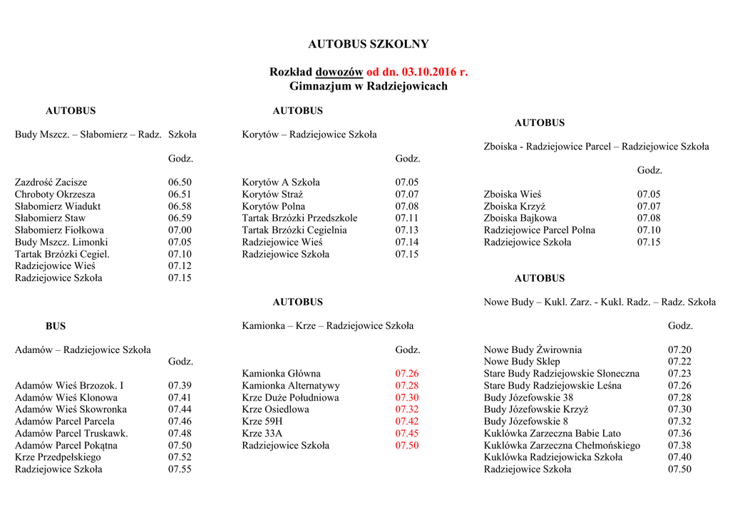 AUTOBUS SZKOLNY Rozkład dowozów od dn. 03.10.2016 r