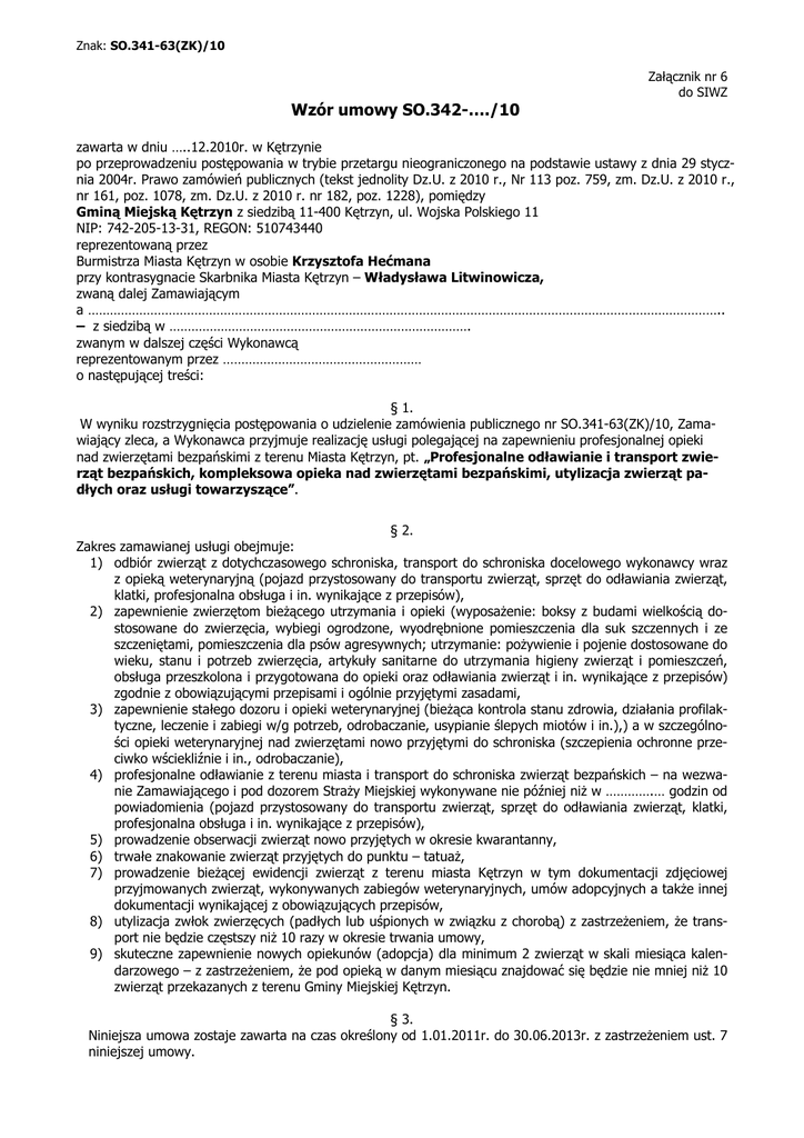 Znak: SO.341-63(ZK)/10 Załącznik nr 6 do SIWZ Wzór umowy SO.342-…./10 zawarta w dniu …..12.2010r. w Kętrzynie po przeprowadzeniu postępowania w trybie przetargu nieograniczonego na podstawie ustawy z dnia 29 stycznia 2004r. Prawo zamówień publicznych (tekst jednolity Dz.U. z 2010 r., Nr 113 poz. 759, zm. Dz.U. z 2010 r., nr 161, poz. 1078, zm. Dz.U. z 2010 r. nr 182, poz. 1228), pomiędzy Gminą Miejską Kętrzyn z siedzibą 11-400 Kętrzyn, ul. Wojska Polskiego 11 NIP: 742-205-13-31, REGON: 510743440 reprezentowaną przez Burmistrza Miasta Kętrzyn w osobie Krzysztofa Hećmana przy kontrasygnacie Skarbnika Miasta Kętrzyn – Władysława Litwinowicza, zwaną dalej Zamawiającym a ……………………………………………………………………………………………………………………………………………………….. – z siedzibą w ………………………………………………………………………. zwanym w dalszej części Wykonawcą reprezentowanym przez ……………………………………………… o następującej treści: § 1. W wyniku rozstrzygnięcia postępowania o udzielenie zamówienia publicznego nr SO.341-63(ZK)/10, Zamawiający zleca, a Wykonawca przyjmuje realizację usługi polegającej na zapewnieniu profesjonalnej opieki nad zwierzętami bezpańskimi z terenu Miasta Kętrzyn, pt. „Profesjonalne odławianie i transport zwierząt bezpańskich, kompleksowa opieka nad zwierzętami bezpańskimi, utylizacja zwierząt padłych oraz usługi towarzyszące”. § 2. Zakres zamawianej usługi obejmuje: 1) odbiór zwierząt z dotychczasowego schroniska, transport do schroniska docelowego wykonawcy wraz z opieką weterynaryjną (pojazd przystosowany do transportu zwierząt, sprzęt do odławiania zwierząt, klatki, profesjonalna obsługa i in. wynikające z przepisów), 2) zapewnienie zwierzętom bieżącego utrzymania i opieki (wyposażenie: boksy z budami wielkością dostosowane do zwierzęcia, wybiegi ogrodzone, wyodrębnione pomieszczenia dla suk szczennych i ze szczeniętami, pomieszczenia dla psów agresywnych; utrzymanie: pożywienie i pojenie dostosowane do wieku, stanu i potrzeb zwierzęcia, artykuły sanitarne do utrzymania higieny zwierząt i pomieszczeń, obsługa przeszkolona i przygotowana do opieki oraz odławiania zwierząt i in. wynikające z przepisów) zgodnie z obowiązującymi przepisami i ogólnie przyjętymi zasadami, 3) zapewnienie stałego dozoru i opieki weterynaryjnej (bieżąca kontrola stanu zdrowia, działania profilaktyczne, leczenie i zabiegi w/g potrzeb, odrobaczanie, usypianie ślepych miotów i in.),) a w szczególności opieki weterynaryjnej nad zwierzętami nowo przyjętymi do schroniska (szczepienia ochronne przeciwko wściekliźnie i in., odrobaczanie), 4) profesjonalne odławianie z terenu miasta i transport do schroniska zwierząt bezpańskich – na wezwanie Zamawiającego i pod dozorem Straży Miejskiej wykonywane nie później niż w ………….… godzin od powiadomienia (pojazd przystosowany do transportu zwierząt, sprzęt do odławiania zwierząt, klatki, profesjonalna obsługa i in. wynikające z przepisów), 5) prowadzenie obserwacji zwierząt nowo przyjętych w okresie kwarantanny, 6) trwałe znakowanie zwierząt przyjętych do punktu – tatuaż, 7) prowadzenie bieżącej ewidencji zwierząt z terenu miasta Kętrzyn w tym dokumentacji zdjęciowej przyjmowanych zwierząt, wykonywanych zabiegów weterynaryjnych, umów adopcyjnych a także innej dokumentacji wynikającej z obowiązujących przepisów, 8) utylizacja zwłok zwierzęcych (padłych lub uśpionych w związku z chorobą) z zastrzeżeniem, że transport nie będzie częstszy niż 10 razy w okresie trwania umowy, 9) skuteczne zapewnienie nowych opiekunów (adopcja) dla minimum 2 zwierząt w skali miesiąca kalendarzowego – z zastrzeżeniem, że pod opieką w danym miesiącu znajdować się będzie nie mniej niż 10 zwierząt przekazanych z terenu Gminy Miejskiej Kętrzyn. § 3. Niniejsza umowa zostaje zawarta na czas określony od 1.01.2011r. do 30.06.2013r. z zastrzeżeniem ust. 7 niniejszej umowy. § 4. 1. Strony ustalają wartość szacunkową wynagrodzenia za wykonanie zadania na kwotę ………………………………………………. zł brutto, przy czym wartość zrealizowanych w danym roku kalendarzowym działań nie może być wyższa niż kwota zabezpieczona w budżecie miasta. 2. Szczegółowe rozliczenie wynagrodzenia należnego Wykonawcy za realizację usługi opisanej w § 2 niniejszej umowy ustalane będzie na podstawie faktycznie zleconych i zrealizowanych działań oraz zatwierdzonych kalkulacji sporządzanych w oparciu o poniższe stawki: 1. Przejęcie zwierząt ze schroniska: Zadanie L.p 1) 2) L.p 1) odbiór zwierząt z dotychczasowego schroniska, transport do schroniska docelowego wraz z opieką (pojazd przystosowany do transportu zwierząt, sprzęt do odławiania zwierząt, klatki, profesjonalna obsługa i in. wynikające z przepisów), opieka weterynaryjna dla zwierząt przewiezionych do schroniska docelowego, 2. Odławianie na zlecenie Zamawiającego, utylizacja: Zadanie 3) profesjonalne odławianie z terenu miasta i transport do schroniska zwierząt bezpańskich (pojazd przystosowany do transportu zwierząt, sprzęt do odławiania zwierząt, klatki, profesjonalna obsługa i in. wynikające z przepisów) – na wezwanie jednostkowe Zamawiającego celem eliminacji zagrożenia sanitarnoepizootycznego w wykonane w ………….. godzin od powiadomienia zapewnienie stałego dozoru i opieki weterynaryjnej nad zwierzętami nowo przyjętymi do schroniska (szczepienia ochronne przeciwko wściekliźnie i in., odrobaczanie), prowadzenie obserwacji zwierząt nowo przyjętych w okresie kwarantanny, 4) 5) trwałe znakowanie zwierząt przyjętych do punktu – czopowanie/tatuaż, utylizacja zwłok zwierzęcych (padłych lub uśpionych w związku z chorobą) 2) 3. Utrzymanie zwierz