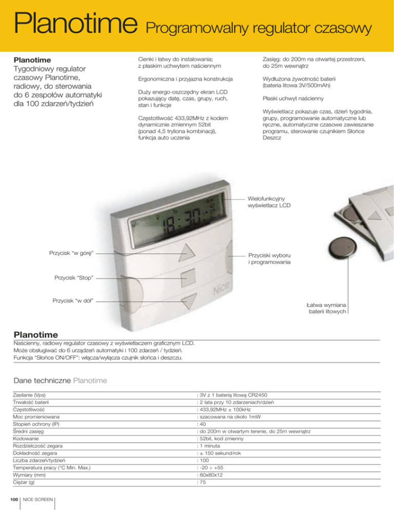 Planotime Programowalny regulator czasowy Planotime Tygodniowy regulator czasowy Planotime, radiowy, do sterowania do 6 zespołów automatyki dla 100 zdarzeń/tydzień Cienki i łatwy do instalowania; z płaskim uchwytem naściennym Zasięg: do 200m na otwartej przestrzeni, do 25m wewnątrz Ergonomiczna i przyjazna konstrukcja Wydłużona żywotność baterii (bateria litowa 3V/500mAh) Duży energo-oszczędny ekran LCD pokazujący datę, czas, grupy, ruch, stan i funkcje Płaski uchwyt naścienny Wyświetlacz pokazuje czas, dzień tygodnia, grupy, programowanie automatyczne lub ręczne, automatyczne czasowe zawieszanie programu, sterowanie czujnikiem Słońce Deszcz Częstotliwość 433,92MHz z kodem dynamicznie zmiennym 52bit (ponad 4,5 tryliona kombinacji), funkcja auto uczenia Wielofunkcyjny wyświetlacz LCD Przycisk “w górę” Przyciski wyboru i programowania Przycisk “Stop” Przycisk “w dół” Łatwa wymiana baterii litowych Planotime Naścienny, radiowy regulator czasowy z wyświetlaczem graficznym LCD. Może obsługiwać do 6 urządzeń automatyki i 100 zdarzeń / tydzień. Funkcja “Słońce ON/OFF”: włącza/wyłącza czujnik słońca i deszczu. € 109,50 Dane techniczne Planotime Zasilanie (Vps) : 3V z 1 baterią litową CR2450 Trwałość baterii Częstotliwość : 2 lata przy 10 zdarzeniach/dzień Moc promieniowana : szacowana na około 1mW Stopień ochrony (IP) : 40 Średni zasięg Kodowanie : do 200m w otwartym terenie, do 25m wewnątrz Rozdzielczość zegara : 1 minuta Dokładność zegara Liczba zdarzeń/tydzień : ± 150 sekund/rok : 100 Temperatura pracy (°C Min. Max.) : -20 ÷ +55 Wymiary (mm) : 80x80x12 Ciężar (g) : 75 100 NICE SCREEN : 433,92MHz ± 100kHz : 52bit, kod zmienny Solar: czas wschodu i zachodu słońca w ciągu roku się zmienia: Czy jest możliwe budzenie się zawsze przy tym samym oświetleniu pokoju, opuszczanie rolet lub zwijanie markiz wieczorem, dokładnie w czasie zachodu słońca, bez konieczności przeprogramowania zdarzenia odpowiednio do zmian pór roku? Planotime automatycznie się dostosuje do zmian czasu wschodu i zachodu słońca poprzez proste wprowadzenie szerokości geograficznej podczas pierwszego programowania urządzenia! Otwieranie częściowe: umożliwia częściowe otwieranie lub zamykanie rolety poprzez proste ustawienie czasu otwierania, tak, by zawsze uzyskać prawidłowe oświetlenie. NiceTime: jest używany do przerywania cyklu automatycznego i przełączania do trybu ręcznego na czas zaprogramowany przez użytkownika. Na przykład, dla mycia okien można zaprogramować system aby zawiesił wykonywanie wszystkich ustalonych operacji automatycznych i przełączyć do trybu ręcznego na ustalony czas. Gdy ten czas upłynie, system ponownie przełączy się na działanie automatyczne. MemoGroup: umożliwia jednoczesne sterowanie do 6 niezależnych grup automatyki, włączanie wielu silników i przydzielanie im różnych funkcji; na przykład uaktywnianie funkcji “Słońce” tylko dla rolet w sypialni, a funkcji losowej “Random” dla rolet od strony ulicy. Sun ON/OFF: włącza/wyłącza czujnik słońca i deszczu, umożliwiając ustalenie, które urządzenia związane z czujnikiem wiatru powinny reagować również na zmiany światła słonecznego. Ta funkcja jest również zastosowana w mocowanych na ścianie nadajnikach Plano4, w przenośnych nadajnikach Ergo4 i w serii NiceWay. Random: otwiera i zamyka rolety losowo w ustalonym zakresie czasu, symulując obecność domowników, zniechęcając do prób włamania. AKCESORIA CENTRALE SYST.STEROWANIA ELEKTR. PROW. STER. SILNIKI DO ROLET I AKCESORIA AKCESORIA SILNIKI RUROWE PROWADNICA SILNIKOW RUR. Wszystkie funkcje Planotime Program Easy: powoduje, że programowanie dużej liczby zdarzeń jest wyjątkowo łatwe; system prowadzi dziennik działań uruchamianych przez użytkownika w ciągu tygodnia, a następnie powtarza je w trybie automatycznym w następnych tygodniach! Auto REC Man Prog NEWMOD TTBUS DELCOPY Su Mo Tu We Th Fr Sa SW 1 4 ON 2 5 OFF 3 6 NICE SCREEN 101