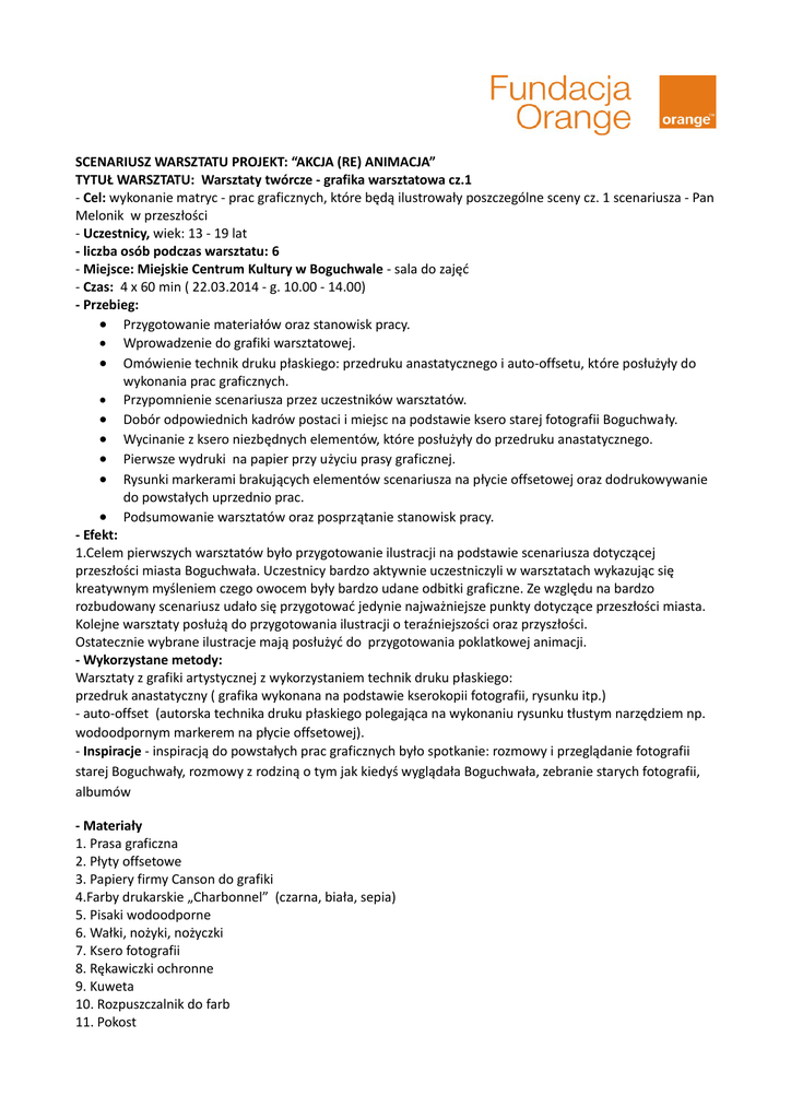 SCENARIUSZ WARSZTATU PROJEKT: “AKCJA (RE) ANIMACJA” TYTUŁ WARSZTATU: Warsztaty twórcze - grafika warsztatowa cz.1 - Cel: wykonanie matryc - prac graficznych, które będą ilustrowały poszczególne sceny cz. 1 scenariusza - Pan Melonik w przeszłości - Uczestnicy, wiek: 13 - 19 lat - liczba osób podczas warsztatu: 6 - Miejsce: Miejskie Centrum Kultury w Boguchwale - sala do zajęć - Czas: 4 x 60 min ( 22.03.2014 - g. 10.00 - 14.00) - Przebieg: · Przygotowanie materiałów oraz stanowisk pracy. · Wprowadzenie do grafiki warsztatowej. · Omówienie technik druku płaskiego: przedruku anastatycznego i auto-offsetu, które posłużyły do wykonania prac graficznych. · Przypomnienie scenariusza przez uczestników warsztatów. · Dobór odpowiednich kadrów postaci i miejsc na podstawie ksero starej fotografii Boguchwały. · Wycinanie z ksero niezbędnych elementów, które posłużyły do przedruku anastatycznego. · Pierwsze wydruki na papier przy użyciu prasy graficznej. · Rysunki markerami brakujących elementów scenariusza na płycie offsetowej oraz dodrukowywanie do powstałych uprzednio prac. · Podsumowanie warsztatów oraz posprzątanie stanowisk pracy. - Efekt: 1.Celem pierwszych warsztatów było przygotowanie ilustracji na podstawie scenariusza dotyczącej przeszłości miasta Boguchwała. Uczestnicy bardzo aktywnie uczestniczyli w warsztatach wykazując się kreatywnym myśleniem czego owocem były bardzo udane odbitki graficzne. Ze względu na bardzo rozbudowany scenariusz udało się przygotować jedynie najważniejsze punkty dotyczące przeszłości miasta. Kolejne warsztaty posłużą do przygotowania ilustracji o teraźniejszości oraz przyszłości. Ostatecznie wybrane ilustracje mają posłużyć do przygotowania poklatkowej animacji. - Wykorzystane metody: Warsztaty z grafiki artystycznej z wykorzystaniem technik druku płaskiego: przedruk anastatyczny ( grafika wykonana na podstawie kserokopii fotografii, rysunku itp.) - auto-offset (autorska technika druku płaskiego polegająca na wykonaniu rysunku tłustym narzędziem np. wodoodpornym markerem na płycie offsetowej). - Inspiracje - inspiracją do powstałych prac graficznych było spotkanie: rozmowy i przeglądanie fotografii starej Boguchwały, rozmowy z rodziną o tym jak kiedyś wyglądała Boguchwała, zebranie starych fotografii, albumów - Materiały 1. Prasa graficzna 2. Płyty offsetowe 3. Papiery firmy Canson do grafiki 4.Farby drukarskie „Charbonnel” (czarna, biała, sepia) 5. Pisaki wodoodporne 6. Wałki, nożyki, nożyczki 7. Ksero fotografii 8. Rękawiczki ochronne 9. Kuweta 10. Rozpuszczalnik do farb 11. Pokost - Partnerzy - Wydział Sztuki Uniwersytetu Rzeszowskiego, Gminna Biblioteka Publiczna w Boguchwale, Urząd Miejski w Boguchwale, Gimnazjum im.ks. ppłk. Żytkiewicza w Boguchwale - Opis organizatora : Miejskie Centrum Kultury w Boguchwale - dom kultury - Kontakt: 17 8715357, www.facebook.com/mckboguchwala, www.boguchwala.pl Projekt realizowany w ramach programu Fundacji Orange. Materiał dostępny na licencji Creative Commons Uznanie autorstwa 3.0 Polska (licencja dostępna pod adresem: creativecommons.org/licenses/by/3.0/pl