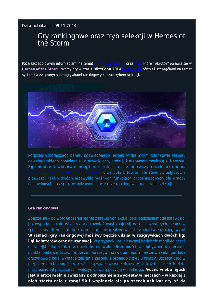 Data publikacji : 09.11.2014 Gry rankingowe oraz tryb selekcji w Heroes of the Storm Poza szczegółowymi informacjami na temat nowych bohaterów oraz map, które "wkrótce" pojawią się w Heroes of the Storm, twórcy gry w czasie BlizzConu 2014 podzielili się również szczegółami na temat systemów związanych z rozgrywkami rankingowymi oraz trybem selekcji. Podczas wczorajszego panelu poświęconego Heroes of the Storm członkowie zespołu deweloperskiego opowiedzieli o nowościach, które już niebawem zawitają w Nexusie. Zgromadzeni widzowie mogli nie tylko po raz pierwszy rzucić okiem na dopracowywanych właśnie bohaterów oraz pola bitewne, ale również usłyszeć z pierwszej ręki o dwóch niezwykle ważnych funkcjach przeznaczonych dla graczy nastawionych na aspekt współzawodnictwa: grze rankingowej oraz trybie selekcji. Gra rankingowa Zgadza się – po wprowadzeniu jednej z przyszłych aktualizacji będziecie mogli sprawdzić, jak wypadacie (nie tylko wy, ale również wasi znajomi) na tle pozostałych członków społeczności Heroes of the Storm, i spróbować sił we współzawodnictwie rankingowym! W ramach gry rankingowej możliwy będzie udział w rozgrywkach dwóch lig: ligi bohaterów oraz drużynowej. W przypadku tej pierwszej będziecie mogli dołączać do kolejki solo, a także w drużynie o dowolnej liczebności, a zdobywane w meczach punkty będą się liczyć na poczet waszego indywidualnego miejsca w rankingu. Liga drużynowa z kolei wymaga zebrania zespołu złożonego z pięciu graczy. Uczestnicząc w niej, będziecie mogli tworzyć i nazywać własne drużyny, a każda z nich będzie niezależnie od pozostałych walczyć o swoją pozycję w rankingu. Awans w obu ligach jest nierozerwalnie związany z odnoszeniem zwycięstw w meczach – w każdej z nich startujecie z rangi 50 i wspinacie się po szczeblach kariery aż do upragnionej przez wszystkich zawodników rangi 1. Tryb selekcji Na tym jednak nie kończą się emocje! Wprowadzimy również tryb selekcji, który stanowi nieodłączny element gry rankingowej. Przed rozpoczęciem starć rankingowych członkowie waszej drużyny oraz przeciwnicy będą w czasie rzeczywistym na przemian wybierać bohaterów, aby skoordynować składy zespołów. Dowiecie się również z wyprzedzeniem, na którym polu bitewnym zostanie rozegrane starcie, i będziecie musieli ściśle współpracować z pozostałymi członkami waszej drużyny, aby dobrać optymalnych bohaterów i opracować skuteczną strategię. Ponadto dodamy tryb selekcji jako jedną z opcji w grach dowolnych, tak abyście mogli trenować poza starciami rankingowymi zgodnie z własnymi preferencjami. W nadchodzących tygodniach będziemy mieć dla was dużo więcej informacji dotyczących gry rankingowej oraz trybu selekcji. Tymczasem przypominamy wszystkim, którzy przegapili panel poświęcony nowościom w Heroes of the Storm, że mogą go obejrzeć w każdej chwili jako powtórka na żądanie dzięki wirtualnemu biletowi na BlizzCon 2014. Źródło: Battle.net Autor: Sigmar Data publikacji : 09.11.2014 Data modyfikacji : 09.11.2014 Tagi: Heroes of the Storm, Gra rankingowa, BlizzCon 2014, tryb selekcji Liczba wyświetleń strony: 4918 Komentarz (2) dodaj komentarz nic nowego w sumie nie powiedzieli , mogoli to szybiciej powiedziec ze bedzie tak jak w lolu :D~tanato 2014/11/09 20:54 Nie w lolu tylko w każdej grze moba~krzelo 2014/11/10 11:18 dodaj komentarz Pozostałe nowości DreamHack Open: Valencia 2016 - Nerchio w półfinale - live! DreamHack Valencia to jedno z największych e-sportowych wydarzeń w Europie - dlatego nie mogło zabraknąć na nim StarCrafta II! W czasie rozgrywek 96 graczy będzie konkurować o 50 000 USD oraz 5 000 punktów WCS.Data publikacji: 16.07.20161 Aktualizacja 3.4 – Duże zmiany w rankingu StarCrafta II Na oficjalnym blogu Blizzarda pojawił się nowy wpis dotyczący tym razem zmian w rankingach: Ranking StarCrafta II jest areną dla niezwykle zaciętej rywalizacji. Do walki rusza wielu uczestników, ale tylko nieliczni awansują do ścisłej czołówki.Data publikacji: 03.07.20160 Rozpoczęcie trzeciego sezonu rankingowego 2016 Trzeci sezon tegorocznych rozgrywek ligowych w StarCrafta II uważamy za otwarty! Zresetowano pulę punktów premiowych oraz rankingi i przyznano nagrody za sezon drugi roku 2016.Data publikacji: 26.06.20160 Filmowy „Warcraft” już wkrótce w księgarniach! Powieść „Warcraft”, której wydanie zbiega się z polską premierą filmu „Warcraft. Początek” w reżyserii Duncana Jonesa, do księgarń trafi już 15 czerwca. Na kartach książki czytelnicy wkroczą w nowy wymiar emocji towarzyszących bohaterom fikcyjnych światów Azeroth i Draenor. Za sprawą Christie Golden, pisarki od lat cenionej przez fanów świata Warcraft, konflikt ludzi i orków nabierze jeszcze większej intensywności.Data publikacji: 13.06.20160 Blokada obecnego sezonu i darmowa zmiana nazwy postaci Jak czytamy na oficjalnym blogu Blizzarda: Obecny sezon rankingowy zbliża się ku końcowi i wkrótce zamknięte zostaną wszystkie ligi i dywizje. Kilka dni przed rozpoczęciem nowego sezonu, darmowa zmiana nazwy postaci w StarCraft II zostanie ponownie dodana do wszystkich kont, dla których funkcja ta nie jest obecnie dostępna.Data publikacji: 12.06.20160 Wszystkie nowości
