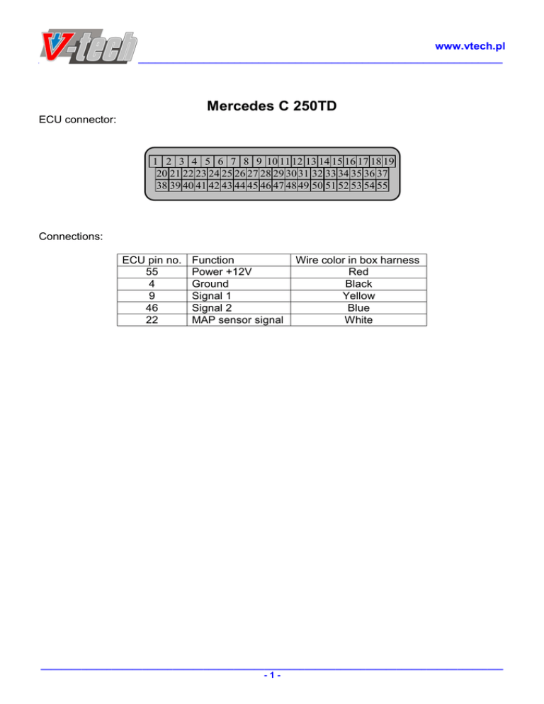 www.vtech.pl ____________________________________________________________________________ Mercedes C 250TD ECU connector: 1 2 3 4 5 6 7 8 9 10 11 12 13 14 15 16 17 18 19 20 21 22 23 24 25 26 27 28 29 30 31 32 33 34 35 36 37 38 39 40 41 42 43 44 45 46 47 48 49 50 51 52 53 54 55 Connections: ECU pin no. 55 4 9 46 22 Function Power +12V Ground Signal 1 Signal 2 MAP sensor signal Wire color in box harness Red Black Yellow Blue White ___________________________________________________________________________________________ -1-
