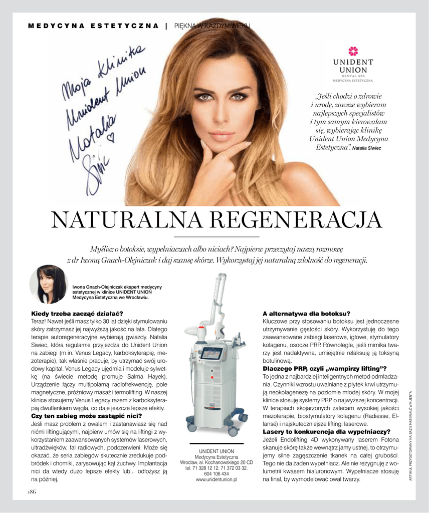 m e d y c y n a e s t e t y c z n a | piękna w każdym wieku „Jeśli chodzi o zdrowie i urodę, zawsze wybieram najlepszych specjalistów i tym samym kierowałam się, wybierając klinikę Unident Union Medycyna Estetyczna”. Natalia Siwiec naturalna regeneracja Myślisz o botoksie, wypełniaczach albo niciach? Najpierw przeczytaj naszą rozmowę z dr Iwoną Gnach-Olejniczak i daj szansę skórze. Wykorzystaj jej naturalną zdolność do regeneracji. Kiedy trzeba zacząć działać? Teraz! Nawet jeśli masz tylko 30 lat dzięki stymulowaniu skóry zatrzymasz jej najwyższą jakość na lata. Dlatego terapie autoregeneracyjne wybierają gwiazdy. Natalia Siwiec, która regularnie przyjeżdża do Unident Union na zabiegi (m.in. Venus Legacy, karboksyterapię, mezoterapie), tak właśnie pracuje, by utrzymać swój urodowy kapitał. Venus Legacy ujędrnia i modeluje sylwetkę (na świecie metodę promuje Salma Hayek). Urządzenie łączy multipolarną radiofrekwencję, pole magnetyczne, próżniowy masaż i termolifting. W naszej klinice stosujemy Venus Legacy razem z karboksyterapią dwutlenkiem węgla, co daje jeszcze lepsze efekty. Czy ten zabieg może zastąpić nici? Jeśli masz problem z owalem i zastanawiasz się nad nićmi liftingującymi, najpierw umów się na liftingi z wykorzystaniem zaawansowanych systemów laserowych, ultradźwięków, fal radiowych, podczerwieni. Może się okazać, że seria zabiegów skutecznie zredukuje podbródek i chomiki, zarysowując kąt żuchwy. Implantacja nici da wtedy dużo lepsze efekty lub... odłożysz ją na później. 186 UNIDENT UNION Medycyna Estetyczna Wrocław, al. Kochanowskiego 20 CD tel. 71 328 12 12, 71 372 03 32, 604 106 434 www.unidentunion.pl A alternatywa dla botoksu? Kluczowe przy stosowaniu botoksu jest jednoczesne utrzymywanie gęstości skóry. Wykorzystuję do tego zaawansowane zabiegi laserowe, igłowe, stymulatory kolagenu, osocze PRP. Równolegle, jeśli mimika twarzy jest nadaktywna, umiejętnie relaksuję ją toksyną botulinową. Dlaczego PRP, czyli „wampirzy lifting”? To jedna z najbardziej inteligentnych metod odmładzania. Czynniki wzrostu uwalniane z płytek krwi utrzymują neokolagenezę na poziomie młodej skóry. W mojej klinice stosuję systemy PRP o najwyższej koncentracji. W terapiach skojarzonych zalecam wysokiej jakości mezoterapie, biostymulatory kolagenu (Radiesse, Ellansé) i najskuteczniejsze liftingi laserowe. Lasery to konkurencja dla wypełniaczy? Jeżeli Endolifting 4D wykonywany laserem Fotona skanuje skórę także wewnątrz jamy ustnej, to otrzymujemy silne zagęszczenie tkanek na całej grubości. Tego nie da żaden wypełniacz. Ale nie rezygnuję z wolumetrii kwasem hialuronowym. Wypełniacze stosuję na finał, by wymodelować owal twarzy. Artykuł przygotowany na bazie materiałów klienta Iwona Gnach-Olejniczak ekspert medycyny estetycznej w klinice UNIDENT UNION Medycyna Estetyczna we Wrocławiu.
