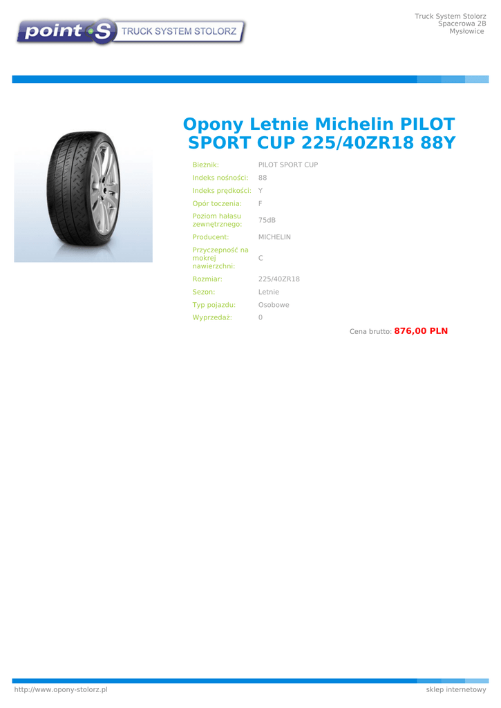 Truck System Stolorz Spacerowa 2B Mysłowice Opony Letnie Michelin PILOT SPORT CUP 225/40ZR18 88Y Bieżnik: PILOT SPORT CUP Indeks nośności: 88 Indeks prędkości: Y Opór toczenia: F Poziom hałasu zewnętrznego: 75dB Producent: MICHELIN Przyczepność na mokrej nawierzchni: C Rozmiar: 225/40ZR18 Sezon: Letnie Typ pojazdu: Osobowe Wyprzedaż: 0 Cena brutto: http://www.opony-stolorz.pl 876,00 PLN sklep internetowy