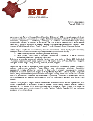 Informacja prasowa Poznań, 24.03.2009 Marcowa edycja Targów Obuwia, Skóry i Wyrobów Skórzanych BTS po raz pierwszy odbyła się w zmienionym terminie, niezaleŜnie od targów dla branŜy odzieŜowo-tekstylnej. Dzięki tej zmianie producenci, importerzy i handlowcy działający w sektorze obuwniczo-skórzanym mogli uczestniczyć zarówno w targach w Poznaniu, jak i w licznych zagranicznych wydarzeniach handlowych. Targi BTS odwiedziło blisko 2 000 profesjonalistów między innymi z Polski, Litwy, Niemiec, Wielkiej Brytanii, Włoch, Rosji, Finlandii, Francji, Hiszpanii, Grecji, Białorusi i Łotwy. Goście targowi pozytywnie ocenili zmianę wizerunku wydarzenia – nową stylistykę oraz aranŜację opartą na dwóch obszarach tematycznych odpowiadających sektorom branŜy: • Trend – kolekcji obuwia, odzieŜy i galanterii skórzanej • Tech –skóry, komponenty i akcesoria obuwnicze i kaletnicze, a takŜe maszyny technologie dla branŜy obuwniczo-skórzanej. Zmieniona aranŜacja ekspozycji ułatwiła handlowcom orientację w blisko 200 kolekcjach i markach prezentowanych przez wystawców z 15 krajów, m.in. z Polski, Niemiec, Hiszpanii, Portugalii, Włoch, Belgii, Grecji, Szwecji, Holandii, Czech, Węgier. Ekspozycji na stoiskach wystawców towarzyszyły dynamiczne prezentacje obuwia i galanterii podczas codziennych pokazów Fashion&Time oraz interesujące szkolenia. Specjaliści przedstawili metody efektywnej promocji w Internecie i strategie nawiązywania kontaktu z klientem. Gościem marcowych targów BTS był Lucio Righetto – włoski stylista i projektant obuwia, który omówił tendencje w modzie obuwniczej na sezony jesień-zima 2009/2010 i wiosnalato 2010. Prezentacja tendencji we wzornictwie, kolorystyce i materiałach wzbogacona została planszami trendów przygotowanymi w oparciu o próbki najlepszych włoskich skór do produkcji obuwia. Podczas uroczystej Gali Nagród Złotym Medalem MTP uhonorowanych zostało 9 produktów, dwa stoiska nagrodzono w konkursie Acanthus Aureus. WyróŜnienia odebrali równieŜ laureaci konkursu o Złoty Obcas 2009 przygotowanego przez magazyn „Świat Butów” oraz konkursu zorganizowanego przez wydawnictwo Promedia Fashion Website Awards 2009 na najlepszą branŜową stronę internetową. 1 Produkty nagrodzone Złotym Medalem MTP BTS Targi Obuwia Skóry i Wyrobów Skórzanych wiosna 2009 1. Kozaki damskie wzór 206 CARSONA Małgorzata Brzozowska, Warszawa Pawilon 3A stoisko 25 2. Półbuty męskie wzór 2105 Przedsiębiorstwo Produkcyjno- Handlowe TRIO – SKORPION E.A. Mielewczyk , Słupsk Pawilon 3A stoisko 28 3. Męskie obuwie wizytowe wzór 5600 Zakład Produkcji Obuwia FABER Krzysztof Faber , Zebrzydowice Pawilon 3A stoisko 26 4. Awangardowa torebka IZA Zespół Szkół Zawodowych im. J. Kilińskiego, Radom Pawilon 3 stoisko 7 5. Kurtka męska skórzana ARMANDO PERFEKT LEATHER Wyrób i SprzedaŜ OdzieŜy Skórzanej Marcin Mąkosa, Radom Pawilon 3A stoisko 86 6. Skóra bydlęca CANNAWARO Garbarnia Kazimierz Dusiński, Marki Zgłaszający: Przedsiębiorstwo Skórzane K.K. Gołębiewscy, Marki Pawilon 3 stoisko 9A 7. Obuwie damskie wzór 652 ŁUKBUT Sp. z o.o., Łuków Pawilon 3 stoisko 106 8. Wzór trzewika damskiego DOMINIKA Politechnika Radomska Wydział Materiałoznawstwa Technologii i Wzornictwa, Radom Zgłaszający : Katedra Wzornictwa Obuwia i OdzieŜy student Wojciech Grudziński, Radom Pawilon 3 stoisko 22 9. Wzór półbuta męskiego WALERY Politechnika Radomska Wydział Materiałoznawstwa Technologii i Wzornictwa, Radom Zgłaszający: Katedra Wzornictwa Obuwia i OdzieŜy, Radom Studentka Paulina Krawczyk Pawilon 3 stoisko 22 2 Stoiska nagrodzone w konkursie Acanthus Aureus BTS Targi Obuwia Skóry i Wyrobów Skórzanych wiosna 2009 1. 2. MENBUR Polska Sp. z o.o. Pawilon 3A stoisko 18 MB Market Ltd Sp. z o.o. Pawilon 3 stoisko 66 Kolejna edycja Targów Obuwia, Skóry i Wyrobów Skórzanych BTS z kolekcjami na sezon wiosnalato 2010 oraz aktualizacją wzorów na sezon jesień-zima 2009/2010 odbędzie się w dniach 16-18 listopada 2009 na terenie Międzynarodowych Targów Poznańskich. 3
