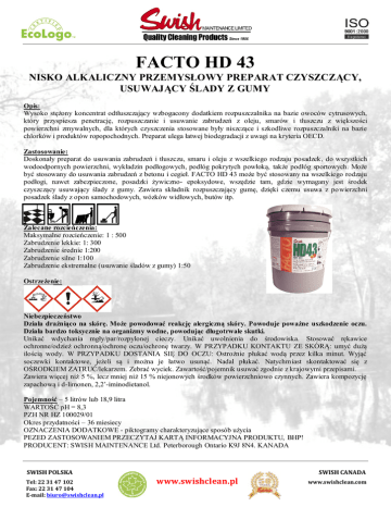 FACTO HD 43 NISKO ALKALICZNY PRZEMYSŁOWY PREPARAT CZYSZCZĄCY, USUWAJĄCY ŚLADY Z GUMY Opis: Wysoko stężony koncentrat odtłuszczający wzbogacony dodatkiem rozpuszczalnika na bazie owoców cytrusowych, który przyspiesza penetrację, rozpuszczanie i usuwanie zabrudzeń z oleju, smarów i tłuszczu z większości powierzchni zmywalnych, dla których czyszczenia stosowane były niszczące i szkodliwe rozpuszczalniki na bazie chlorków i produktów ropopochodnych. Preparat ulega łatwej biodegradacji z uwagi na kryteria OECD. Zastosowanie: Doskonały preparat do usuwania zabrudzeń i tłuszczu, smaru i oleju z wszelkiego rodzaju posadzek, do wszystkich wodoodpornych powierzchni, wykładzin podłogowych, podłóg pokrytych powłoką, także podłóg sportowych. Może być stosowany do usuwania zabrudzeń z betonu i cegieł. FACTO HD 43 może być stosowany na wszelkiego rodzaju podłogi, nawet zabezpieczone, posadzki żywiczno- epoksydowe, wszędzie tam, gdzie wymagany jest środek czyszczący usuwający ślady z gumy. Zawiera składnik rozpuszczający gumę, dzięki czemu usuwa z powierzchni posadzek ślady z opon samochodowych, wózków widłowych, butów itp. Zalecane rozcieńczenia: Maksymalne rozcieńczenie: 1 : 500 Zabrudzenie lekkie: 1: 300 Zabrudzenie średnie 1:200 Zabrudzenie silne 1:100 Zabrudzenie ekstremalne (usuwanie śladów z gumy) 1:50 Ostrzeżenie: Niebezpieczeństwo Działa drażniąco na skórę. Może powodować reakcję alergiczną skóry. Powoduje poważne uszkodzenie oczu. Działa bardzo toksycznie na organizmy wodne, powodując długotrwałe skutki. Unikać wdychania mgły/par/rozpylonej cieczy. Unikać uwolnienia do środowiska. Stosować rękawice ochronne/odzież ochronną/ochronę oczu/ochronę twarzy. W PRZYPADKU KONTAKTU ZE SKÓRĄ: umyć dużą ilością wody. W PRZYPADKU DOSTANIA SIĘ DO OCZU: Ostrożnie płukać wodą przez kilka minut. Wyjąć soczewki kontaktowe, jeżeli są i można je łatwo usunąć. Nadal płukać. Natychmiast skontaktować się z OŚRODKIEM ZATRUĆ/lekarzem. Zebrać wyciek. Zawartość/pojemnik usuwać zgodnie z krajowymi przepisami. Zawiera więcej niż 5 %, lecz mniej niż 15 % niejonowych środków powierzchniowo czynnych. Zawiera kompozycję zapachową i d-limonen, 2,2’-iminodietanol. Pojemność – 5 litrów lub 18,9 litra WARTOŚĆ pH = 8,3 PZH NR HZ 100029/01 Okres przydatności – 36 miesiecy OZNACZENIA DODATKOWE - piktogramy charakteryzujące sposób użycia PEZED ZASTOSOWANIEM PRZECZYTAJ KARTĄ INFORMACYJNA PRODUKTU, BHP! PRODUCENT: SWISH MAINTENANCE Ltd. Peterborough Ontario K9J 8N4. KANADA SWISH POLSKA Tel: 22 31 47 102 Fax: 22 31 47 104 E-mail: [email protected] SWISH CANADA www.swishclean.pl www.swishclean.com