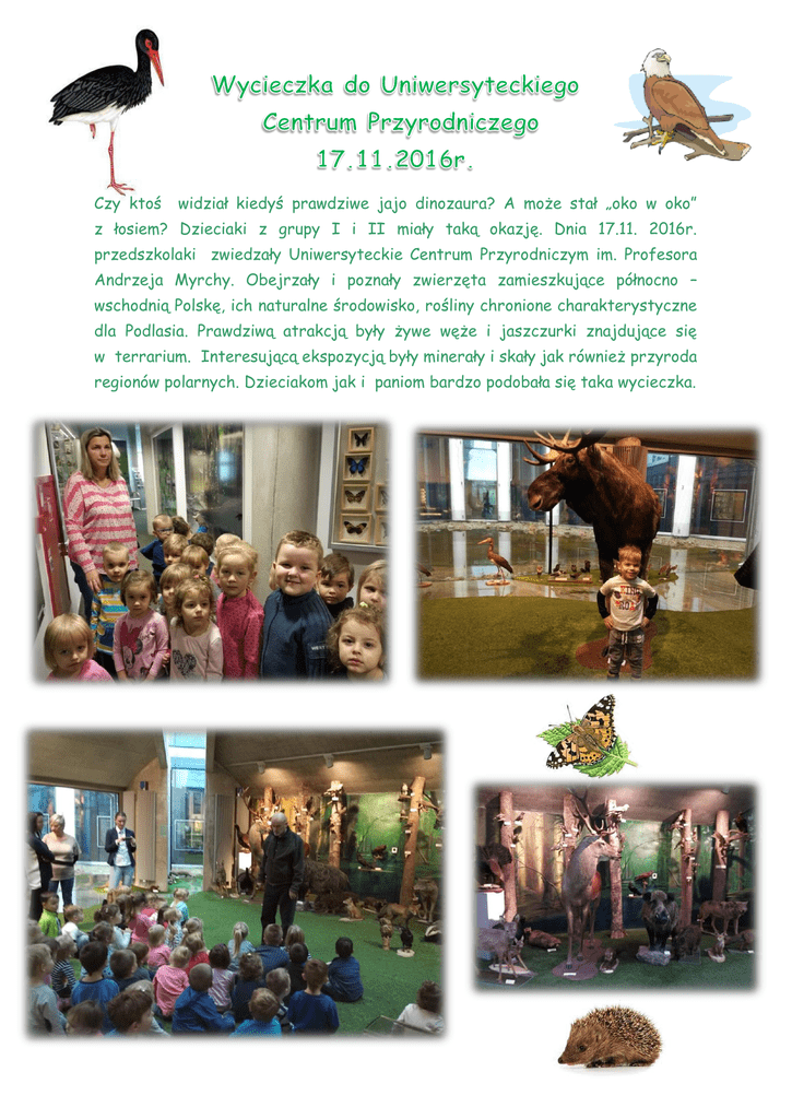 Czy ktoś widział kiedyś prawdziwe jajo dinozaura? A może stał „oko w oko” z łosiem? Dzieciaki z grupy I i II miały taką okazję. Dnia 17.11. 2016r. przedszkolaki zwiedzały Uniwersyteckie Centrum Przyrodniczym im. Profesora Andrzeja Myrchy. Obejrzały i poznały zwierzęta zamieszkujące północno – wschodnią Polskę, ich naturalne środowisko, rośliny chronione charakterystyczne dla Podlasia. Prawdziwą atrakcją były żywe węże i jaszczurki znajdujące się w terrarium. Interesującą ekspozycją były minerały i skały jak również przyroda regionów polarnych. Dzieciakom jak i paniom bardzo podobała się taka wycieczka. Wszystkich nas zainteresowały eksponaty prehistoryczne, znalezione na podlaskiej ziemi podczas wykopalisk np. ząb mamuta, szkielet jaszczurki itp.