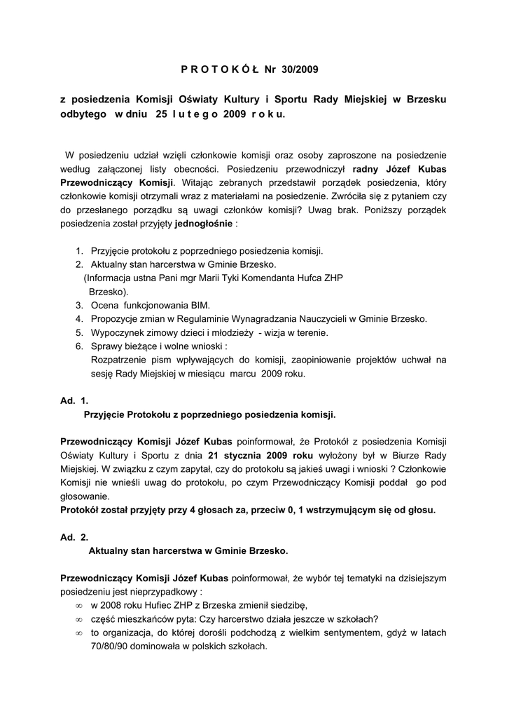 P R O T O K Ó Ł Nr 30/2009 z posiedzenia Komisji Oświaty Kultury i Sportu Rady Miejskiej w Brzesku odbytego w dniu 25 l u t e g o 2009 r o k u. W posiedzeniu udział wzięli członkowie komisji oraz osoby zaproszone na posiedzenie według załączonej listy obecności. Posiedzeniu przewodniczył radny Józef Kubas Przewodniczący Komisji. Witając zebranych przedstawił porządek posiedzenia, który członkowie komisji otrzymali wraz z materiałami na posiedzenie. Zwróciła się z pytaniem czy do przesłanego porządku są uwagi członków komisji? Uwag brak. Poniższy porządek posiedzenia został przyjęty jednogłośnie : 1. Przyjęcie protokołu z poprzedniego posiedzenia komisji. 2. Aktualny stan harcerstwa w Gminie Brzesko. (Informacja ustna Pani mgr Marii Tyki Komendanta Hufca ZHP Brzesko). 3. Ocena funkcjonowania BIM. 4. Propozycje zmian w Regulaminie Wynagradzania Nauczycieli w Gminie Brzesko. 5. Wypoczynek zimowy dzieci i młodzieży - wizja w terenie. 6. Sprawy bieżące i wolne wnioski : Rozpatrzenie pism wpływających do komisji, zaopiniowanie projektów uchwał na sesję Rady Miejskiej w miesiącu marcu 2009 roku. Ad. 1. Przyjęcie Protokołu z poprzedniego posiedzenia komisji. Przewodniczący Komisji Józef Kubas poinformował, że Protokół z posiedzenia Komisji Oświaty Kultury i Sportu z dnia 21 stycznia 2009 roku wyłożony był w Biurze Rady Miejskiej. W związku z czym zapytał, czy do protokołu są jakieś uwagi i wnioski ? Członkowie Komisji nie wnieśli uwag do protokołu, po czym Przewodniczący Komisji poddał go pod głosowanie. Protokół został przyjęty przy 4 głosach za, przeciw 0, 1 wstrzymującym się od głosu. Ad. 2. Aktualny stan harcerstwa w Gminie Brzesko. Przewodniczący Komisji Józef Kubas poinformował, że wybór tej tematyki na dzisiejszym posiedzeniu jest nieprzypadkowy : • w 2008 roku Hufiec ZHP z Brzeska zmienił siedzibę, • część mieszkańców pyta: Czy harcerstwo działa jeszcze w szkołach? • to organizacja, do której dorośli podchodzą z wielkim sentymentem, gdyż w latach 70/80/90 dominowała w polskich szkołach. Ponadto poinformował, że na posiedzeniu komisji gościmy Komendanta Hufca ZHP Brzesko druhnę Marię Tytka długoletniego instruktora harcerstwa. Okazuje się, że brzeskie harcerstwo przeżyło trudny okres transformacji, o czym świadczą dwa artykuły w BIM-ie: • z sierpnia 2008 roku – Obóz harcerski 2008, • z lutego 2009 roku – Zamiast fiskusowi, daj harcerzowi. Poinformował druhnę Komendant, iż członków komisji interesowałaby następująca tematyka: • struktura organizacyjna ZHP w Gminie Brzesko, • funkcjonalność nowej siedziby Hufca ZHP Brzesko, • ciekawe formy pracy z dziećmi i młodzieżą, • problemy naszego harcerstwa, jako organizacji pozarządowej, • pomoc samorządu brzeskiego w rozwoju harcerstwa w szkołach. Głos zabrała druhna Maria Tyka poinformowała, że pełni funkcję komendanta Hufca ZHP w Brzesku. Hufiec obejmuje obszar Powiatu Brzesko. Drużyny działają w Brzesku, Jadownikach, Okocimiu, Mokrzyskach, Wokowicach, Przyborowiu, Czchowie, Tworkowej, Złotej i Zaborowiu. Stan liczebny w/g spisu 2008 wynosił: 204 zuchów i harcerzy, 19 instruktorów, 3 gromady zuchowe, 8 drużyn harcerskich, 3 drużyny starszoharcerskie, l szczep. Siedziba Hufca znajduje się w Brzesku. Hufiec pracuje w oparciu o Program Rozwoju Hufca na lata 2007-2011 przyjęty przez Zjazd Hufca. Działalność programową oraz pracę z drużynowymi koordynuje Komenda Hufca. Posiedzenia Komendy Hufca odbywają się raz w miesiącu, dyżury w biurze Komendy. Zbiórki drużynowych odbywają się raz na dwa miesiące. Następnie przedstawiła główne cele i zadania w roku 2008/2009, do których między innymi zaliczyć należy: • propagowanie konieczności rozwijania i samodoskonalenia przez zdobywanie stopni harcerskich i instruktorskich, • dbanie o wysoki poziom imprez hufcowych w oparciu o harcerskie ideały. • usprawnienie przepływu informacji między Komendą a drużynowymi, • wzmocnienie działań Hufca w sprawie pozyskiwania funduszy, • wzmocnienie współpracy z władzami Miasta jednostkami samorządowymi, dyrekcjami szkół na terenie działania Hufca, organizowanie imprez hufcowych w różnych środowiskach działania gromad i drużyn, • udział w inauguracji roku harcerskiego 2008/2009 Chorągwi Krakowskiej w Tarnowie, • Organizowanie obietnic zuchowych i przyrzeczenia harcerskiego, • Organizowanie biwaków, rajdów i złazów w oparciu o Ośrodek harcerski w Piaskach Drużkowie, • udział w realizacji zadań ekologicznych własnych, środowiskowych i centralnych, • organizowanie zbiórek w drużynach poświęconych Twórcom harcerstwa /2008 - Rok Małkowskich/. Szczegółowa informacja stanowi załącznik do protokołu. Przewodniczący Komisji Józef Kubas poinformował, że z informacji druhny komendant Pani Marii Tyka wynika, że warunki ogólnie lokalowe są dobre, nie jest to sytuacja docelowa. Pan Naczelnik Cierniak zobowiązał się, że udostępni swoje lokum harcerstwu na 2 potrzeby różnych spotkań. Jeśli chodzi o komputer to Hufiec Brzesko otrzyma komputer z Urzędu Miejskiego. Przewodniczący Rady Miejskiej Krzysztof Ojczyk poinformował, że jak na harcerstwo z dużymi tradycjami, nasze obecne harcerstwo w Brzesku jest nie za bardzo zorganizowane. Po to są środki na działalność organizacji pozarządowych, aby z nich korzystać. Nie ma innej możliwości, jeśli chodzi o finansowanie harcerstwa z budżetu. Harcerstwo jest organizacją, która winna starać się o środki z tej puli. Trzeba tylko napisać odpowiedni program, złożyć wniosek jako organizacja pozarządowa, wziąć udział w danym konkursie czy to na organizację wypoczynku dla dzieci i młodzieży, czy tez na inny program. Osobiście zadeklarował pomoc i wolę pomocy w napisaniu takiego programu. Radny Franciszek Brzyk poinformował, że jak był jeszcze Dyrektorem Publi