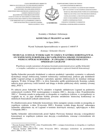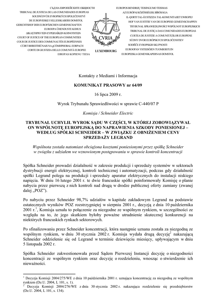 СЪД НА ЕВРОПЕЙСКИТЕ ОБЩНОСТИ EUROPOS BENDRIJŲ TEISINGUMO TEISMAS TRIBUNAL DE JUSTICIA DE LAS COMUNIDADES EUROPEAS AZ EURÓPAI KÖZÖSSÉGEK BÍRÓSÁGA SOUDNÍ DVŮR EVROPSKÝCH SPOLEČENSTVÍ IL-QORTI TAL-ĠUSTIZZJA TAL-KOMUNITAJIET EWROPEJ DE EUROPÆISKE FÆLLESSKABERS DOMSTOL HOF VAN JUSTITIE VAN DE EUROPESE GEMEENSCHAPPEN GERICHTSHOF DER EUROPÄISCHEN GEMEINSCHAFTEN TRYBUNAŁ SPRAWIEDLIWOŚCI WSPÓLNOT EUROPEJSKICH EUROOPA ÜHENDUSTE KOHUS TRIBUNAL DE JUSTIÇA DAS COMUNIDADES EUROPEIAS ∆ΙΚΑΣΤΗΡΙΟ ΤΩΝ ΕΥΡΩΠΑΪΚΩΝ ΚΟΙΝΟΤΗΤΩΝ CURTEA DE JUSTIŢIE A COMUNITĂŢILOR EUROPENE COURT OF JUSTICE OF THE EUROPEAN COMMUNITIES SÚDNY DVOR EURÓPSKYCH SPOLOČENSTIEV COUR DE JUSTICE DES COMMUNAUTÉS EUROPÉENNES SODIŠČE EVROPSKIH SKUPNOSTI CÚIRT BHREITHIÚNAIS NA gCÓMHPHOBAL EORPACH EUROOPAN YHTEISÖJEN TUOMIOISTUIN CORTE DI GIUSTIZIA DELLE COMUNITÀ EUROPEE EIROPAS KOPIENU TIESA EUROPEISKA GEMENSKAPERNAS DOMSTOL Kontakty z Mediami i Informacja KOMUNIKAT PRASOWY nr 64/09 16 lipca 2009 r. Wyrok Trybunału Sprawiedliwości w sprawie C-440/07 P Komisja / Schneider Electric TRYBUNAŁ UCHYLIŁ WYROK SĄDU W CZĘŚCI, W KTÓREJ ZOBOWIĄZYWAŁ ON WSPÓLNOTĘ EUROPEJSKĄ DO NAPRAWIENIA SZKODY PONIESIONEJ – WEDŁUG SPÓŁKI SCHNEIDER – W ZWIĄZKU Z OBNIŻENIEM CENY SPRZEDAŻY LEGRAND Wspólnota została natomiast obciążona kosztami poniesionymi przez spółkę Schneider w związku z udziałem we wznowionym postępowaniu w sprawie kontroli koncentracji Spółka Schneider prowadzi działalność w zakresie produkcji i sprzedaży systemów w sektorach dystrybucji energii elektrycznej, kontroli technicznej i automatyzacji, podczas gdy działalność spółki Legrand polega na produkcji i sprzedaży aparatur elektrycznych do instalacji niskiego napięcia. W dniu 16 lutego 2001 r. te dwie francuskie spółki poinformowały Komisję o planie nabycia przez pierwszą z nich kontroli nad drugą w drodze publicznej oferty zamiany (zwanej dalej „POZ”). Po nabyciu przez Schneider 98,7% udziałów w kapitale zakładowym Legrand na podstawie ostatecznych wyników POZ rozstrzygniętej w sierpniu 2001 r., decyzją z dnia 10 października 2001 r.1, Komisja uznała to połączenie za niezgodne ze wspólnym rynkiem, w szczególności ze względu na to, że jego skutkiem byłoby poważne utrudnienie skutecznej konkurencji na niektórych francuskich rynkach sektorowych. Po sfinalizowaniu przez Schneider koncentracji, która następnie uznana została za niezgodną ze wspólnym rynkiem, w dniu 30 stycznia 2002 r. Komisja wydała drugą decyzję2 nakazującą Schneider oddzielenie się od Legrand w terminie dziewięciu miesięcy, upływającym w dniu 5 listopada 2002 r. Spółka Schneider zakwestionowała przed Sądem Pierwszej Instancji decyzję o niezgodności koncentracji ze wspólnym rynkiem oraz decyzję o rozdzieleniu, wnosząc o stwierdzenie ich nieważności. 1 Decyzja Komisji 2004/275/WE z dnia 10 października 2001 r. uznająca koncentrację za niezgodną ze wspólnym rynkiem (Dz.U. 2004, L 101, s. 1). 2 Decyzja Komisji 2004/276/WE z dnia 30 stycznia 2002 r. nakazująca rozdzielenie się przedsiębiorstw (Dz.U. 2004, L 101, s. 134). Tymczasem Komisja przedłużyła, do dnia 5 lutego 2003 r., termin wyznaczony Schneider na oddzielenie się od Legrand. Na wypadek gdyby dwie wniesione przez Schneider skargi o stwierdzenie nieważności zostały oddalone, spółka ta przygotowała zbycie Legrand i w dniu 26 lipca 2002 r. zawarła w tym celu umowę sprzedaży z konsorcjum Wendel-KKR, która miała zostać wykonana najpóźniej w dniu 10 grudnia 2002 r. Umowa ta zawierała klauzulę umożliwiającą Schneider – w przypadku stwierdzenia nieważności decyzji uznającej koncentrację za niezgodną ze wspólnym rynkiem – rozwiązanie umowy do dnia 5 grudnia 2002 r. w zamian za zapłatę odszkodowania za zerwanie umowy w wysokości 180 mln EUR. Dwoma wyrokami z dnia 22 października 2002 r.3 Sąd stwierdził nieważność decyzji uznającej koncentrację za niezgodną ze wspólnym rynkiem, a także nieważność decyzji o rozdzieleniu. Sąd uznał w szczególności, że dopuszczając się uchybień proceduralnych, Komisja naruszyła przysługujące Schneider prawo do obrony. Po wydaniu wspomnianych wyroków Komisja wznowiła postępowanie w sprawie kontroli transakcji przeprowadzonej między Schneider a Legrand. Komisja poinformowała spółkę Schneider, że transakcja ta mogła zakłócić konkurencję na francuskich rynkach sektorowych. W dniu 2 grudnia 2002 r. Schneider zakomunikowała Komisji swą decyzję o sprzedaży Legrand na rzecz Wendel-KKR, przy czym sprzedaż ta nastąpiła w dniu 10 grudnia 2002 r., czyli w terminie uzgodnionym w umowie z dnia 26 lipca 2002 r. W dniu 10 października 2003 r. spółka Schneider wniosła do Sądu skargę przeciwko Komisji, domagając się odszkodowania w kwocie prawie 1,7 mld EUR z tytułu szkód, które poniosła – jak twierdzi – z powodu niezgodności z prawem decyzji uznającej koncentrację za niezgodną ze wspólnym rynkiem. Wyrokiem z dnia 11 lipca 2007 r.4 Sąd uznał istnienie po stronie Schneider prawa do odszkodowania, lecz jedynie z tytułu niektórych spośród szkód wskazanych przez to przedsiębiorstwo. Po stwierdzeniu, że naruszenie prawa Schneider do obrony stanowiło w tym przypadku wystarczająco istotne naruszenie normy prawnej przyznającej uprawnienia jednostkom, Sąd potwierdził istnienie związku przyczynowego między popełnionym naruszeniem a dwoma rodzajami szkód poniesionych przez Schneider. Pierwsza z tych szkód odpowiadała kosztom poniesionym przez Schneider w związku z udziałem we wznowionym postępowaniu w sprawie kontroli koncentracji, podjętym przez Komisję po ogłoszeniu przez Sąd w dniu 22 października 2002 r. wyroków stwierdzających nieważność zaskarżonych decyzji. Druga ze szkód odpowiadała kwocie, o jaką Schneider musiała obniżyć cenę sprzedaży