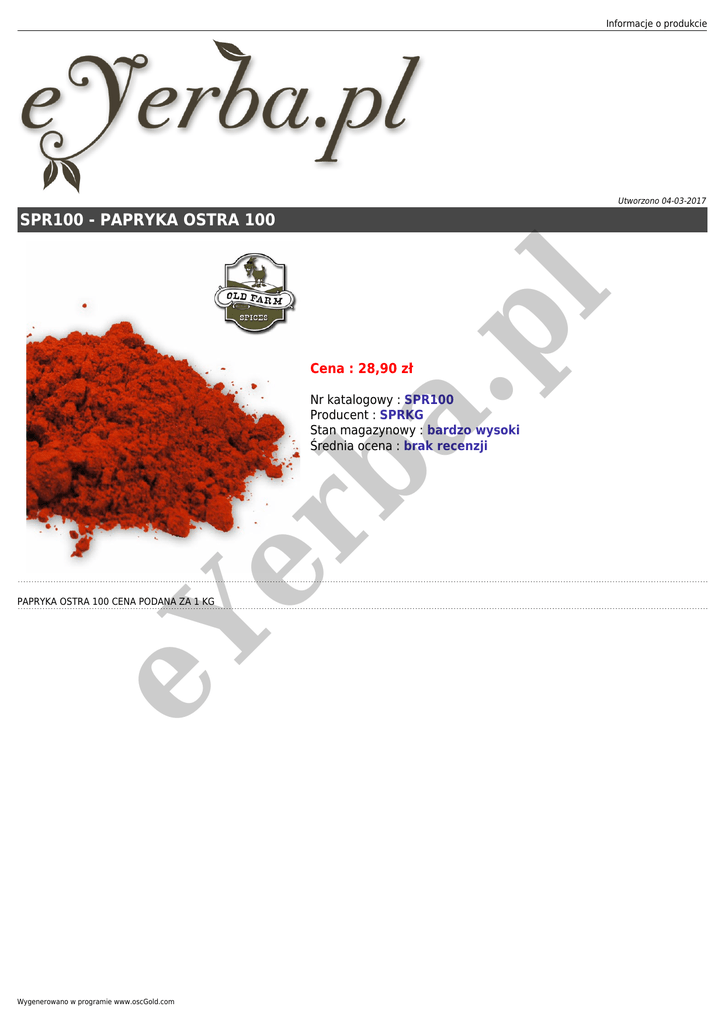 Informacje o produkcie Utworzono 04-03-2017 a. pl SPR100 - PAPRYKA OSTRA 100 Cena : 28,90 zł er b Nr katalogowy : SPR100 Producent : SPRKG Stan magazynowy : bardzo wysoki Średnia ocena : brak recenzji eY PAPRYKA OSTRA 100 CENA PODANA ZA 1 KG Wygenerowano w programie www.oscGold.com