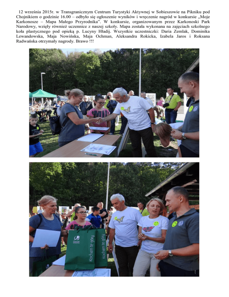 12 września 2015r. w Transgranicznym Centrum Turystyki Aktywnej w Sobieszowie na Pikniku pod Chojnikiem o godzinie 16.00 – odbyło się ogłoszenie wyników i wręczenie nagród w konkursie „Moje Karkonosze – Mapa Małego Przyrodnika”. W konkursie, organizowanym przez Karkonoski Park Narodowy, wzięły również uczennice z naszej szkoły. Mapa została wykonana na zajęciach szkolnego koła plastycznego pod opieką p. Lucyny Hładij. Wszystkie uczestniczki: Daria Zemlak, Dominika Lewandowska, Maja Nowińska, Maja Ochman, Aleksandra Rokicka, Izabela Jaros i Roksana Radwańska otrzymały nagrody. Brawo !!!