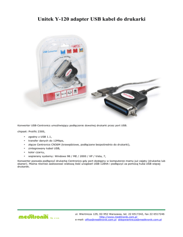 Unitek Y-120 adapter USB kabel do drukarki Konwerter USB-Centronics umożliwiający podłączenie dowolnej drukarki przez port USB. chipset: Prolific 2305, • zgodny z USB 1.1, • transfer danych do 12Mbps, • złącze Centronics CN36M (krawędziowe, podłączane bezpośrednio do drukarki), • zintegrowany kabel USB, • kolor czarny, • wspierany systemy: Windows 98 / ME / 2000 / XP / Vista, 7, Konwerter pozwala podłączyć drukarkę Centronics gdy port dostępny w komputerze mamy już zajęty (drukarka lub skaner). Można również zastosować wiekszą ilość urządzeń USB-1284A i podłączyć za pomocą huba USB więcej drukarek. ul. Wiertnicza 129, 02-952 Warszawa, tel. 22 6517242, fax 22 6517246 http://www.meditronik.com.pl e-mail: [email protected] [email protected]