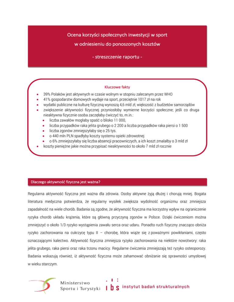 Ocena korzyści społecznych inwestycji w sport w odniesieniu do ponoszonych kosztów - streszczenie raportu - Kluczowe fakty 39% Polaków jest aktywnych w czasie wolnym w stopniu zalecanym przez WHO 41% gospodarstw domowych wydaje na sport, przeciętnie 1017 zł na rok wydatki publiczne na kulturę fizyczną wynoszą 4,6 mld zł, większość z budżetów samorządów zwiększenie aktywności fizycznej przyniosłoby wymierne korzyści społeczne; jeśli co druga nieaktywna fizycznie osoba zaczęłaby ćwiczyć to, m.in.: liczba zawałów mogłaby spaść o blisko 11 000, liczba przypadków raka jelita grubego o 2 200 a liczba przypadków raka piersi o 1 500 liczba zgonów zmniejszyłaby się o 25 tys. o 440 mln PLN spadłyby koszty systemu opieki zdrowotnej o 6% zmniejszyłaby się liczba absencji pracowniczych, a ich koszt zmalałby o 3 mld zł koszty pieniężne jakie można przypisać nieaktywności to około 7 mld zł rocznie Dlaczego aktywność fizyczna jest ważna? Regularna aktywność fizyczna jest ważna dla zdrowia. Osoby aktywne żyją dłużej i chorują mniej. Bogata literatura medyczna potwierdza, że regularny wysiłek zwiększa wydolność organizmu oraz zmniejsza zapadalność na wiele chorób. Badania są zgodne, że aktywność fizyczna ma korzystny wpływ na ograniczenie ryzyka chorób układu krążenia, które są główną przyczyną zgonów w Polsce. Dzięki ćwiczeniom można zmniejszyć o około 1/3 ryzyko wystąpienia zawału serca oraz udaru. Ponadto ruch fizyczny znacząco obniża ryzyko zachorowania na cukrzycę typu II – chorobę, która wiąże się z poważnymi powikłaniami, często oznaczającymi kalectwo. Aktywność fizyczna zmniejsza ryzyko zachorowania na niektóre nowotwory: raka jelita grubego, raka piersi oraz raka trzonu macicy. Regularne ćwiczenia zmniejszają też ryzyko osteoporozy. Badania wskazują również, iż aktywność fizyczna może zahamować obniżanie się sprawności umysłowej w wieku starczym. Coraz większa liczba badań z pogranicza ekonomii i nauk społecznych pokazuje, że aktywność fizyczna ma wpływ na inne aspekty życia poza zdrowiem. Osoby za młodu aktywne fizycznie osiągają w kolejnych etapach swojego życia lepsze wyniki w nauce oraz znajdują się w korzystniejszej sytuacji na rynku pracy. Choć pytanie o mechanizm tego wpływu jest ciągle otwarte – możliwy jest wytłumaczenie biologiczne poprzez lepsze dotlenienie organizmu sprzyjające sprawności umysłowej, psychologiczne poprzez budowanie samodyscypliny i umiejętności zarządzania czasem, bądź społeczne przez lepszą socjalizację dzięki uprawianiu sportu – badacze są zgodni, że aktywność fizyczna pozytywnie wpływa na naszą sytuację społeczną. Co wiemy o aktywności fizycznej Polaków? Światowa Organizacja Zdrowia (World Health Organization, WHO) zaleca, aby osoby dorosłe (18-64 lata) w ciągu tygodnia podejmowały wysiłki fizyczne, których wydatek energetyczny to co najmniej 600 MET-minut. MET jest to tzw. równoważnik metaboliczny, który służy jako miara intensywności wysiłku fizycznego. Aby osiągnąć wartość 600 MET-minut należy uprawiać sport o umiarkowanej intensywności (np. jazda na rowerze w normalnym tempie) przez co najmniej 150 minut, lub wysiłki o wysokiej intensywności (np. szybki bieg) przez co najmniej 75 minut w ciągu tygodnia. Gdy rekomendacje WHO przyłoży się do aktywności Polaków w czasie wolnym, okazuje się, że poziom aktywności fizycznej w naszym społeczeństwie jest niski. Zgodnie z wynikami Badania Aktywności Fizycznej Polaków, przeprowadzonego na zlecenie Ministerstwa Sportu i Turystyki w 2016 roku, jedynie 39% Polaków było aktywnych fizycznie w czasie wolnym w stopniu zalecanym przez Światową Organizację Zdrowia, czyli osiągnęło tygodniowy równoważnik metaboliczny na poziomie 600 MET-min. 50% polskiego społeczeństwa nie podejmowało żadnej aktywności fizycznej w czasie wolnym. Odsetek osób aktywnych fizycznie w Polsce 39% 61% osoby aktywne fizycznie osoby nieaktywne Dane wskazują, że osoby młode są znacznie częściej aktywne niż osoby starsze. Wraz z wiekiem poziom aktywności maleje, staje się ona mniej częsta a jej intensywność zmniejsza się. W grupie wieku 15-24 lat odsetek osób aktywnych fizycznie wynosi 63%, a w grupie 55-64 lat – 29%. Oprócz wieku kolejnym czynnikiem istotnie różnicującym poziom aktywności fizycznej jest wykształcenie. Obserwujemy, że odsetek aktywnych fizycznie w grupie osób z wykształceniem wyższym jest zdecydowanie wyższy niż w całej populacji i wynosi 53%. Płeć nie różnicuje wskaźników aktywności. Odsetek osób aktywnych fizycznie zgodnie z rekomendacjami Światowej Organizacji Zdrowia jest taki sam wśród kobiet i mężczyzn. Nierówności pod względem podejmowania aktywności fizycznej mają przełożenie na zróżnicowanie wydatków prywatnych na sport. Jedynie 41% gospodarstw domowych w Polsce przeznacza ze swojego budżetu pieniądze zakupy lub opłaty związane ze sportem. Przeciętna wysokość tych wydatków to 1017 zł rocznie w przeliczeniu na jedno gospodarstwo, które ponosi taki wydatek. Ponad połowę wydatków prywatnych stanowią wydatki na udział w zajęciach sportowych. Wydatki publiczne na sport wynoszą 4,6 mld zł (dane za 2015 rok), z tego większość stanowią wydatki jednostek samorządu terytorialnego (ponad 90%). Jakie korzyści może osiągnąć społeczeństwo dzięki większej aktywności fizycznej? Wykorzystując aplikację, która została przygotowana przez Instytut Badań Strukturalnych, można oszacować wpływ zwiększenia aktywności fizycznej w populacji na zdrowie publiczne oraz rynek pracy. Rozważmy sytuację polegającą na aktywizacji połowy Polaków do tej pory nieaktywnych fizycznie. Oznacza to, że odsetek osób aktywnych fizycznie zwiększyłby się do poziomu 70%, czyli tyle ile raportują najbardziej aktywne fizycznie kraje europejskie. Jak taka popr