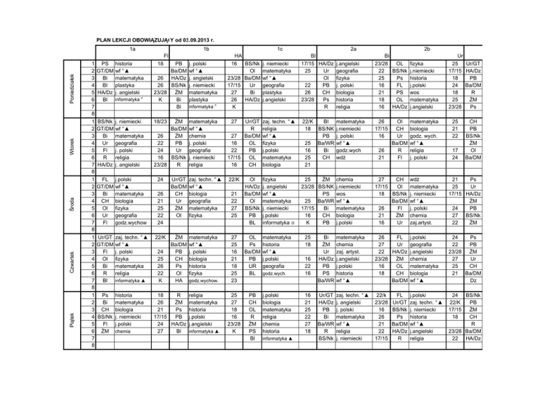 PLAN LEKCJI OBOWIĄZUJĄCY Y od OD03.09.2012r. 31.01.2011 .09.2013 r. 1a Poniedziałek Wtorek Środa Czwartek Piątek 1 2 3 4 5 6 7 8 1 2 3 4 5 6 7 8 1 2 3 4 5 6 7 8 1 2 3 4 5 6 7 8 1 2 3 4 5 6 7 8 1c 1b Fl HA 16 BS/Nk Ol 23/28 Ba/DM 17/15 Ur 27 Bi 26 HA/Dz K 2b Bi 23/28 OL fizyka 22 BS/Nk j.niemiecki 25 Ps historia 16 FL j.polski 21 PS wos 18 OL matematyka 16 HA/Dz j.angielski Ur 25 Ur/GT 17/15 HA/Dz 18 PB 24 Ba/DM 18 R 25 ŻM 23/28 Ps PS GT/DM Bi BI HA/Dz Bl historia wf °▲ matematyka plastyka j. angielski informatyka ° 18 PB Ba/DM 26 HA/Dz 26 BS/Nk 23/28 ŻM K Bi Bl j. polski wf °▲ j. angielski j. niemiecki matematyka plastyka informatyka ° BS/Nk GT/DM Bi Ur Fl R HA/Dz j. niemiecki wf °▲ matematyka geografia j. polski religia j. angielski 18/23 matematyka wf °▲ chemia j. polski geografia j. niemiecki religia Ur/GT R 27 Ba/DM 16 OL 22 PB 17/15 OL 16 CH zaj. techn. °▲ religia wf °▲ fizyka j.polski matematyka biologia 22/K BI 18 BS/NK PB 25 Ba/WR 16 Bi 25 CH 21 matematyka j.niemiecki j. polski wf °▲ godz.wych wdż 26 17/15 16 Ol CH Ur Ba/DM R Fl matematyka biologia godz. wych. wf °▲ religia j. polski FL GT/DM Bi CH Ol Ur Fl j.polski wf °▲ matematyka biologia fizyka geografia godz.wychow Ur/GT Ba/DM CH Ur ŻM Ol zaj. techn. °▲ wf °▲ biologia geografia matematyka fizyka 22/K Ol HA/Dz Ba/DM Ol BS/Nk PB BL fizyka j. angielski wf °▲ matematyka j. niemiecki j.polski informatyka ○ 25 ŻM 23/28 BS/NK PS 25 Ba/WR 17/15 Bi 16 CH K PB chemia j.niemiecki wos wf °▲ matematyka biologia j.polski 27 CH 17/15 Ol 18 BS/Nk Ba/DM 26 Fl 21 ŻM 16 Ur wdż matematyka j. niemiecki wf °▲ j. polski chemia zaj.artyst. 21 Ps 25 Ur 17/15 HA/Dz ŻM 24 PB 27 BS/Nk 22 ŻM Ur/GT GT/DM Fl Ol Bi R Bl zaj. techn. °▲ wf °▲ j. polski fizyka matematyka religia ŻM Ba/DM PB CH Ps Ol HA matematyka wf °▲ j. polski biologia historia fizyka 27 25 16 21 18 25 23 OL Ps Ba/DM PB UR BL matematyka historia wf °▲ j.polski geografia Bi ŻM Ur HA/Dz PB PS Ba/WR matematyka chemia zaj. artyst. j.angielski j.polski historia wf °▲ 26 FL j.polski 27 Ur geografia 22 HA/Dz j.angielski 23/28 ŻM chemia 16 OL matematyka 18 CH biologia Ba/DM wf °▲ 24 Ps 22 PB 23/28 ŻM 27 Ur 25 CH 21 Ba/DM Dz 25 27 18 16 23/28 K PB CH OL R ŻM PS Bl Ur/GT HA/Dz PB Bi Ba/WR R BS/Nk zaj. techn. °▲ j. angielski j. polski matematyka wf °▲ religia j. niemiecki 22/k 23/28 16 26 21 22 17/15 24 BS/Nk 22/K PB 17/15 ŻM 18 CH R 23/28 Ba/DM 22 HA/Dz Ps Bi CH BS/Nk Fl ŻM informatyka ▲ historia matematyka biologia j. niemiecki j.polski chemia ŻM Ba/DM 26 ŻM 22 PB 24 Ur 16 BS/Nk 23/28 R 24 26 21 25 22 24 22/K 24 25 26 22 K godz.wychow. 18 R religia 26 ŻM matematyka 21 Ps historia 17/15 PB j.polski 24 HA/Dz j.angielski 27 Bl informatyka ▲ 27 21 22 27 25 j. niemiecki matematyka wf °▲ geografia plastyka j.angielski 2a Bl 17/15 HA/Dz j.angielski 25 Ur geografia Ol fizyka 22 PB j. polski 26 CH biologia 23/28 Ps historia R religia 25 18 godz.wych. 16 22 16 j.polski biologia matematyka religia chemia historia 16 21 25 22 27 18 informatyka ▲ 26 21 FL Ur/GT BS/Nk Ps Ba/DM HA/Dz R j.polski zaj. techn. °▲ j. niemiecki historia wf °▲ j.angielski religia 25 21 22 17 24 CH PB BS/Nk ŻM Ol Ba/DM 2c zaj. techn. °▲ j. angielski j. polski wf °▲ religia matematyka wos 3a Dz 22/K Ba/DM wf °▲ 23/28 Fl j. polski 16 Ur geografia Ol fizyka 16 Ol matematyka 27 R religia 18 3b Ol 24 22 25 25 16 Bi Ps Fl HA/Dz NK Ba/DM ŻM matematyka historia j. polski j. angielski godz. wych. wf °▲ chemia wdż j. polski j. niemiecki matematyka fizyka wf °▲ 21 KR/PB/RA zaj. artyst. 16 Ol matematyka 17/15 Fl j. polski 27 BS/Nk j. niemiecki 25 Ps historia HA/Dz j. angielski Ba/DM wf °▲ 17/16/15 KR/PB/RA historia zaj. artyst. j. angielski chemia j. polski j. niemiecki matematyka 18 Ba/DM wf °▲ 22 Ps historia 23/28 Ol matematyka 27 HA/Dz j. angielski 16 CH biologia 17/15 Fl j. polski 27 Ol godz.wych HA/Dz j. angielski 18 CH biologia 25 Fl j. polski 23/28 Bi matematyka 21 Ba/DM wf °▲ 24 R religia 25 historia j. polski matematyka geografia biologia wf °▲ godz.wych j. niemiecki j. polski chemia biologia religia wf °▲ j. angielski 18 16 27 22 21 18 Ba/DM Ol KR Fl HA/Dz WR BS/Nk wf °▲ matematyka plastyka j. polski j. angielski ed. dla bezp. j. niemiecki 17/15 CH przyroda(zdw) 16 BS/Nk j. niemiecki 27 R religia 21 ŻM chemia 22 Ol matematyka Fl j. polski 23/28 Ps wos 25 24 17/15 18 23/28 Bi R Fl WR Ps BS/Nk zaj. artyst. matematyka religia j. polski ed. dla bezp. wos j. niemiecki 3c Nk 26 Ba/DM wf °▲ 18 Bi matematyka 24 BS/Nk j. niemiecki 23/28 Ps historia 15 Fl j. polski CH godz. wych. 27 CH przyroda zaj. artyst. 26 Fl j. polski 18 CH biologia 24 Bi matematyka 27 HA/Dz j. angielski 18 WR ed. dla bezp. 17/15 Ba/DM wf °▲ 17/16/15 KR/PB/RA 23/28 Ba/DM wf °▲ 21 Fl j. polski 24 ŻM chemia 26 BS/Nk j. niemiecki Ur geografia 18 Bi matematyka R religia 17 24 26 18 CH 26 17/15 18 24 21 21 17/16/15 24 21 26 23/28 27 24 27 17/15 22 26 18 KR plastyka 25 Fl j. polski 17 Bi matematyka 24 PS historia 23/28 Ba/DM wf °▲ 27 BS/Nk j. niemiecki 17/15 CH przyroda Ba/DM KR Ol Bi Fl 17/15 HA/Dz 21 R wf °▲ plastyka fizyka matematyka j. polski j. angielski religia 17 25 26 24 23/28 22 21 Bi matematyka 17/15 Fl j. polski 24 Ur geografia 27 HA/Dz j. angielski 25 BS/Nk j. niemiecki 24 Ol fizyka 18 Ba/DM wf °▲ 26 HA/Dz j. angielski 24 Ps historia 22 Bi matematyka 23/28 Fl j. polski 17/15 Ps wos 25 BS/Nk j. niemiecki 23/28 18 26 24 18 17/15 1 2 3 4 5 6 7 8 1 2 3 4 5 6 7 8 1 2 3 4 5 6 7 8 1 2 3 4 5 6 7 8 1 2 3 4 5 6 7 8