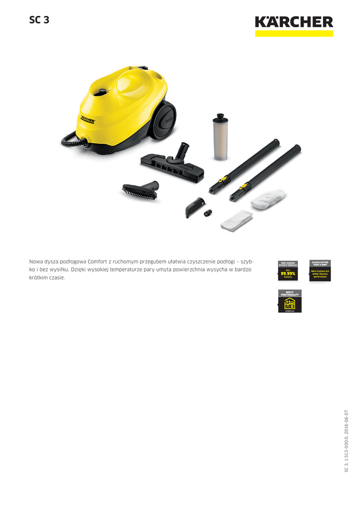 SC 3 Nowa dysza podłogowa Comfort z ruchomym przegubem ułatwia czyszczenie podłogi – szyb- ** * ko i bez wysiłku. Dzięki wysokiej temperaturze pary umyta powierzchnia wysycha w bardzo krótkim czasie. ** When thoroughly cleaning with the Kärcher steam cleaner the cleaning performance is better than cleaning with a manual mop and detergent. Tested according to international performance standards. SC 3, 1.513-000.0, 2016-06-07 * When thoroughly cleaning with the Kärcher Steam Cleaner 99.99 % of all common household bacteria will be killed on common household hard surfaces. SC 3 Dane techniczne 1.513-000.0 Numer katalogowy 4039784959521 Wydajność powierzchniowa m² 75 Czas podgrzewania min. 0,5 Pojemność kotła / zbiornika wyrównawczego Maks. ciśnienie pary l 1+-/- bar 3,5 Moc grzałki W 1900 Przewód zasilający m 4 Ciężar bez wyposażenia kg 3,1 Wymiary (dł. x szer. x wys.) mm 360 × 236 × 253 Wyposażenie standardowe Bezpieczna blokada / Zawór bezpieczeństwa Regulacja ilości pary Wbudowany lejek do napełniania Zestaw do czyszczenia podłóg Comfort + Rury ssące 2 x 0,5 m Dysza ręczna, dysza do detali, okrągła szczotka Wyposażenie Ściereczka podłogowa frotte szt. 1 Ściereczka frotte do dyszy ręcznej szt. 1 Filtr odkamieniający we wkładzie Wąż parowy z pistoletem Pozycja parking Objęte dostawą. m 2 SC 3, 1.513-000.0, 2016-06-07 Na rękojeści Akcesoria dla SC 3 1.513-000.0 1 2 3 4 5 6 8 9 10 11 12 13 14 15 Numer katalogowy Cena Opis Dysze Dysza ręczna 1 2.884-280.0 Zestaw do czyszczenia podłóg "Comfort Plus" Dysza do czyszczenia okien 2 2.863-019.0 Dysza power 4 2.884-282.0 Dysza do pielęgnacji tekstyliów Dysza do pielęgnacji tekstyliów für SC Gumowa listwa do dyszy do okien 3 2.863-025.0 5 4.130-390.0 Dysza ręczna ze szczeciną do czyszczenia niewielkich powierzchni np. kabiny prysznicowe, płytki ścienne itp. Przeznaczona do pracy z lub bez powłoczki z mikrofibry. W zestawie dysza podłogowa Comfort Plus i ściereczka do dyszy podłogowej wykonana z mikrofibry. Dysza do okien dokładnie czyści szkło, okna oraz lustra przy użyciu parownicy. Dysza Power z przedłużką znacznie zwiększa siłę czyszczenia dyszy do detali. Doskonała do łatwego, ekologicznego czyszczenia trudnodostępnych miejsc np. rogów. Dysza do pielęgnacji tekstyliów odświeża i usuwa zagięcia ubrań i tekstyliów, efektywnie usuwając nieprzyjemne zapachy. Posiada warstwę usuwającą meszek. 6 2.863-233.0 7 6.273-140.0 Gumowa listwa do dyszy do okien dla parownic. Filtr odkamieniający we wkładzie 8 2.863-018.0 Dysza do usuwania tapet 9 2.863-062.0 Filtr odkamieniający samoczynnie i efektywnie odkamienia parownicę SC 3. Zdzieracz do tapet doskonale usuwa tapety oraz pozostałości kleju wykorzystując działanie pary. Zestaw akcesoriów do parownic. W skład zestawu wchodzą: trzy bawełniane ściereczki podłogowe, trzy bawełniane powłoczki na dyszę ręczną, dwie czerwone i dwie czarne okrągłe szczotki. Zamienny zestaw O-ringów do wyposażenia parownic. Zestaw ściereczek zawiera cztery różne rodzaje ściereczek z mikrofibry do czyszczenia łazienki. Zestaw ściereczek zawiera cztery różne rodzaje ściereczek z mikrofibry do czyszczenia kuchni. Dwie miękkie welurowe ściereczki podłogowe do łatwego usuwania zabrudzeń. Zapewniają doskonale czystą podłogę. Zestaw składa się z dwóch miękkich powłoczek z mikrofibry na dyszę ręczną przeznaczonych do czyszczenia silnie zabrudzonych powierzchni w kuchni i w łazience. Zestaw pięciu ściereczek (2 podłogowych i 3 powłoczek na dyszę ręczną) z wysokiej jakości bawełny. Zestaw pięciu wysoce chłonnych, wąskich ściereczek podłogowych z wysokiej jakości bawełny. Zestaw pięciu wysoce chłonnych ściereczek podłogowych z wysokiej jakości bawełny. Zestaw pięciu wysoce chłonnych powłoczek na dyszę ręczną z wysokiej jakości bawełny. Inne akcesoria Zestaw uniwersalnych akcesoriów Zestaw O-ringów 10 2.863-215.0 11 2.884-312.0 Zestawy ściereczek 12 2.863-171.0 13 2.863-172.0 14 2.863-173.0 15 2.863-174.0 Zestaw ściereczek frotte 16 6.960-019.0 Ściereczki podłogowe frotte, wąskie Ściereczki frotte 5 sztuk 17 6.369-357.0 Powłoczki frotte 5 sztuk 19 6.370-990.0 18 6.369-481.0 Zestawy szczotek Zestaw okrągłych szczotek 20 2.863-058.0 Zestaw szczotek z mosiężną szczeciną 21 2.863-061.0 Okrągła szczotka – duża 22 2.863-022.0 Objęte dostawą. Dostępne akcesoria. Praktyczny zestaw okrągłych szczotek dostępny w dwóch kolorach Zestaw szczotek okrągłych z mosiężną szczeciną do usuwania uporczywych, zaschniętych zabrudzeń. Doskonałe do niewrażliwych powierzchni. Dzięki dużej, okrągłej szczotce wyczyścisz większą powierzchnię w krótszym czasie. SC 3, 1.513-000.0, 2016-06-07 Zestaw ścierek z mikrofibry do łazienki Zestaw ścierek z mikrofibry do kuchni Zestaw ścierek z mikrofibry do podłogi Zestaw powłoczek z mikrofibry Akcesoria dla SC 3 1.513-000.0 23 24 Numer katalogowy Szczotka okrągła ze skrobakiem 23 2.863-140.0 Parowa szczotka Turbo 24 2.863-159.0 Cena Opis Szczotka okrągła z dwoma rzędami odpornej na wysokie temperatury szczeciny oraz skrobakiem do łatwego usuwa nia uporczywych zabrudzeń. Nie nadaje się do czyszczenia powierzchni wrażliwych. Parowa szczotka Turbo ogranicza czas czyszczenia o połowę. Dzięki jej silnemu działaniu nie ma potrzeby szoro- wania. Umożliwia oszczędność czasu. SC 3, 1.513-000.0, 2016-06-07 Objęte dostawą. Dostępne akcesoria.