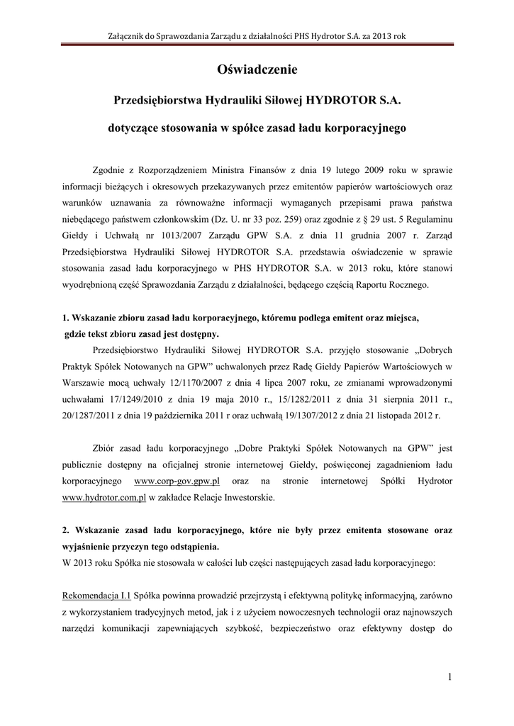 stosowania zasad ładu korporacyjnego w PHS HYDROTOR S.A. w 2013 roku, które stanowi