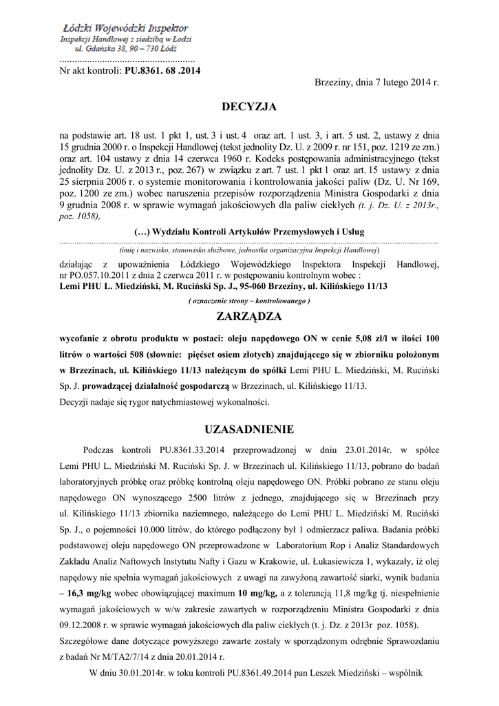 ...................................................... Nr akt kontroli: PU.8361. 68 .2014 Brzeziny, dnia 7 lutego 2014 r. DECYZJA na podstawie art. 18 ust. 1 pkt 1, ust. 3 i ust. 4 oraz art. 1 ust. 3, i art. 5 ust. 2, ustawy z dnia 15 grudnia 2000 r. o Inspekcji Handlowej (tekst jednolity Dz. U. z 2009 r. nr 151, poz. 1219 ze zm.) oraz art. 104 ustawy z dnia 14 czerwca 1960 r. Kodeks postępowania administracyjnego (tekst jednolity Dz. U. z 2013 r., poz. 267) w związku z art. 7 ust. 1 pkt 1 oraz art. 15 ustawy z dnia 25 sierpnia 2006 r. o systemie monitorowania i kontrolowania jakości paliw (Dz. U. Nr 169, poz. 1200 ze zm.) wobec naruszenia przepisów rozporządzenia Ministra Gospodarki z dnia 9 grudnia 2008 r. w sprawie wymagań jakościowych dla paliw ciekłych (t. j. Dz. U. z 2013r., poz. 1058), (…) Wydziału Kontroli Artykułów Przemysłowych i Usług ............................................................................................................................. ............................................................................ (imię i nazwisko, stanowisko służbowe, jednostka organizacyjna Inspekcji Handlowej) działając z upoważnienia Łódzkiego Wojewódzkiego Inspektora Inspekcji Handlowej, nr PO.057.10.2011 z dnia 2 czerwca 2011 r. w postępowaniu kontrolnym wobec : Lemi PHU L. Miedziński, M. Ruciński Sp. J., 95-060 Brzeziny, ul. Kilińskiego 11/13 ( oznaczenie strony – kontrolowanego ) ZARZĄDZA wycofanie z obrotu produktu w postaci: oleju napędowego ON w cenie 5,08 zł/l w ilości 100 litrów o wartości 508 (słownie: pięćset osiem złotych) znajdującego się w zbiorniku położonym w Brzezinach, ul. Kilińskiego 11/13 należącym do spółki Lemi PHU L. Miedziński, M. Ruciński Sp. J. prowadzącej działalność gospodarczą w Brzezinach, ul. Kilińskiego 11/13. Decyzji nadaje się rygor natychmiastowej wykonalności. UZASADNIENIE Podczas kontroli PU.8361.33.2014 przeprowadzonej w dniu 23.01.2014r. w spółce Lemi PHU L. Miedziński M. Ruciński Sp. J. w Brzezinach ul. Kilińskiego 11/13, pobrano do badań laboratoryjnych próbkę oraz próbkę kontrolną oleju napędowego ON. Próbki pobrano ze stanu oleju napędowego ON wynoszącego 2500 litrów z jednego, znajdującego się w Brzezinach przy ul. Kilińskiego 11/13 zbiornika naziemnego, należącego do Lemi PHU L. Miedziński M. Ruciński Sp. J., o pojemności 10.000 litrów, do którego podłączony był 1 odmierzacz paliwa. Badania próbki podstawowej oleju napędowego ON przeprowadzone w Laboratorium Rop i Analiz Standardowych Zakładu Analiz Naftowych Instytutu Nafty i Gazu w Krakowie, ul. Łukasiewicza 1, wykazały, iż olej napędowy nie spełnia wymagań jakościowych z uwagi na zawyżoną zawartość siarki, wynik badania – 16,3 mg/kg wobec obowiązującej maximum 10 mg/kg, a z tolerancją 11,8 mg/kg tj. niespełnienie wymagań jakościowych w w/w zakresie zawartych w rozporządzeniu Ministra Gospodarki z dnia 09.12.2008 r. w sprawie wymagań jakościowych dla paliw ciekłych (t. j. Dz. z 2013r poz. 1058). Szczegółowe dane dotyczące powyższego zawarte zostały w sporządzonym odrębnie Sprawozdaniu z badań Nr M/TA2/7/14 z dnia 20.01.2014 r. W dniu 30.01.2014r. w toku kontroli PU.8361.49.2014 pan Leszek Miedziński – wspólnik kontrolowanej spółki złożył pisemne oświadczenie, że od ostatniej kontroli tj. od 23.01.2014r. miała miejsce dostawa paliwa oleju napędowego ON, zakupionego na podstawie faktury nr 506/FV/BT z dnia 27.01.2014r. od Pol-Oil-Corporation Sp. z o. o., Stanisławowo, 05-180 Pomiechówek. W dniu kontroli t. j. 30.01.2014r. w zbiorniku znajdowało się 100 litrów paliwa oleju napędowego ON (ilość paliwa ustalona na podstawie ustnego oświadczenia Pana Leszka Miedzińskiego z powodu braku możliwości zmierzenia stanu zbiornika przez inspektorów). Spółka Lemi PHU L. Miedziński M. Ruciński Sp. J., nie złożyła wniosku zbadanie próbki kontrolnej paliwa oleju napędowego ON, pobranej podczas kontroli Nr PU.8361.33.2014 w dniu 23.01.2014r. W związku z dostawą paliwa oleju napędowego ON w spółce Lemi PHU L. Miedziński, M. Ruciński Sp. J. prowadzącej działalność gospodarczą w Brzezinach, ul. Kilińskiego 11/13, w ramach systemu monitorowania i kontrolowania jakości paliw ciekłych, wprowadzonego przez przepisy ustawy z dnia 25 sierpnia 2006 roku o systemie monitorowania i kontrolowania jakości paliw (Dz. U. nr 169, poz. 1200 ze zm.) – pobrano do badań laboratoryjnych próbkę paliwa, oleju napędowego ON (4 litry próbka podstawowa, 4 litry – próbka kontrolna i 4 litry na przepłukanie „pistoletu”). Z uwagi na podejrzenie, że kontrolowane paliwo może nie spełniać wymagań jakościowych (ze względu na wynik badania próbki podstawowej paliwa pobranego w toku kontroli przeprowadzonej na tej stacji w dniu 23.01.2014r.) wydano w czasie kontroli w dniu 30.01.2014r. postanowienie o zabezpieczeniu paliwa w postaci oleju napędowego ON w ilości 100 litrów. W związku z powyższym zbiornik w którym znajdowało się paliwo olej napędowy ON (100 litrów) został zabezpieczony plombami ołowianymi uniemożliwiając tym samym jego otwarcie bez uszkodzenia zabezpieczeń. Partię paliwa, z której pobrano próbki: podstawowa i kontrolną oleju napędowego ON podczas kontroli nr PU.8361.49.2014 w dniu 30.01.2014r., zabezpieczono do czasu otrzymania wyników badań laboratoryjnych na podstawie postanowienia o zabezpieczeniu produktu, wydanego w dniu 30.01.2014 r. w sprawie PU.8361.49.2014. Szczegółowy sposób zabezpieczenia został opisany w sporządzonym odrębnie protokole zabezpieczenia produktu. Badania jakościowe próbki podstawowej paliwa – oleju napędowego ON pobranego do badań w dniu 30.01.2014r. przeprowadzone w Laboratorium Rop i Analiz Standardowych Zakładu Analiz Naftowych Instytutu Nafty i Gazu w Krakowie, ul. Łukasiewicza 1, wykazały, iż paliwo nie spełniało wymagań określonych w Załączniku n