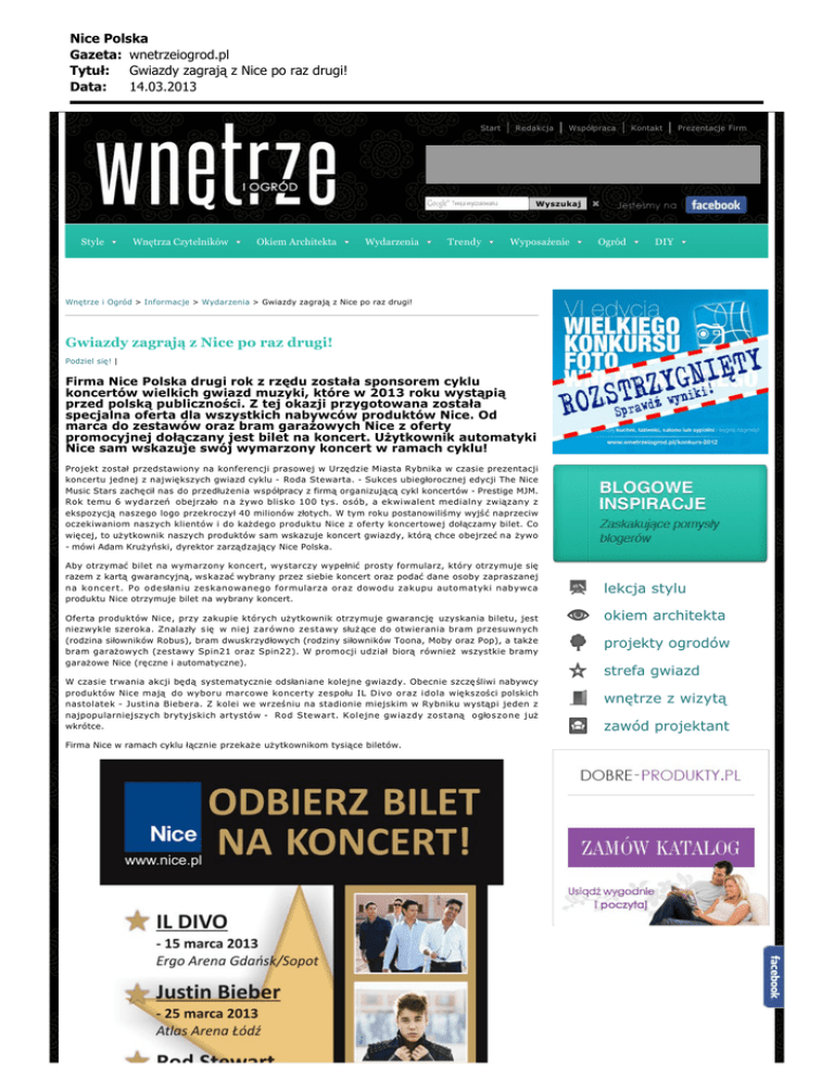 Nice Polska Gazeta: wnetrzeiogrod.pl Tytu³: Gwiazdy zagraj¹ z Nice po raz drugi! Data: 14.03.2013 Start Redakcja Współpraca Wyszukaj Style Wnętrza Czytelników Okiem Architekta Wydarzenia Trendy Wyposażenie Kontakt Prezentacje Firm Ogród DIY Wnętrze i Ogród > Informacje > Wydarzenia > Gwiazdy zagrają z Nice po raz drugi! Gwiazdy zagrają z Nice po raz drugi! Podziel się! | Firma Nice Polska drugi rok z rzędu została sponsorem cyklu koncertów wielkich gwiazd muzyki, które w 2013 roku wystąpią przed polską publiczności. Z tej okazji przygotowana została specjalna oferta dla wszystkich nabywców produktów Nice. Od marca do zestawów oraz bram garażowych Nice z oferty promocyjnej dołączany jest bilet na koncert. Użytkownik automatyki Nice sam wskazuje swój wymarzony koncert w ramach cyklu! Projekt został przedstawiony na konferencji prasowej w Urzędzie Miasta Rybnika w czasie prezentacji koncertu jednej z największych gwiazd cyklu - Roda Stewarta. - Sukces ubiegłorocznej edycji The Nice Music Stars zachęcił nas do przedłużenia współpracy z firmą organizującą cykl koncertów - Prestige MJM. Rok temu 6 wydarzeń obejrzało n a żywo blisko 100 tys. osób, a ekwiwalent medialny związany z ekspozycją naszego logo przekroczył 40 milionów złotych. W tym roku postanowiliśmy wyjść naprzeciw oczekiwaniom naszych klientów i do każdego produktu Nice z oferty koncertowej dołączamy bilet. Co więcej, to użytkownik naszych produktów sam wskazuje koncert gwiazdy, którą chce obejrzeć na żywo - mówi Adam Krużyński, dyrektor zarządzający Nice Polska. Aby otrzymać bilet na wymarzony koncert, wystarczy wypełnić prosty formularz, który otrzymuje się razem z kartą gwarancyjną, wskazać wybrany przez siebie koncert oraz podać dane osoby zapraszanej n a k o n c e r t . P o o d e słaniu zeskanowanego formularza oraz dowodu zakupu automatyki nabywca produktu Nice otrzymuje bilet na wybrany koncert. Oferta produktów Nice, przy zakupie których użytkownik otrzymuje gwarancję uzyskania biletu, jest niezwykle szeroka. Znalazły s ię w niej zarówno zestawy służ ące do otwierania bram przesuwnych (rodzina siłowników Robus), bram dwuskrzydłowych (rodziny siłowników Toona, Moby oraz Pop), a także bram garażowych (zestawy Spin21 oraz Spin22). W promocji udział biorą również wszystkie bramy garażowe Nice (ręczne i automatyczne). W czasie trwania akcji będą systematycznie odsłaniane kolejne gwiazdy. Obecnie szczę śliwi nabywcy produktów Nice mają do wyboru marcowe koncerty zespołu IL Divo oraz idola większości polskich nastolatek - Justina Biebera. Z kolei we wrześniu na stadionie miejskim w Rybniku wystąpi jeden z najpopularniejszych brytyjskich artystów - Rod Stewart. Kolejne gwiazdy zostaną o głoszone już wkrótce. Firma Nice w ramach cyklu łącznie przekaże użytkownikom tysiące biletów. lekcja stylu okiem architekta projekty ogrodów strefa gwiazd wnętrze z wizytą zawód projektant Nice Polska Gazeta: wnetrzeiogrod.pl Tytu³: Gwiazdy zagraj¹ z Nice po raz drugi! Data: 14.03.2013 Koncerty w ramach The Nice Music Stars: 15.03.2013 IL Divo (PGE Arena, Gdańsk) 25.03.2013 Justin Bieber (Atlas Arena, Łó dź) 14.09.2013 Rod Stewart (Stadion Miejski, Rybnik) PRZECZYTAJ TAKŻE Nice koncertuje z największymi gwiazdami! Promocja Nice Siłowniki Nice Wingo komfort sterowania bramą Komentarze Na razie nie ma komentarzy. Bądź pierwszy! Wyślij nowy komentarz 5 Tutaj wpisz tekst! 6 Komentuj jako Goś ć, albo zaloguj się: facebook Imię Email Wyświetlane przy twoich komentarzach. Nie wyświetla się publicznie. Zapisz się na Brak Wydawnictwo Strona www (opcjonalnie) Jeśli masz stronę www, podlikuj ją tutaj. 6 Wyślij Komentarz PROJEKTY DOMÓW WYDAWNICTWO NASZE SERWISY INTERNETOWE DOBRY DOM 35-302 Rzeszów • parterowe • Projekty Domów • projekty domów ul. Litewska 10 • z poddaszem • Domy Drewniane • wnętrza domów • piętrowe • Wnętrze i Ogród • portal ciążowy tel.: +48 17 852 52 20 • energooszczędne • Wnętrza Domów • projekty domów drewnianych e-mail: [email protected] • bliźniaki • DOBRA MAMA • informacje z branży budowlanej • szeregówki • Prenumerata • informacje targowe • garaże • altany ogrodowe Nice Polska Gazeta: wnetrzeiogrod.pl Tytu³: Gwiazdy zagraj¹ z Nice po raz drugi! Data: 14.03.2013