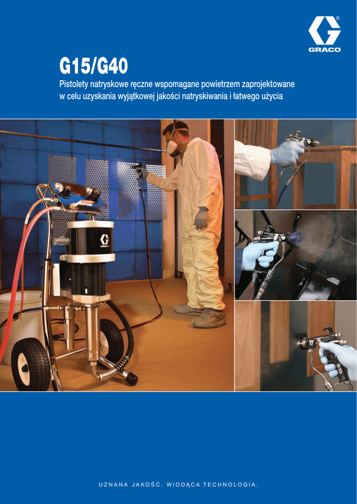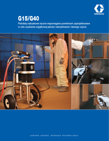 G15/G40 Pistolety natryskowe ręczne wspomagane powietrzem zaprojektowane w celu uzyskania wyjątkowej jakości natryskiwania i łatwego użycia UZNANA JAKOŚĆ. WIODĄCA TECHNOLOGIA. Wyjątkowa jakość natryskiwania Maksymalna wygoda i kontrola przy zmniejszeniu zmęczenia operatora! W pistoletach serii G15/G40 zastosowano elementy wysokiej jakości gwarantujące długotrwałą niezawodność. Co najważniejsze, pistolety G15/G40 zapewniają wyjątkową wydajność natryskiwania, jednocześnie zwiększając skuteczność nanoszenia i zmniejszając zużycie materiałów. Pistolety G15/G40 zostały ZMODERNIZOWANE! • Seria dysz AAF została zaprojektowana pod kątem miękkiego natryskiwania i zwiększonej skuteczności nanoszenia Różnorodne zastosowania wymagają różnych pistoletów G15 – modele 105 bar (1500 psi) dla przemysłu drzewnego i innych zastosowań wymagających niskich i średnich ciśnień • Trwalsze uszczelnienie iglicy – nawet w przypadku materiałów o właściwościach ściernych • Solidniejsze gwinty pierścienia podtrzymującego głowicę rozpylającą • Pierścień podtrzymujący w głowicy rozpylającej w przypadku wszystkich dysz G40 – modele 280 bar (4000 psi) do zastosowań przemysłowych wymagających wysokich ciśnień • Łatwiejszy demontaż zintegrowanego filtra materiału w pistolecie – nie potrzeba gwintów ani narzędzi • Indeksowanie głowicy rozpylającej G15 zapewniające zwiększoną wytrzymałość G40 RAC – model 280 bar (4000 psi) z dyszą typu Reverse-A-Clean do zastosowań wymagających wysokiego ciśnienia 2 Pistolety wspomagane powietrzem G15/G40 Jakość natryskiwania Uzyskanie pierwszorzędnego wykończenia • Udoskonalona konstrukcja dyszy zapewnia równomierne rozpylanie i doskonałą jakość wykończenia • Unikatowa dysza powietrzna umożliwia miękkie natryskiwanie • Niższe ciśnienie materiału i powietrza zwiększa skuteczność nanoszenia • Regulowany kształt strumienia oznacza mniejsze nadmierne natryskiwanie, mniejsze straty materiału, mniej lotnych związków organicznych (VOC) oraz zwiększoną produktywność Ergonomia Maksymalizacja produktywności • Ogólny ciężar i wyważenie pistoletu są lepsze w porównaniu z innymi pistoletami w tej kategorii • Siła pociągania za spust jest wyjątkowo mała, przez co zmniejsza się zmęczenie operatora i naprężenie mięśni • Konstrukcja spustu pasuje do każdej dłoni i zwiększa komfort pracy operatora Zestawy ze wspomaganiem powietrznym Merkur™ Wysoka wydajność wykańczania! Pompy wysokiej jakości polepszają każdy system obróbki wykończeniowej. W połączeniu z pistoletami natryskowymi wspomaganymi powietrzem G15/G40 pakiety do obróbki wykończeniowej Merkur zostały zaprojektowane pod kątem zwiększenia wydajności produkcyjnej, obniżenia kosztów i emisji oraz zapewnienia jednorodnego, wysokiej jakości wykończenia dla wszystkich wymagających zastosowań. Wysokiej jakości wykończenie Niskie pulsacje i łagodne przełączenie pompy zapewniają stały wzór natrysku. Łatwość obsługi Łatwa w płukaniu konstrukcja umożliwia szybkie zmiany koloru i mniejsze zużycie rozpuszczalnika. Odporna konstrukcja Konstrukcja pomp ze stali nierdzewnej serii 300 zapewnia długotrwałą wytrzymałość. Koszty posiadania Oszczędność czasu i pieniędzy • Łatwy montaż i demontaż skraca czas napraw • Projekt minimalizujący zużycie części zamiennych • Mniej części to niższe koszty napraw 3 Zaprojektowany z myślą o użytkowniku Szybkie i dokładne pozycjonowanie! Dysza powietrzna indeksująca zapewnia szybkie, a zarazem dokładne pozycjonowanie w poziomie i pionie. 2 6 3 4 5 Zmniejszenie nadmiernego natryskiwania i zwiększenie produktywności! Regulacja kształtu strumienia na 3/4 obrotu umożliwia operatorowi zmianę szerokości natryskiwania w zależności od rozmiarów części. Pistolet wspomagany powietrzem G15/G40 1. Hak o wysokiej wytrzymałości 2. Element przytrzymujący dyszę powietrzną 3. Dysza powietrzna do indeksowania (tylko G15) 4. Dysze optymalnego kształtu natryskiwania 5. Dysza powietrzna do miękkiego natryskiwania A 6. Szybko wymienialny zestaw iglicy/gniazda 7. Spust obsługiwany bardzo lekkim naciskiem A A 8. Wbudowany filtr szeregowy 9. Regulacja kształtu strumienia na 3/4 obrotu A 10. Lekka konstrukcja (450 g) 11. Ergonomiczny uchwyt 12. Optymalne kąty podłączenia węża 13. Opcjonalne połączenie obrotowe materiału (niski profil) 4 1 9 Zwiększona wydajność natryskiwania! Udoskonalona konstrukcja dyszy zapewnia równomierne rozpylanie i lepszą jakość wykończenia. 10 11 7 Trzy linie dysz wspomaganych powietrzem spełniające wymagania różnych zastosowań Dysze AAF – dysze do precyzyjnego wykańczania z otworem wstępnym do miękkiego natryskiwania oraz zwiększającym skuteczność nanoszenia Dysze AAM – dysze do precyzyjnego wykańczania zalecane dla wysokiej jakości natrysku przy niskim i średnim ciśnieniu Dysze GG4 – odporne na zużycie dysze do wykańczania przemysłowego przy wysokim ciśnieniu 12 8 13 Wszystkie dysze mają pierścień podtrzymujący je w głowicy rozpylającej. 5 Informacje wymagane do zamówienia Modele pistoletów wspomaganych powietrzem – informacje o produktach MODELE PISTOLETÓW AIR-ASSISTED • Model węglikowy G15 zalecany do materiałów o lepkości od niskiej do średniej • Model G15 z gniazdem acetalowym zalecany do materiałów katalizowanych kwasem • Modele G40 zalecane do materiałów o wysokiej lepkości, powyżej 105 bar (1500 psi) 24C853 G15 – węglikowy pistolet natryskowy wspomagany powietrzem Pistolet do zastosowań przy średnim ciśnieniu z gniazdem węglikowym, indeksującą głowicą rozpylającą oraz dyszą AAM lub AAF dobieraną z tabeli, którą określa się podczas składania zamówienia. 24C854 G15 – pistolet wspomagany powietrzem G15 Pistolet na średnie ciśnienie z gniazdem plastikowym i indeksującą głow