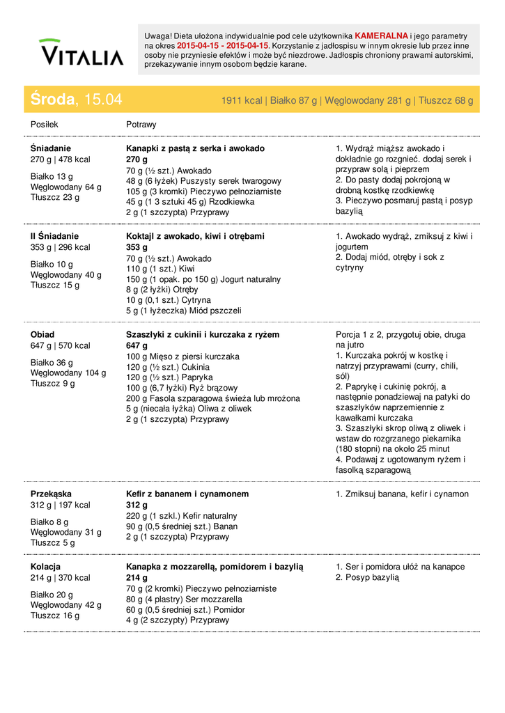 Uwaga! Dieta ułożona indywidualnie pod cele użytkownika KAMERALNA i jego parametry na okres 2015-04-15 - 2015-04-15. Korzystanie z jadłospisu w innym okresie lub przez inne osoby nie przyniesie efektów i może być niezdrowe. Jadłospis chroniony prawami autorskimi, przekazywanie innym osobom będzie karane. Środa, 15.04 Posiłek Potrawy Śniadanie 270 g | 478 kcal Kanapki z pastą z serka i awokado 270 g 70 g (½ szt.) Awokado 48 g (6 łyżek) Puszysty serek twarogowy 105 g (3 kromki) Pieczywo pełnoziarniste 45 g (1 3 sztuki 45 g) Rzodkiewka 2 g (1 szczypta) Przyprawy 1. Wydrąż miąższ awokado i dokładnie go rozgnieć. dodaj serek i przypraw solą i pieprzem 2. Do pasty dodaj pokrojoną w drobną kostkę rzodkiewkę 3. Pieczywo posmaruj pastą i posyp bazylią Koktajl z awokado, kiwi i otrębami 353 g 70 g (½ szt.) Awokado 110 g (1 szt.) Kiwi 150 g (1 opak. po 150 g) Jogurt naturalny 8 g (2 łyżki) Otręby 10 g (0,1 szt.) Cytryna 5 g (1 łyżeczka) Miód pszczeli 1. Awokado wydrąż, zmiksuj z kiwi i jogurtem 2. Dodaj miód, otręby i sok z cytryny Szaszłyki z cukinii i kurczaka z ryżem 647 g 100 g Mięso z piersi kurczaka 120 g (½ szt.) Cukinia 120 g (½ szt.) Papryka 100 g (6,7 łyżki) Ryż brązowy 200 g Fasola szparagowa świeża lub mrożona 5 g (niecała łyżka) Oliwa z oliwek 2 g (1 szczypta) Przyprawy Porcja 1 z 2, przygotuj obie, druga na jutro 1. Kurczaka pokrój w kostkę i natrzyj przyprawami (curry, chili, sól) 2. Paprykę i cukinię pokrój, a następnie ponadziewaj na patyki do szaszłyków naprzemiennie z kawałkami kurczaka 3. Szaszłyki skrop oliwą z oliwek i wstaw do rozgrzanego piekarnika (180 stopni) na około 25 minut 4. Podawaj z ugotowanym ryżem i fasolką szparagową Kefir z bananem i cynamonem 312 g 220 g (1 szkl.) Kefir naturalny 90 g (0,5 średniej szt.) Banan 2 g (1 szczypta) Przyprawy 1. Zmiksuj banana, kefir i cynamon Kanapka z mozzarellą, pomidorem i bazylią 214 g 70 g (2 kromki) Pieczywo pełnoziarniste 80 g (4 plastry) Ser mozzarella 60 g (0,5 średniej szt.) Pomidor 4 g (2 szczypty) Przyprawy 1. Ser i pomidora ułóż na kanapce 2. Posyp bazylią Białko 13 g Węglowodany 64 g Tłuszcz 23 g II Śniadanie 353 g | 296 kcal Białko 10 g Węglowodany 40 g Tłuszcz 15 g Obiad 647 g | 570 kcal Białko 36 g Węglowodany 104 g Tłuszcz 9 g Przekąska 312 g | 197 kcal Białko 8 g Węglowodany 31 g Tłuszcz 5 g Kolacja 214 g | 370 kcal Białko 20 g Węglowodany 42 g Tłuszcz 16 g Powered by TCPDF (www.tcpdf.org) 1911 kcal | Białko 87 g | Węglowodany 281 g | Tłuszcz 68 g