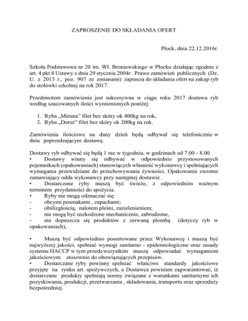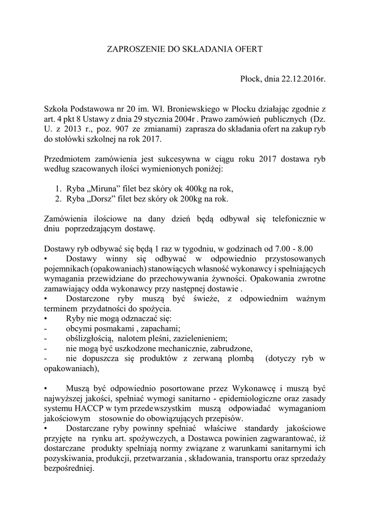 ZAPROSZENIE DO SKŁADANIA OFERT Płock, dnia 22.12.2016r. Szkoła Podstawowa nr 20 im. Wł. Broniewskiego w Płocku działając zgodnie z art. 4 pkt 8 Ustawy z dnia 29 stycznia 2004r . Prawo zamówień publicznych (Dz. U. z 2013 r., poz. 907 ze zmianami) zaprasza do składania ofert na zakup ryb do stołówki szkolnej na rok 2017. Przedmiotem zamówienia jest sukcesywna w ciągu roku 2017 dostawa ryb według szacowanych ilości wymienionych poniżej: 1. Ryba „Miruna” filet bez skóry ok 400kg na rok, 2. Ryba „Dorsz” filet bez skóry ok 200kg na rok. Zamówienia ilościowe na dany dzień będą odbywał się telefonicznie w dniu poprzedzającym dostawę. Dostawy ryb odbywać się będą 1 raz w tygodniu, w godzinach od 7.00 - 8.00 • Dostawy winny się odbywać w odpowiednio przystosowanych pojemnikach (opakowaniach) stanowiących własność wykonawcy i spełniających wymagania przewidziane do przechowywania żywności. Opakowania zwrotne zamawiający odda wykonawcy przy następnej dostawie . • Dostarczone ryby muszą być świeże, z odpowiednim ważnym terminem przydatności do spożycia. • Ryby nie mogą odznaczać się: obcymi posmakami , zapachami; obślizgłością, nalotem pleśni, zazielenieniem; nie mogą być uszkodzone mechanicznie, zabrudzone, nie dopuszcza się produktów z zerwaną plombą (dotyczy ryb w opakowaniach), • Muszą być odpowiednio posortowane przez Wykonawcę i muszą być najwyższej jakości, spełniać wymogi sanitarno - epidemiologiczne oraz zasady systemu HACCP w tym przede wszystkim muszą odpowiadać wymaganiom jakościowym stosownie do obowiązujących przepisów. • Dostarczane ryby powinny spełniać właściwe standardy jakościowe przyjęte na rynku art. spożywczych, a Dostawca powinien zagwarantować, iż dostarczane produkty spełniają normy związane z warunkami sanitarnymi ich pozyskiwania, produkcji, przetwarzania , składowania, transportu oraz sprzedaży bezpośredniej. Wykonawcy ubiegający się o udzielenie zamówienia muszą posiadać uprawnienia do wykonywania określonej działalności lub czynności. Rozliczenia za dostawę zamówionego towaru będą odbywały się na postawie faktur wystawionych przez Dostawcę. Faktury będą posiadały 14 dniowy termin płatności i będą wystawione na następujące dane: NABYWCA: Gmina-Miasto Płock Pl. Stary Rynek 1 09-400 Płock NIP 774-31-35-712 Odbiorca/Płatnik/Adresat: Szkoła Podstawowa nr 20 im. Wł. Broniewskiego w Płocku ul. J. Korczaka 10, 09-408 Płock Dokumenty wymagane od Wykonawców: Aktualny odpis z właściwego rejestru lub z centralnej ewidencji i informacji o działalności gospodarczej . Oświadczenie Wykonawcy o: wp1s1e do rejestru zakładów podlegających kontroli Państwowej Inspekcji Sanitarnej , wprowadzeniu systemu HACCP, posiadaniu zgody właściwego organu inspekcji sanitarnej na przewóz (transport) ryb - zał . nr 2. Pełnomocnictwo , jeżeli oferta będzie podpisana przez pełnomocnika . Wypełniony formularz ofert (zał. nr 1). Oferty należy składać w sekretariacie szkoły na formularzu stanowiącym załącznik nr 1 do niniejszego zaproszenia do składania ofert w zamkniętej kopercie z dopiskiem „oferta na dostawę ryb" lub drogą elektroniczną na adres [email protected] w formacie „pdf” do dnia 02 stycznia 2017r .do godz. 15:00. Formularz powinien zostać podpisany przez osobę upoważnioną. Zamawiający informuje, że ilości oraz rodzaj wymienionych ryb mają charakter wstępny i w ciągu roku mogą ulec zmianie według bieżących potrzeb. Cena oferty musi uwzględniać dostawę ryb do siedziby Zamawiającego. W związku z zamówieniami pilnymi zaleca się aby siedziba, oddział lub przedstawicielstwo firmy znajdowało się do 20 km od granic miasta Płocka w celu skrócenia czasu dostawy. Przy dokonywaniu wyboru najkorzystniejszej oferty Zamawiający stosować będzie kryterium najniższej ceny. Dyrektor szkoły Elżbieta Kusy