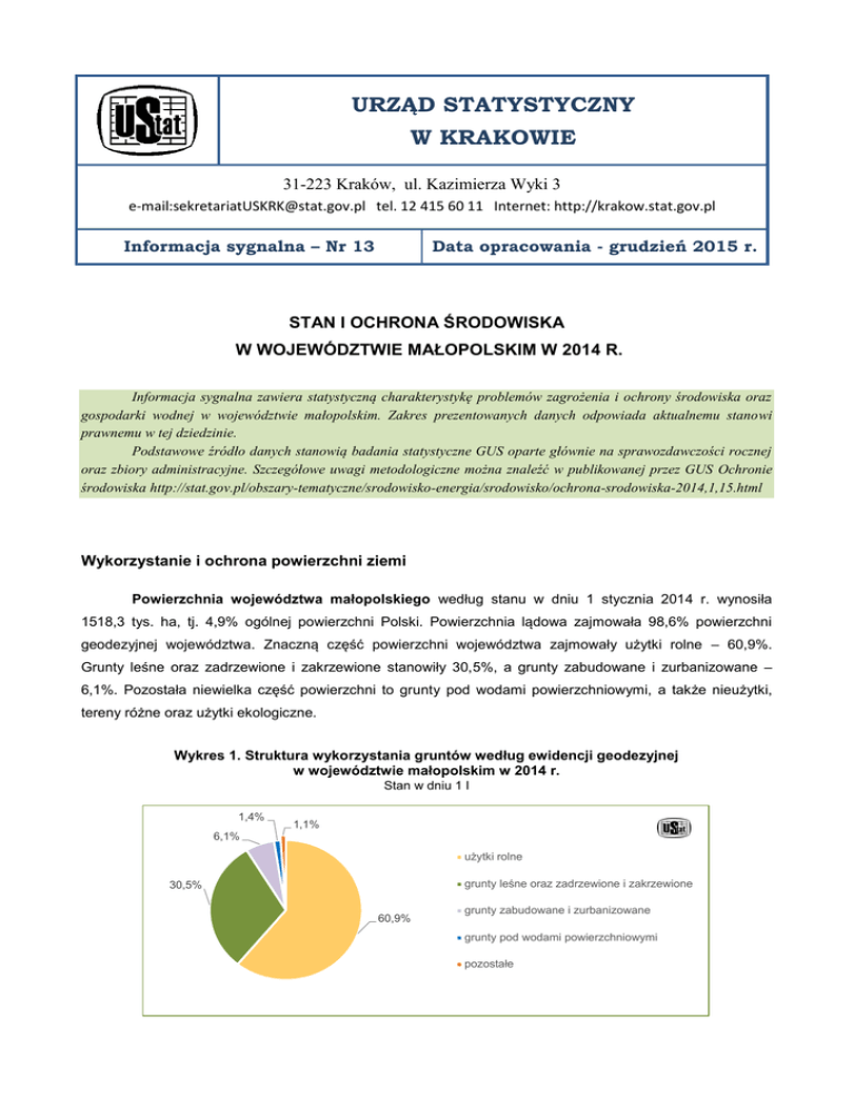 URZĄD STATYSTYCZNY W KRAKOWIE 31-223 Kraków, ul. Kazimierza Wyki 3 e-mail:[email protected] tel. 12 415 60 11 Internet: http://krakow.stat.gov.pl Informacja sygnalna – Nr 13 Data opracowania - grudzień 2015 r. STAN I OCHRONA ŚRODOWISKA W WOJEWÓDZTWIE MAŁOPOLSKIM W 2014 R. Informacja sygnalna zawiera statystyczną charakterystykę problemów zagrożenia i ochrony środowiska oraz gospodarki wodnej w województwie małopolskim. Zakres prezentowanych danych odpowiada aktualnemu stanowi prawnemu w tej dziedzinie. Podstawowe źródło danych stanowią badania statystyczne GUS oparte głównie na sprawozdawczości rocznej oraz zbiory administracyjne. Szczegółowe uwagi metodologiczne można znaleźć w publikowanej przez GUS Ochronie środowiska http://stat.gov.pl/obszary-tematyczne/srodowisko-energia/srodowisko/ochrona-srodowiska-2014,1,15.html Wykorzystanie i ochrona powierzchni ziemi Powierzchnia województwa małopolskiego według stanu w dniu 1 stycznia 2014 r. wynosiła 1518,3 tys. ha, tj. 4,9% ogólnej powierzchni Polski. Powierzchnia lądowa zajmowała 98,6% powierzchni geodezyjnej województwa. Znaczną część powierzchni województwa zajmowały użytki rolne – 60,9%. Grunty leśne oraz zadrzewione i zakrzewione stanowiły 30,5%, a grunty zabudowane i zurbanizowane – 6,1%. Pozostała niewielka część powierzchni to grunty pod wodami powierzchniowymi, a także nieużytki, tereny różne oraz użytki ekologiczne. Wykres 1. Struktura wykorzystania gruntów według ewidencji geodezyjnej w województwie małopolskim w 2014 r. Stan w dniu 1 I 1,4% 1,1% 6,1% użytki rolne grunty leśne oraz zadrzewione i zakrzewione 30,5% 60,9% grunty zabudowane i zurbanizowane grunty pod wodami powierzchniowymi pozostałe -2W odniesieniu do stanu z dnia 1 stycznia 2013 r. w województwie małopolskim zwiększyła się powierzchnia m.in. gruntów zabudowanych i zurbanizowanych (o 2,0 tys. ha), gruntów leśnych oraz zadrzewionych i zakrzewionych (o 0,7 tys. ha), natomiast zmniejszeniu uległa powierzchnia użytków rolnych (o 2,6 tys. ha). Na użytki rolne, zajmujące łącznie 924,3 tys. ha, składały się w przeważającej mierze grunty orne (71,2%), w dalszej kolejności łąki i pastwiska trwałe (20,7%), grunty rolne zabudowane (4,3%), sady (3,1%), a pozostała niewielka część powierzchni (0,8%) przypadała na grunty pod stawami i rowami. Grunty leśne oraz zadrzewione i zakrzewione – 463,8 tys. ha – w 95,0% były zajęte przez lasy. Grunty zabudowane i zurbanizowane – 92,1 tys. ha – w prawie połowie (w 49,7%) przeznaczone były pod tereny komunikacyjne, głównie pod drogi. Wykres 2. Struktura wykorzystania gruntów zabudowanych i zurbanizowanych w województwie małopolskim w 2014 r. Stan w dniu 1 I 2,2% 3,6% tereny komunikacyjne - drogi 1,8% tereny mieszkaniowe 4,8% tereny inne zabudowane 8,3% 44,9% tereny przemysłowe 10,1% tereny komunikacyjne - kolejowe tereny rekreacji i wypoczynku tereny zurbanizowane niezabudowane 24,3% pozostałe Tereny wiejskie zajmowały łącznie obszar 1352,7 tys. ha i stanowiły 89,1% ogólnej powierzchni województwa małopolskiego, a tereny miejskie – 165,6 tys. ha (10,9%). Z produkcji rolniczej i leśnej w 2014 r. wyłączono 210 ha gruntów rolnych i leśnych, w tym 175 ha gruntów rolnych i 35 ha gruntów leśnych. Grunty te przeznaczono głównie na tereny osiedlowe (133 ha). Jest to porównywalne do zmian w 2013 r., kiedy to z produkcji rolniczej i leśnej wyłączono 173 ha (w tym 115 ha na tereny osiedlowe). Powierzchnia gruntów zdewastowanych i zdegradowanych wymagających zagospodarowania i rekultywacji według stanu w dniu 31 XII 2014 r. wynosiła 1928 ha, czyli o 8,2% więcej niż w 2013 r. W ciągu omawianego roku zrekultywowano 167 ha, w tym na cele rolnicze przeznaczono 152 ha, a na cele leśne – tylko 2 ha. Ponadto zagospodarowano 84 ha – w tym 81 ha na cele rolnicze. Przed rokiem, z 1782 ha gruntów wymagających rekultywacji (stan w końcu 2013 r.) zrekultywowano 100 ha, w tym 86 ha przeznaczono na cele rolnicze i 4 ha na cele leśne. Jednocześnie w ciągu 12 miesięcy 2013 r. zagospodarowano łącznie 16 ha, w tym na cele rolnicze – 13 ha. Ogółem, w 2014 r. zrekultywowano i zagospodarowano 251 ha, w tym 233 ha na cele rolnicze (wobec 116 ha w 2013 r., z czego 99 ha – na cele rolnicze). -3- Ochrona przyrody i różnorodności biologicznej. Lasy Obszary prawnie chronione w województwie małopolskim według stanu w dniu 31 XII 2014 r. zajmowały łącznie 790,8 tys. ha, co stanowiło 52,1% powierzchni ogólnej województwa i 7,8% powierzchni chronionej w Polsce. W odniesieniu do stanu z 2013 r. powierzchnia obszarów prawnie chronionych nieznacznie się zmieniła – zwiększyła się o 28,5 ha. W strukturze obszarów objętych ochroną prawną dominują obszary chronionego krajobrazu (72,5% areału chronionego oraz 37,7% powierzchni ogólnej), jak również parki krajobrazowe (22,5% areału chronionego). Z kolei parki narodowe stanowiły 4,8% powierzchni prawnie chronionej województwa. Według powiatów, najwięcej obszarów chronionych odnotowano w nowotarskim – 130,5 tys. ha, nowosądeckim – 126,4 tys. ha oraz w tarnowskim – 105,9 tys. ha. Największy udział obszarów chronionych w powierzchni danego powiatu odnotowano w: tatrzańskim (92,9%), nowotarskim (88,5%), miechowskim (86,4%), nowosądeckim (81,5%), brzeskim (75,9%) i tarnowskim (75,0%). Natomiast relatywnie najmniej obszarów tego typu posiadało miasto Tarnów (0,1%) oraz powiaty: wielicki (0,3%) i oświęcimski (0,6%). W Krakowie obszary objęte ochroną prawną wynosiły 4,9 tys. ha i stanowiły 14,9% powierzchni miasta. W omawianym roku na 1 mieszkańca w województwie przypadało 2,4 tys. m 2 powierzchni obszarów prawnie chronionych, przy czym najwięcej w powiecie miechowskim – 11,7 tys. m2, a najmniej w Tarnowie – zaledwie 1 m2. W Krakowie na 1 mieszkańca przypadały 64 m 2 powierzchni prawnie chronionej. Wykres 3. Powierzchnia 