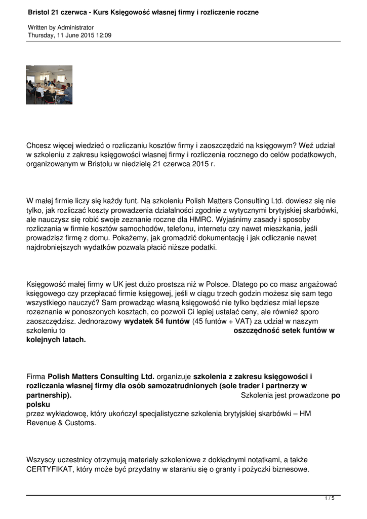 Bristol 21 czerwca - Kurs Księgowość własnej firmy i rozliczenie roczne Written by Administrator Thursday, 11 June 2015 12:09 Chcesz więcej wiedzieć o rozliczaniu kosztów firmy i zaoszczędzić na księgowym? Weź udział w szkoleniu z zakresu księgowości własnej firmy i rozliczenia rocznego do celów podatkowych, organizowanym w Bristolu w niedzielę 21 czerwca 2015 r. W małej firmie liczy się każdy funt. Na szkoleniu Polish Matters Consulting Ltd. dowiesz się nie tylko, jak rozliczać koszty prowadzenia działalności zgodnie z wytycznymi brytyjskiej skarbówki, ale nauczysz się robić swoje zeznanie roczne dla HMRC. Wyjaśnimy zasady i sposoby rozliczania w firmie kosztów samochodów, telefonu, internetu czy nawet mieszkania, jeśli prowadzisz firmę z domu. Pokażemy, jak gromadzić dokumentację i jak odliczanie nawet najdrobniejszych wydatków pozwala płacić niższe podatki. Księgowość małej firmy w UK jest dużo prostsza niż w Polsce. Dlatego po co masz angażować księgowego czy przepłacać firmie księgowej, jeśli w ciągu trzech godzin możesz się sam tego wszystkiego nauczyć? Sam prowadząc własną księgowość nie tylko będziesz miał lepsze rozeznanie w ponoszonych kosztach, co pozwoli Ci lepiej ustalać ceny, ale również sporo zaoszczędzisz. Jednorazowy wydatek 54 funtów (45 funtów + VAT) za udział w naszym szkoleniu to oszczędność setek funtów w kolejnych latach. Firma Polish Matters Consulting Ltd. organizuje szkolenia z zakresu księgowości i rozliczania własnej firmy dla osób samozatrudnionych (sole trader i partnerzy w partnership). Szkolenia jest prowadzone po polsku przez wykładowcę, który ukończył specjalistyczne szkolenia brytyjskiej skarbówki – HM Revenue & Customs. Wszyscy uczestnicy otrzymują materiały szkoleniowe z dokładnymi notatkami, a także CERTYFIKAT, który może być przydatny w staraniu się o granty i pożyczki biznesowe. 1/5 Bristol 21 czerwca - Kurs Księgowość własnej firmy i rozliczenie roczne Written by Administrator Thursday, 11 June 2015 12:09 Zdjęcia z kursów można obejrzeć na stonie facebookowej firmy: http://facebook.com/PolishMat tersConsultingLtd SZCZEGÓŁOWY PROGRAM TO: 1.Jak dokumentować własne przychody: a) wystawianie rachunków, w tym wystawianie rachunków klientom zagranicznym, np. do Polski; b) wystawianie paragonów; c) inne sposoby. 2.Jak dokumentować własne wydatki - zakupy i koszty (w tym: jak rozliczać rachunki zagraniczne, np. z Polski). 3.Środki trwałe - co to jest i jak prowadzić ich dokumentację. 4.Jakie koszty prowadzenia działalności – co można odliczyć, a co nie? 5.Rozliczanie samochodu w firmie. 6.Rozliczanie kosztów prywatnych telefonów, komórek i Internetu, wykorzystywanych do 2/5 Bristol 21 czerwca - Kurs Księgowość własnej firmy i rozliczenie roczne Written by Administrator Thursday, 11 June 2015 12:09 prowadzenia działalności gospodarczej. 7.Rozliczanie kosztów mieszkania w przypadku pracy z domu. 8.Podatki i składki National Insurance samozatrudnionego w roku podatkowym 2014/2015 i 2015/2016 9.Terminy rozliczeń i opłacania podatków i składek. 10.Roczne zeznanie podatkowe w formie papierowej. 11.Rejestracja do zeznania podatkowego online. 12.Roczne zeznanie podatkowe online. 13.Wpłata należności/ zwrot nadpłaty. 14.Gdzie szukać informacji i pomocy? Mała grupa - maksymalnie 14 osób. Cena - 54 funty (45.00 + VAT). Adres: 3/5 Bristol 21 czerwca - Kurs Księgowość własnej firmy i rozliczenie roczne Written by Administrator Thursday, 11 June 2015 12:09 Patchway Community Association Rodway Road Patchway BS34 5PF (bezpłatny parking pod budynkiem) Data: niedziela, 21 czerwca 2015 r. w godz. od 10.00 do 13.15 (2 x 1,5 godziny z 15-minutową przerwą) Zainteresowanych prosimy o zgłoszenia z podaniem: ü imienia i nazwiska uczestnika 4/5 Bristol 21 czerwca - Kurs Księgowość własnej firmy i rozliczenie roczne Written by Administrator Thursday, 11 June 2015 12:09 ü numeru telefonu kontaktowego (komórkowego) ü adresu e-mailowego Zgłoszenia przyjmowane są: - telefonicznie pod numerem stacjonarnym 01670 33 65 44 od poniedziałku do piątku godzinach od 9.00 do 17.00 - SMS-em wysłanym na numer 077 235 445 62 - e-mailowo – [email protected] - za pomocą formularza kontaktowego - http://twojsukcesuk.co.uk/index.php/biznes-i-finans e/biznes-i-finanse-nowe/formularz-zgloszenia-na-kurs UWAGA (uaktualnienie z 17 czerwca): Nie ma już wolnych miejsc na ten kurs. Przyjmujemy zapisy na kolejny kurs z tej tematyki, jaki odbędzie się w Bristolu w drugiej połowie sierpnia lub na początku września. Dokładną datę podamy wkrótce. Firma Polish Matters Consulting Ltd. 5/5