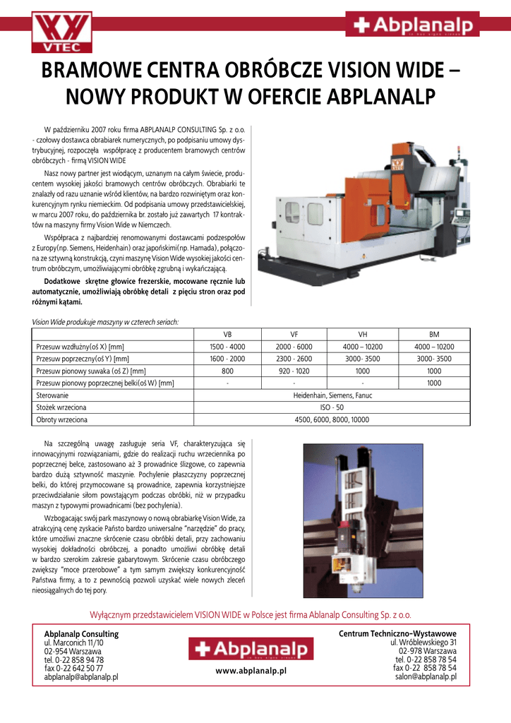 BRAMOWE CENTRA OBRÓBCZE VISION WIDE – NOWY PRODUKT W OFERCIE ABPLANALP W październiku 2007 roku firma ABPLANALP CONSULTING Sp. z o.o. - czo³owy dostawca obrabiarek numerycznych, po podpisaniu umowy dystrybucyjnej, rozpoczê³a wspó³pracê z producentem bramowych centrów obróbczych - firm¹ VISION WIDE Nasz nowy partner jest wiod¹cym, uznanym na ca³ym świecie, producentem wysokiej jakości bramowych centrów obróbczych. Obrabiarki te znalaz³y od razu uznanie wśród klientów, na bardzo rozwiniêtym oraz konkurencyjnym rynku niemieckim. Od podpisania umowy przedstawicielskiej, w marcu 2007 roku, do października br. zosta³o ju¿ zawartych 17 kontraktów na maszyny firmy Vision Wide w Niemczech. Wspó³praca z najbardziej renomowanymi dostawcami podzespo³ów z Europy(np. Siemens, Heidenhain) oraz japoñskimi(np. Hamada), po³¹czona ze sztywn¹ konstrukcj¹, czyni maszynê Vision Wide wysokiej jakości centrum obróbczym, umo¿liwiaj¹cymi obróbkê zgrubn¹ i wykañczaj¹c¹. Dodatkowe skrêtne g³owice frezerskie, mocowane rêcznie lub automatycznie, umo¿liwiaj¹ obróbkê detali z piêciu stron oraz pod ró¿nymi k¹tami. Vision Wide produkuje maszyny w czterech seriach: VB VF VH BM Przesuw wzd³u¿ny(oś X) [mm] 1500 - 4000 2000 - 6000 4000 – 10200 4000 – 10200 Przesuw poprzeczny(oś Y) [mm] 1600 - 2000 2300 - 2600 3000- 3500 3000- 3500 800 920 - 1020 1000 1000 - - - 1000 Przesuw pionowy suwaka (oś Z) [mm] Przesuw pionowy poprzecznej belki(oś W) [mm] Sterowanie Heidenhain, Siemens, Fanuc Sto¿ek wrzeciona ISO - 50 Obroty wrzeciona 4500, 6000, 8000, 10000 Na szczególn¹ uwagê zas³uguje seria VF, charakteryzuj¹ca siê innowacyjnymi rozwi¹zaniami, gdzie do realizacji ruchu wrzeciennika po poprzecznej belce, zastosowano a¿ 3 prowadnice ślizgowe, co zapewnia bardzo du¿¹ sztywnośæ maszynie. Pochylenie p³aszczyzny poprzecznej belki, do której przymocowane s¹ prowadnice, zapewnia korzystniejsze przeciwdzia³anie si³om powstaj¹cym podczas obróbki, ni¿ w przypadku maszyn z typowymi prowadnicami (bez pochylenia). Wzbogacaj¹c swój park maszynowy o now¹ obrabiarkê Vision Wide, za atrakcyjn¹ cenê zyskacie Pañsto bardzo uniwersalne “narzêdzie” do pracy, które umo¿liwi znaczne skrócenie czasu obróbki detali, przy zachowaniu wysokiej dok³adności obróbczej, a ponadto umo¿liwi obróbkê detali w bardzo szerokim zakresie gabarytowym. Skrócenie czasu obróbczego zwiêkszy “moce przerobowe” a tym samym zwiêkszy konkurencyjnośæ Pañstwa firmy, a to z pewności¹ pozwoli uzyskaæ wiele nowych zleceñ nieosi¹galnych do tej pory. Wy³¹cznym przedstawicielem VISION WIDE w Polsce jest firma Ablanalp Consulting Sp. z o.o. Abplanalp Consulting ul. Marconich 11/10 02-954 Warszawa tel. 0-22 858 94 78 fax 0-22 642 50 77 [email protected] www.abplanalp.pl Centrum Techniczno-Wystawowe ul. Wróblewskiego 31 02-978 Warszawa tel. 0-22 858 78 54 fax 0-22 858 78 54 [email protected]
