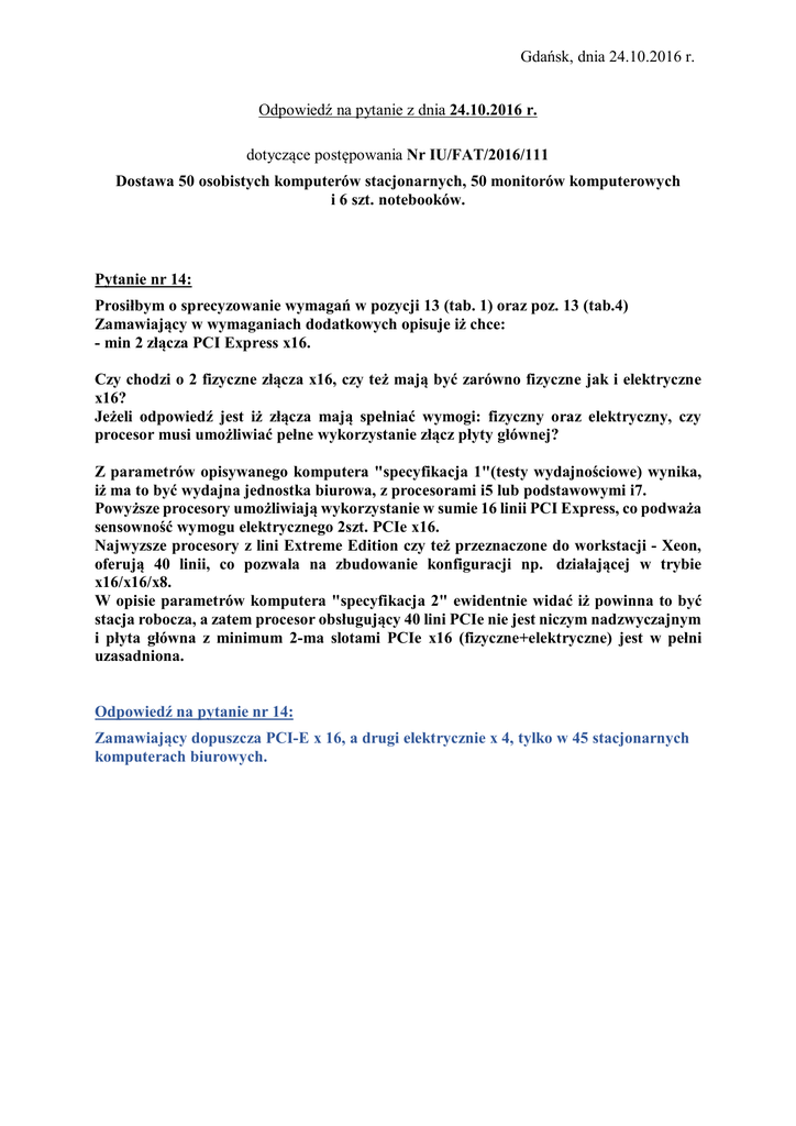 Gdańsk, dnia 24.10.2016 r. Odpowiedź na pytanie z dnia 24.10.2016 r. dotyczące postępowania Nr IU/FAT/2016/111 Dostawa 50 osobistych komputerów stacjonarnych, 50 monitorów komputerowych i 6 szt. notebooków. Pytanie nr 14: Prosiłbym o sprecyzowanie wymagań w pozycji 13 (tab. 1) oraz poz. 13 (tab.4) Zamawiający w wymaganiach dodatkowych opisuje iż chce: - min 2 złącza PCI Express x16. Czy chodzi o 2 fizyczne złącza x16, czy też mają być zarówno fizyczne jak i elektryczne x16? Jeżeli odpowiedź jest iż złącza mają spełniać wymogi: fizyczny oraz elektryczny, czy procesor musi umożliwiać pełne wykorzystanie złącz płyty głównej? Z parametrów opisywanego komputera "specyfikacja 1"(testy wydajnościowe) wynika, iż ma to być wydajna jednostka biurowa, z procesorami i5 lub podstawowymi i7. Powyższe procesory umożliwiają wykorzystanie w sumie 16 linii PCI Express, co podważa sensowność wymogu elektrycznego 2szt. PCIe x16. Najwyzsze procesory z lini Extreme Edition czy też przeznaczone do workstacji - Xeon, oferują 40 linii, co pozwala na zbudowanie konfiguracji np. działającej w trybie x16/x16/x8. W opisie parametrów komputera "specyfikacja 2" ewidentnie widać iż powinna to być stacja robocza, a zatem procesor obsługujący 40 lini PCIe nie jest niczym nadzwyczajnym i płyta główna z minimum 2-ma slotami PCIe x16 (fizyczne+elektryczne) jest w pełni uzasadniona. Odpowiedź na pytanie nr 14: Zamawiający dopuszcza PCI-E x 16, a drugi elektrycznie x 4, tylko w 45 stacjonarnych komputerach biurowych.