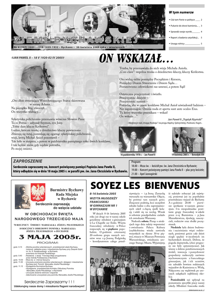 W tym numerze Cóż tam Panie w polityce ____ 2 Pukanie do drzwi kamienia... _ 3 Sprawdź swoje wyniki_______ 4 Raport z badania satysfakcji... 5 Uwaga rolnicy _____________ 5 Nr 4 (167) 2005 • ISSN 1429-1932 • Bychawa • 30 kwietnia 2005 roku • miesięcznik †JAN PAWEŁ II – 18 V 1920-02 IV 2005† ON WSKAZAŁ… Trzeba, by przemawiała do nich wizja Michała Anioła. „Con-clave”: wspólna troska o dziedzictwo kluczy, kluczy Królestwa. Oto widzą siebie pomiędzy Początkiem i Kresem, Pomiędzy Dniem Stworzenia i Dniem Sądu… Postanowiono człowiekowi raz umrzeć, a potem Sąd! „Oto dłoń stwarzająca Wszechmogącego Starca skierowana w stronę Adama… Na początku Bóg stworzył… On wszystko widzący… Sykstyńska polichromia przemawia wówczas Słowem Pana: Tu es Petrus – usłyszał Szymon, syn Jony. „Tobie dam klucze Królestwa”. Ludzie, którym troskę o dziedzictwo kluczy powierzono Zbierają się tutaj, pozwalają się ogarnąć sykstyńskiej polichromii, wizji, którą Michał Anioł pozostawił – Tak było w sierpniu, a potem w październiku pamiętnego roku dwóch konklawe, I tak będzie znów, gdy zajdzie potrzeba, Po mojej śmierci. Ostateczna przejrzystość i światło. Przejrzystość dziejów – Przejrzystość sumień – Potrzeba, aby w czasie konklawe Michał Anioł uświadomił ludziom – Nie zapominajcie: Omnia nuda et aperta sunt ante oculos Eius. Ty, który wszystko przenikasz – wskaż! On wskaże…” Jan Paweł II: „Tryptyk Rzymski” – Medytacje nad „Księgą Rodzaju” na progu Kaplicy Sykstyńskiej, Posłowie, fragm.. 16 października 1978 r. – Jan Paweł II ZAPROSZENIE Serdecznie zapraszamy na, koncert poświęcony pamięci Papieża Jana Pawła II, który odbędzie się w dniu 18 maja 2005 r. w parafii pw. św. Jana Chrzciciela w Bychawie. Burmistrz Bychawy Rada Miejska w Bychawie Serdecznie zapraszaj¹ do wziêcia udzia³u W OBCHODACH ŒWIÊTA NARODOWEGO TRZECIEGO MAJA 70 ROCZNICY ŒMIERCI MARSZA£KA JÓZEFA PI£SUDSKIEGO 10 ROCZNICY ODBUDOWY POMNIKA MARSZA£KA JÓZEFA PI£SUDSKIEGO w BYCHAWIE 3 MAJA 2005r. PROGRAM: Program: 18.00 – Msza św. – kościół pw. św. Jana Chrzciciela w Bychawie; 19.00 – Koncert poświęcony pamięci Jana Pawła II – plac przy kościele; 21.00 – Apel Jasnogórski SOYEZ LES BIENVENUS 8-16 kwietnia 2005 WIZYTA MŁODZIEŻY FRANCUSKIEJ W GIMNAZJUM NR 1 W BYCHAWIE W dniach 8-16 kwietnia 2005 roku już drugi raz w naszej szkole gościliśmy młodzież z gimnazjum w La Chapelle sur Erdre. Wizyta francuskiej młodzieży w Polsce rozpoczęła się w piątkowe popołudnie. O godzinie czternastej 20-osobowa grupa naszych uczniów wraz z p. Joanną Podgórską – koordynatorem całego przed- sięwzięcia – i p. Ireną Zarzycką wyruszyła na warszawskie Okęcie, by powitać tam naszych gości. Zmęczeni podróżą, lecz szczęśliwi młodzi ludzie z obu zaprzyjaźnionych szkół z chęcią zjedli kolację i udali się na nocleg. Wszak w sobotnie przedpołudnie czekało ich zwiedzanie Warszawy. Nadeszła sobota. Pisząc o atrakcjach tego dnia należy wspomnieć o zwiedzaniu Pałacu Kultury (szybkobieżna winda zawiozła wszystkich na słynne 30-te piętro), wizycie w Muzeum Powstania Warszawskiego, zwiedzaniu uroczego Starego Miasta. Wyjaśnijmy, godz. 9.15 - Zbiórka pocztów sztandarowych, przedstawicieli w³adz Bychawy, instytucji, zak³adów pracy i mieszkañców Bychawy przy Zespole Szkó³ im. ks. A. Kwiatkowskiego w Bychawie, przemarsz do Koœcio³a Parafialnego godz. 9.40 - Akademia z okazji Trzeciego Maja przygotowana przez Szko³ê Podstawow¹ w Bychawie godz. 10.00 - Msza œw. w intencji Ojczyzny godz. 11.00 - Uroczysty przemarsz pocztów sztandarowych, delegacji i mieszkañców Bychawy pod Pomnik Marsza³ka Józefa Pi³sudskiego godz. 11.15 - Wyst¹pienie Burmistrza Bychawy - Wyst¹pienie przedstawiciela Komitetu Odbudowy Pomnika Marsza³ka Józefa Pi³sudskiego w Bychawie - Uroczyste z³o¿enie wieñców i wi¹zanek - Zakoñczenie uroczystoœci przy pomniku Marsza³ka Józefa Pi³sudskiego Serdecznie Zapraszamy ! ! ! Udekorujmy nasze domy i mieszkania flagami narodowymi! 19 kwietnia 2005 r. – Benedykt XVI Dyrektor Gimnazjum Nr 1 p. Bożena Toporowska wita przybyłych na spotkanie gości z Polski i Francji podczas „drzwi otwartych” szkoły. iż należało zobaczyć jak najwięcej, ponieważ już na popołudnie przewidziano wyjazd do Bychawy. A o godzinie 20.00 - pierwsze spotkanie w naszym gimnazjum. I tu niespodzianka: powitanie grupy francuskiej w szkole przez z-cę Burmistrza – p. Jana Mazurkiewicza, dyrekcję, nauczycieli, rodziców oraz słodki poczęstunek. Niedziela była dniem budowania i zacieśniania więzi rodzinnych, ponieważ goście cały dzień mogli spędzić w życzliwych im bychawskich domach. Dobrze, że pogoda dopisywała, (choć prognozy nie były optymistyczne). Jak wiemy z dobrze poinformowanych źródeł, inwencja i pomysłowość gospodarzy zaskoczyły zarówno wychowawczynie z francuskiego gimnazjum, jak i ich uczniów, nie zabrakło bowiem rodzinnych wyjazdów do Kazimierza n. Wisłą, Nałęczowa czy wędrówek po uroczych zakątkach najbliższej okolicy. Poniedziałek zaś upłynął na poznawaniu specyfiki pracy naszej szkoły. Młodzież francuska miała dokończenie na str. 2 GŁOS ZIEMI BYCHAWSKIEJ 2 SOYEZ LES BIENVENUS dokończenie ze str.1 bowiem okazję, by gościć na lekcjach j. francuskiego u p. Małgorzaty Kukiełki (tłumaczki, która z wrodzoną sobie życzliwością niestrudzenie towarzyszyła grupie francuskiej), fizyki u p. Bogusława Golewskiego, chemii u p. Joanny Kalickiej oraz historii u p. Janusza Szwałka. Później zaś w naszej ogromnej hali sportowej odbył się quiz wiedzy o Polsce i Francji oraz przegląd piosenki francuskiej. Po obiedzie zaś przewidziano zawody sportowe (kto nie kibicował, niech żałuje!!!). Na ich zakończenie p. dyrektor Bożena Toporowska, wręczając obu drużynom pamiątkowe puchary, 