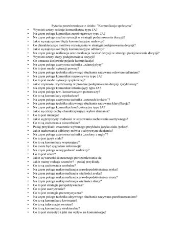 • • • • • • • • • • • • • • • • • • • • • • • • • • • • • • • • • • • • • • • • • • • • • • • • Pytania powtórzeniowe z działu: ”Komunikacja społeczna” Wymień cztery rodzaje komunikatów typu JA? Na czym polega komunikat zapobiegawczy typu JA? Na czym polega analiza sytuacji w strategii podejmowania decyzji? Jakie są najczęstsze błędy komunikacyjne nadawcy? Co charakteryzuje możliwe rozwiązania w strategii podejmowania decyzji? Jakie są najczęstsze błędy komunikacyjne odbiorcy? Na czym polega realizacja oraz ewaluacja /ocena/ decyzji w strategii podejmowania decyzji? Wymień cztery etapy podejmowania decyzji? Co oznacza dosłownie pojęcie komunikacja? Na czym polega asertywna technika „zdartej płyty” Co to jest model sytuacji pewnej? Na czym polega technika aktywnego słuchania nazywana odzwierciedlaniem? Na czym polega komunikat responsywny typu JA? Co to jest model sytuacji ryzykownej? Jakie czynności wyróżniamy w procesie podejmowania decyzji ryzykownej? Na czym polega komunikat informujący typu JA? Na czym polega tzw. konserwatyzm poznawczy? Co to są komunikaty opiekuńcze? Na czym polega asertywna technika „czterech kroków”? Na czym polega technika aktywnego słuchania nazywana klaryfikacją? Na czym polega komunikat konfrontacyjny typu JA? Jakie są cztery cechy charakteryzujące wybór działania? Co to jest intencja? Jakie są przyczyny trudności w stosowaniu zachowania asertywnego? Co to są zachowania niewerbalne? Podaj przykład i znaczenie wybranego przykładu języka ciała /pokaż/. Jakie zachowania odbiorcy mówią o aktywnym słuchaniu? Na czym polega asertywna technika „zasłony z mgły”? Co to jest język ciała? Co to są komunikaty wspierające? Co może być sygnałem informacji? Na czym polega wiarygodność nadawcy? Co to jest szum? Jakie są warunki skutecznego porozumiewania się Jakie mamy rodzaje szumów? – podaj przykłady. Co to są zachowania werbalne? Na czym polega maksymalizacja prawdopodobieństwa zysku? Na czym polega maksymalizacja wielkości zysku? Na czym polega maksymalizacja prawdopodobieństwa straty? Na czym polega maksymalizacja wielkości straty? Co to jest strategia perspektywiczna? Co to jest asertywność? Co to jest strategia prezentystyczna? Na czym polega technika aktywnego słuchania nazywana parafrazowaniem? Co to są komunikaty krytyczne? Co to są informacje zwrotne? Co to są komunikaty strukturalne? Co to jest stereotyp i jaki ma wpływ na komunikację?