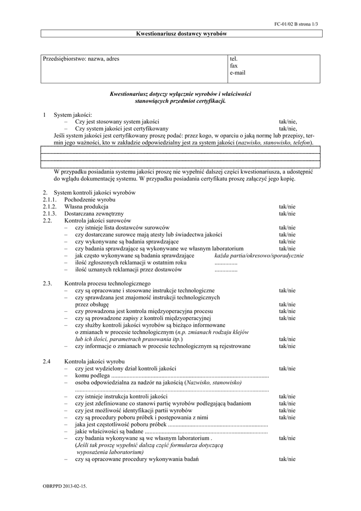 FC-01/02 B strona 1/3 Kwestionariusz dostawcy wyrobów Przedsiębiorstwo: nazwa, adres tel. fax e-mail Kwestionariusz dotyczy wyłącznie wyrobów i właściwości stanowiących przedmiot certyfikacji. 1 System jakości: – Czy jest stosowany system jakości tak/nie, – Czy system jakości jest certyfikowany tak/nie, Jeśli system jakości jest certyfikowany proszę podać: przez kogo, w oparciu o jaką normę lub przepisy, termin jego ważności, kto w zakładzie odpowiedzialny jest za system jakości (nazwisko, stanowisko, telefon). W przypadku posiadania systemu jakości proszę nie wypełnić dalszej części kwestionariusza, a udostępnić do wglądu dokumentację systemu. W przypadku posiadania certyfikatu proszę załączyć jego kopię. 2. System kontroli jakości wyrobów 2.1.1. Pochodzenie wyrobu 2.1.2. Własna produkcja tak/nie 2.1.3. Dostarczana zewnętrzny tak/nie 2.2. Kontrola jakości surowców – czy istnieje lista dostawców surowców tak/nie – czy dostarczane surowce mają atesty lub świadectwa jakości tak/nie – czy wykonywane są badania sprawdzające tak/nie – czy badania sprawdzające są wykonywane we własnym laboratorium tak/nie – jak często wykonywane są badania sprawdzające każda partia/okresowo/sporadycznie – ilość zgłoszonych reklamacji w ostatnim roku ............... – ilość uznanych reklamacji przez dostawców ............... 2.3. 2.4 Kontrola procesu technologicznego – czy są opracowane i stosowane instrukcje technologiczne – czy sprawdzana jest znajomość instrukcji technologicznych przez obsługę – czy prowadzona jest kontrola międzyoperacyjna procesu – czy są prowadzone zapisy z kontroli międzyoperacyjnej – czy służby kontroli jakości wyrobów są bieżąco informowane o zmianach w procesie technologicznym (n.p. zmianach rodzaju klejów lub ich ilości, parametrach prasowania itp.) – czy informacje o zmianach w procesie technologicznym są rejestrowane Kontrola jakości wyrobu – czy jest wydzielony dział kontroli jakości – komu podlega ........................................................................................................ – osoba odpowiedzialna za nadzór na jakością (Nazwisko, stanowisko) ................................................................................................................................ – czy istnieje instrukcja kontroli jakości – czy jest zdefiniowane co stanowi partię wyrobów podlegającą badaniom – czy jest możliwość identyfikacji partii wyrobów – czy są procedury poboru próbek i postępowania z nimi – jaka jest częstotliwość poboru próbek .................................................................. – jakie właściwości są badane ................................................................................. – czy badania wykonywane są we własnym laboratorium . (Jeśli tak proszę wypełnić dalszą część formularza dotyczącą wyposażenia laboratorium) – czy są opracowane procedury wykonywania badań OBRPPD 2013-02-15. tak/nie tak/nie tak/nie tak/nie tak/nie tak/nie tak/nie tak/nie tak/nie tak/nie tak/nie tak/nie tak/nie FC-01/02 B strona 2/3 Kwestionariusz dostawcy wyrobów – – – – – – – – – czy laboratorium uczestniczy w porównawczych badaniach biegłości badanie jakich właściwości jest zlecane na zewnątrz ........................................... jakie laboratorium jest podwykonawcą badań wyrobów....................................... czy wykonywane są okresowa badania wyrobów przez laboratoria niezależne czy są rejestrowane wyniki badań właściwości wyrobów czy w okresie ostatniego roku były reklamacje jakości wyrobów z powodu nie spełniania wymagań przez właściwości przewidziane do certyfikacji ilość reklamacji .................................................................................... liczba reklamacji uwzględnionych ....................................................... udział uwzględnionych reklamacji w stosunku do produkcji % .......... tak/nie tak/nie tak/nie tak/nie Podpis (imię, nazwisko i stanowisko) Dnia .........................................................., OBRPPD 2013-02-15. FC-01/02 B strona 3/3 Kwestionariusz dostawcy wyrobów Wykaz wyposażenia stosowanego przy badaniach wyrobów Wzorcowanie/sprawdzanie L.p. Nazwa, typ przyrządu Oznaczenie Świadectwo Data ważności Podpis (imię, nazwisko i stanowisko) Dnia .................................................... OBRPPD 2013-02-15.