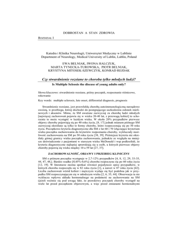DOBROSTAN A STAN ZDROWIA ROZDZIAŁ I Katedra i Klinika Neurologii, Uniwersytet Medyczny w Lublinie Department of Neurology, Medical University of Lublin, Lublin, Poland EWA BELNIAK, IWONA HALCZUK, MARTA TYNECKA-TUROWSKA, PIOTR BELNIAK, KRYSTYNA MITOSEK-SZEWCZYK, KONRAD REJDAK Czy stwardnienie rozsiane to choroba tylko młodych ludzi? Is Multiple Scleosis the disease of young adults only? Słowa kluczowe: stwardnienie rozsiane, późny początek, rozpoznanie różnicowe, rokowanie Key words: multiple sclerosis, late onset, differential diagnosis, prognosis Stwardnienie rozsiane, jest przewlekłą chorobą autoimmunologiczną narządowo swoistą, w przebiegu, której dochodzi do postępującego uszkodzenia osłonek mielinowych i aksonów. Mimo, że SM uważane zazwyczaj za chorobę ludzi młodych [najwięcej zachorowań pojawia się w wieku 20-40 lat, z przewagą kobiet] to schorzenie to może wystąpić w każdym wieku. W około 20% przypadków pierwsze objawy choroby pojawiają się po 40 roku życia, [8, 17] jednak mianem późnego SM zazwyczaj określane są tylko te formy choroby, które rozpoczynają się po 50 roku życia. Początkowo kryteria diagnostyczne dla SM z lat 60 i 70 włączające kryterium wieku początku zachorowania do kryteriów rozpoznania choroby, wykluczały możliwość zachorowania na SM po 50 roku życia [38, 39]. Późniejsze kryteria nie określały górnej granicy wieku początku zachorowania, jednakże ze względu na mniejsze doświadczenie z pacjentami w starszym wieku McDonald i wsp podkreślali, że kryteria diagnostyczne najlepiej sprawdzają się u osób, u których pierwsze objawy choroby pojawią się wieku między 10 a 59 lat [27, 37]. ZACHOROWALNOŚĆ, OBJAWY I PRZEBIEG KLINICZNY SM o późnym początku występuje w 2,7-12% przypadków [4, 8, 12, 29, 33-35, 44, 47, 48,]. Bardzo rzadko [0,45%-0,6%] choroba rozpoczyna się po 60 roku życia [12, 19]. W literaturze można spotkać również pojedyncze opisy przypadków, w których choroba rozpoczęła się w 82 roku życia [1], a nawet w 87 roku życia [42]. Liczba zachorowań wśród kobiet i mężczyzn wydaje się być podobna jak w przypadku SM rozpoczynającym się w młodszym wieku [2, 6, 35, 44]. Obserwacja ta nie wyklucza wpływu układu hormonalnego na podatność na zachorowanie na SM (jeżeli weźmie się pod uwagę fakt, że prawdziwy początek choroby wystąpił na wiele lat przed początkiem objawowym, a więc przed zmianami hormonalnymi DOBROSTAN A STAN ZDROWIA związanym z menopauzą) [29, 49], a może potwierdzać wpływ czynników genetycznych [2] W większości przypadków [60-70% pacjentów] SM o późnym początku rozpoczyna się w sposób momosymptomatyczny jako zaburzenia czynności ruchowych [18, 19, 21, 29, 35, 44]. Jest to zazwyczaj związane z często (47-90%) stwierdzanymi w tej grupie chorych zmianami ogniskowymi w rdzeniu kręgowym [43] Rzadziej występują zaburzenia móżdżkowe, pniowe czy objawy czuciowe. Bardzo rzadko SM u osób starszych rozpoczyna się objawami pozagałkowego zapalenia nerwu wzrokowego [17, 21] Bardzo często (częściej niż w zgodnej wiekowo populacji ogólnej) w grupie chorych z SM o późnym początku występowały zaburzenia depresyjne poprzedzające rozpoznanie SM [30, 35] W 32-83% przypadków SM o późnym początku ma przebieg pierwotnie postępujący [3, 19, 21, 25, 29, 32, 35, 48] i tego typu przebieg choroby występuje częściej u mężczyzn niż u kobiet [21, 47]. W przypadkach, gdy choroba ma przebieg z rzutami i remisjami, odstęp czasu miedzy kolejnymi rzutami jest krótki, po rzutach zazwyczaj pozostają wyraźne objawy ubytkowe, szybko również dochodzi do przejścia choroby w fazę wtórnie postępującą.[11] Wszystkie te obserwacje sugerują przewagę aksonalnego procesu zwyrodnieniowego nad mniej wyraźnym i agresywnym procesem zapalnym. Częstsze występowanie przebiegu pierwotnie postępującego u chorych z SM o późnym początku może mieć związek ze starzeniem się mózgu i układu immunologicznego połączonego ze zmianą ekspresji genów, zaburzeniami aktywności komórek T oraz z zaburzeniami rekrutacji prekursorów oligodendrocytow z następowym różnicowaniem do oligodendrocytów odpowiedzialnych za remielinizację a co za tym idzie ograniczeniem procesów efektywnej remielinizacji [16, 24, 28, 29, 40, 41] W/w zaburzenia mogą być odpowiedzialne również za szybszą progresję niepełnosprawności u chorych z SM o późnym początku. ROKOWANIE I CZYNNIKI PROGNOSTYCZNE Wyniki badan epidemiologicznych, oraz liczne opisy przypadków sugerują, że SM o późnym początku jest związany ze złym rokowaniem, co z kolei powiązane jest z szybszą progresją nieodwracalnej niesprawności, wyższymi współczynnikami progresji (zmiana EDSS w ciągu roku) i krótszym czasem między EDSS 4 i 6; rzadziej również występuje tzw „łagodny” SM, niż obserwowane jest to u pacjentów, u których choroba rozpoczyna się w młodszym wieku [3, 5, 6, 12, 23, 29, 44, 45, 46, 47, 48] Tylko nieliczne badania opisują, że współczynniki deterioracji funkcji ruchowych u pacjentów z SM rozpoczynającym się po 60 roku życia są podobne do tego obserwowanego u pacjentów, u których choroba rozpoczęła się wcześniej [19, 48]. Bauer i wsp. podkreślają natomiast wręcz stosunkowo łagodny przebieg choroby u większości chorych z SM o późnym początku [4]. Mimo że Tremlett i wsp. zaobserwowali dodatnią korelację pomiędzy progresją choroby a wiekiem zachorowania to rokowanie nie różniło się w sposób znaczący. Z lepszym rokowaniem związane było występowanie objawów czuciowych, natomiast gorsze rokowanie wykazano u pacjentów z pierwotnie postępującą postacią choroby [44] 12 Ewa Belniak, Iwona Halczuk, Marta Tynecka-Turowska, Piotr Belniak, Krystyna Mitosek-Szewczyk, Konrad Rejdak Czy stwardnienie rozsiane to choroba tylko młodych ludzi? Zaobserwowano związek między wiekiem zachorowania i średnim EDSS; wy