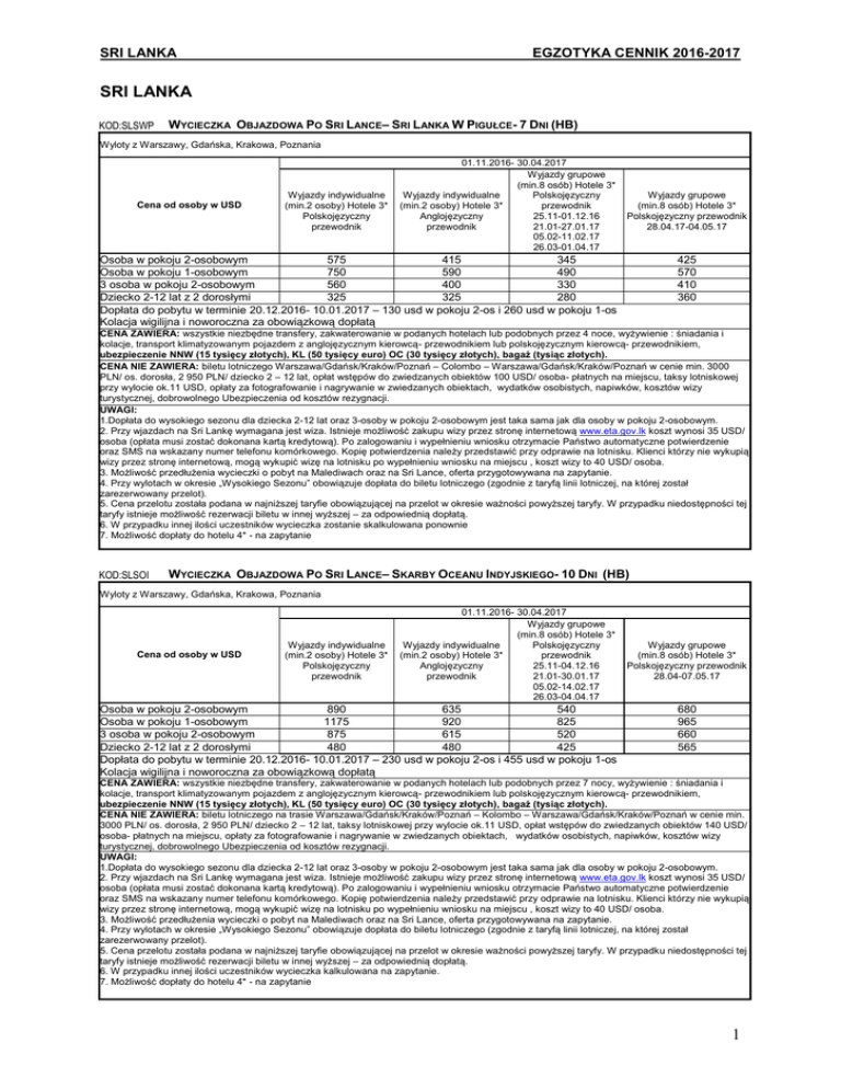 SRI LANKA EGZOTYKA CENNIK 2016-2017 SRI LANKA KOD:SLSWP WYCIECZKA OBJAZDOWA PO SRI LANCE– SRI LANKA W PIGUŁCE- 7 DNI (HB) Wyloty z Warszawy, Gdańska, Krakowa, Poznania Cena od osoby w USD Wyjazdy indywidualne (min.2 osoby) Hotele 3* Polskojęzyczny przewodnik 01.11.2016- 30.04.2017 Wyjazdy grupowe (min.8 osób) Hotele 3* Wyjazdy indywidualne Polskojęzyczny (min.2 osoby) Hotele 3* przewodnik Anglojęzyczny 25.11-01.12.16 przewodnik 21.01-27.01.17 05.02-11.02.17 26.03-01.04.17 Wyjazdy grupowe (min.8 osób) Hotele 3* Polskojęzyczny przewodnik 28.04.17-04.05.17 Osoba w pokoju 2-osobowym 575 415 345 Osoba w pokoju 1-osobowym 750 590 490 3 osoba w pokoju 2-osobowym 560 400 330 Dziecko 2-12 lat z 2 dorosłymi 325 325 280 Dopłata do pobytu w terminie 20.12.2016- 10.01.2017 – 130 usd w pokoju 2-os i 260 usd w pokoju 1-os Kolacja wigilijna i noworoczna za obowiązkową dopłatą 425 570 410 360 CENA ZAWIERA: wszystkie niezbędne transfery, zakwaterowanie w podanych hotelach lub podobnych przez 4 noce, wyżywienie : śniadania i kolacje, transport klimatyzowanym pojazdem z anglojęzycznym kierowcą- przewodnikiem lub polskojęzycznym kierowcą- przewodnikiem, ubezpieczenie NNW (15 tysięcy złotych), KL (50 tysięcy euro) OC (30 tysięcy złotych), bagaż (tysiąc złotych). CENA NIE ZAWIERA: biletu lotniczego Warszawa/Gdańsk/Kraków/Poznań – Colombo – Warszawa/Gdańsk/Kraków/Poznań w cenie min. 3000 PLN/ os. dorosła, 2 950 PLN/ dziecko 2 – 12 lat, opłat wstępów do zwiedzanych obiektów 100 USD/ osoba- płatnych na miejscu, taksy lotniskowej przy wylocie ok.11 USD, opłaty za fotografowanie i nagrywanie w zwiedzanych obiektach, wydatków osobistych, napiwków, kosztów wizy turystycznej, dobrowolnego Ubezpieczenia od kosztów rezygnacji. UWAGI: 1.Dopłata do wysokiego sezonu dla dziecka 2-12 lat oraz 3-osoby w pokoju 2-osobowym jest taka sama jak dla osoby w pokoju 2-osobowym. 2. Przy wjazdach na Sri Lankę wymagana jest wiza. Istnieje możliwość zakupu wizy przez stronę internetową www.eta.gov.lk koszt wynosi 35 USD/ osoba (opłata musi zostać dokonana kartą kredytową). Po zalogowaniu i wypełnieniu wniosku otrzymacie Państwo automatyczne potwierdzenie oraz SMS na wskazany numer telefonu komórkowego. Kopię potwierdzenia należy przedstawić przy odprawie na lotnisku. Klienci którzy nie wykupią wizy przez stronę internetową, mogą wykupić wizę na lotnisku po wypełnieniu wniosku na miejscu , koszt wizy to 40 USD/ osoba. 3. Możliwość przedłużenia wycieczki o pobyt na Malediwach oraz na Sri Lance, oferta przygotowywana na zapytanie. 4. Przy wylotach w okresie „Wysokiego Sezonu” obowiązuje dopłata do biletu lotniczego (zgodnie z taryfą linii lotniczej, na której został zarezerwowany przelot). 5. Cena przelotu została podana w najniższej taryfie obowiązującej na przelot w okresie ważności powyższej taryfy. W przypadku niedostępności tej taryfy istnieje możliwość rezerwacji biletu w innej wyższej – za odpowiednią dopłatą. 6. W przypadku innej ilości uczestników wycieczka zostanie skalkulowana ponownie 7. Możliwość dopłaty do hotelu 4* - na zapytanie KOD:SLSOI WYCIECZKA OBJAZDOWA PO SRI LANCE– SKARBY OCEANU INDYJSKIEGO- 10 DNI (HB) Wyloty z Warszawy, Gdańska, Krakowa, Poznania Cena od osoby w USD Wyjazdy indywidualne (min.2 osoby) Hotele 3* Polskojęzyczny przewodnik 01.11.2016- 30.04.2017 Wyjazdy grupowe (min.8 osób) Hotele 3* Wyjazdy indywidualne Polskojęzyczny (min.2 osoby) Hotele 3* przewodnik Anglojęzyczny 25.11-04.12.16 przewodnik 21.01-30.01.17 05.02-14.02.17 26.03-04.04.17 Osoba w pokoju 2-osobowym 890 635 540 Osoba w pokoju 1-osobowym 1175 920 825 3 osoba w pokoju 2-osobowym 875 615 520 Dziecko 2-12 lat z 2 dorosłymi 480 480 425 Dopłata do pobytu w terminie 20.12.2016- 10.01.2017 – 230 usd w pokoju 2-os i 455 usd w pokoju 1-os Kolacja wigilijna i noworoczna za obowiązkową dopłatą Wyjazdy grupowe (min.8 osób) Hotele 3* Polskojęzyczny przewodnik 28.04-07.05.17 680 965 660 565 CENA ZAWIERA: wszystkie niezbędne transfery, zakwaterowanie w podanych hotelach lub podobnych przez 7 nocy, wyżywienie : śniadania i kolacje, transport klimatyzowanym pojazdem z anglojęzycznym kierowcą- przewodnikiem lub polskojęzycznym kierowcą- przewodnikiem, ubezpieczenie NNW (15 tysięcy złotych), KL (50 tysięcy euro) OC (30 tysięcy złotych), bagaż (tysiąc złotych). CENA NIE ZAWIERA: biletu lotniczego na trasie Warszawa/Gdańsk/Kraków/Poznań – Kolombo – Warszawa/Gdańsk/Kraków/Poznań w cenie min. 3000 PLN/ os. dorosła, 2 950 PLN/ dziecko 2 – 12 lat, taksy lotniskowej przy wylocie ok.11 USD, opłat wstępów do zwiedzanych obiektów 140 USD/ osoba- płatnych na miejscu, opłaty za fotografowanie i nagrywanie w zwiedzanych obiektach, wydatków osobistych, napiwków, kosztów wizy turystycznej, dobrowolnego Ubezpieczenia od kosztów rezygnacji. UWAGI: 1.Dopłata do wysokiego sezonu dla dziecka 2-12 lat oraz 3-osoby w pokoju 2-osobowym jest taka sama jak dla osoby w pokoju 2-osobowym. 2. Przy wjazdach na Sri Lankę wymagana jest wiza. Istnieje możliwość zakupu wizy przez stronę internetową www.eta.gov.lk koszt wynosi 35 USD/ osoba (opłata musi zostać dokonana kartą kredytową). Po zalogowaniu i wypełnieniu wniosku otrzymacie Państwo automatyczne potwierdzenie oraz SMS na wskazany numer telefonu komórkowego. Kopię potwierdzenia należy przedstawić przy odprawie na lotnisku. Klienci którzy nie wykupią wizy przez stronę internetową, mogą wykupić wizę na lotnisku po wypełnieniu wniosku na miejscu , koszt wizy to 40 USD/ osoba. 3. Możliwość przedłużenia wycieczki o pobyt na Malediwach oraz na Sri Lance, oferta przygotowywana na zapytanie. 4. Przy wylotach w okresie „Wysokiego Sezonu” obowiązuje dopłata do biletu lotniczego (zgodnie z taryfą linii lotniczej, na której został zarezerwowany przelot). 5. Cena przelotu została podana w najniższej taryfie obowiązującej na przelot w 
